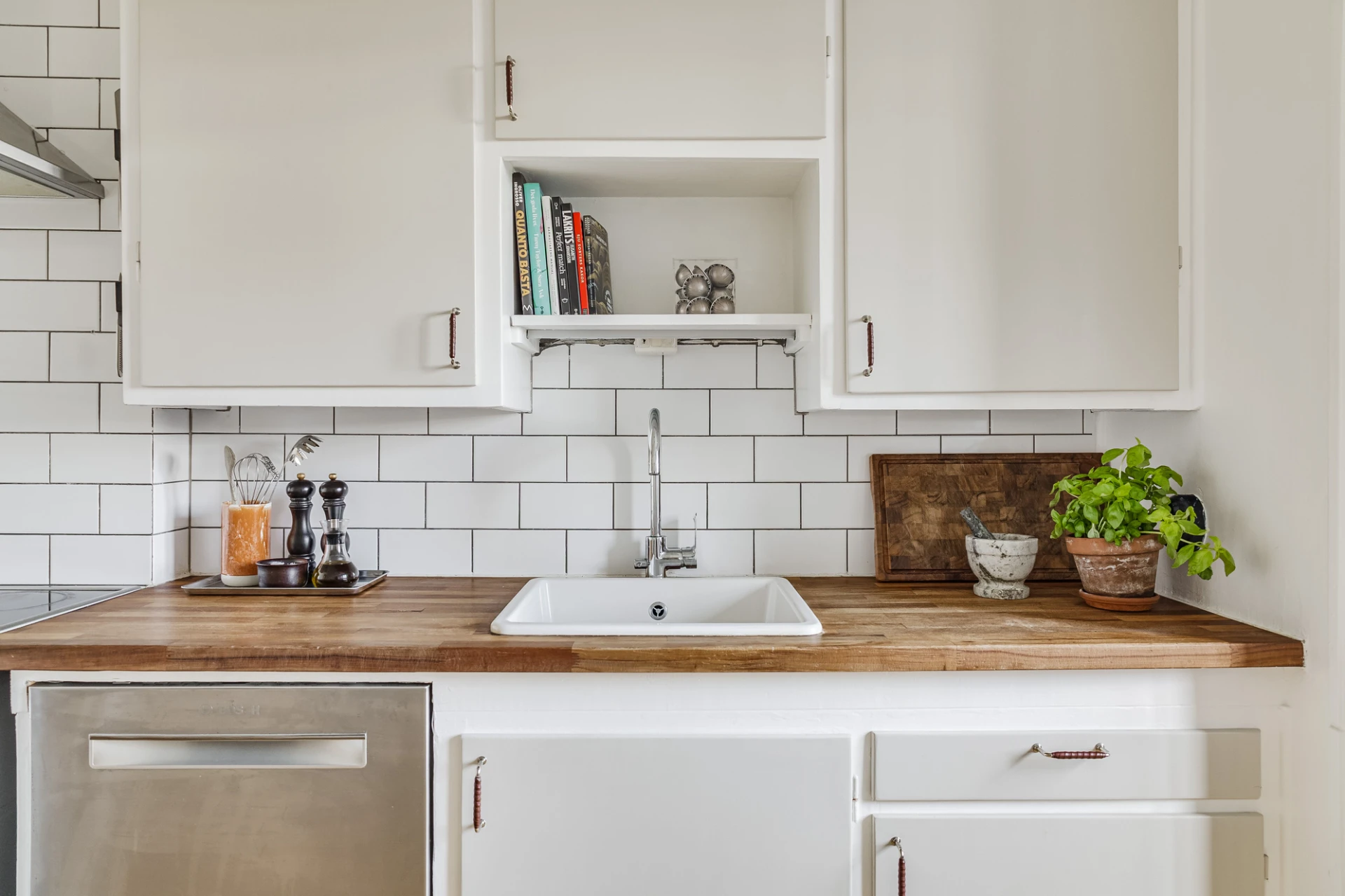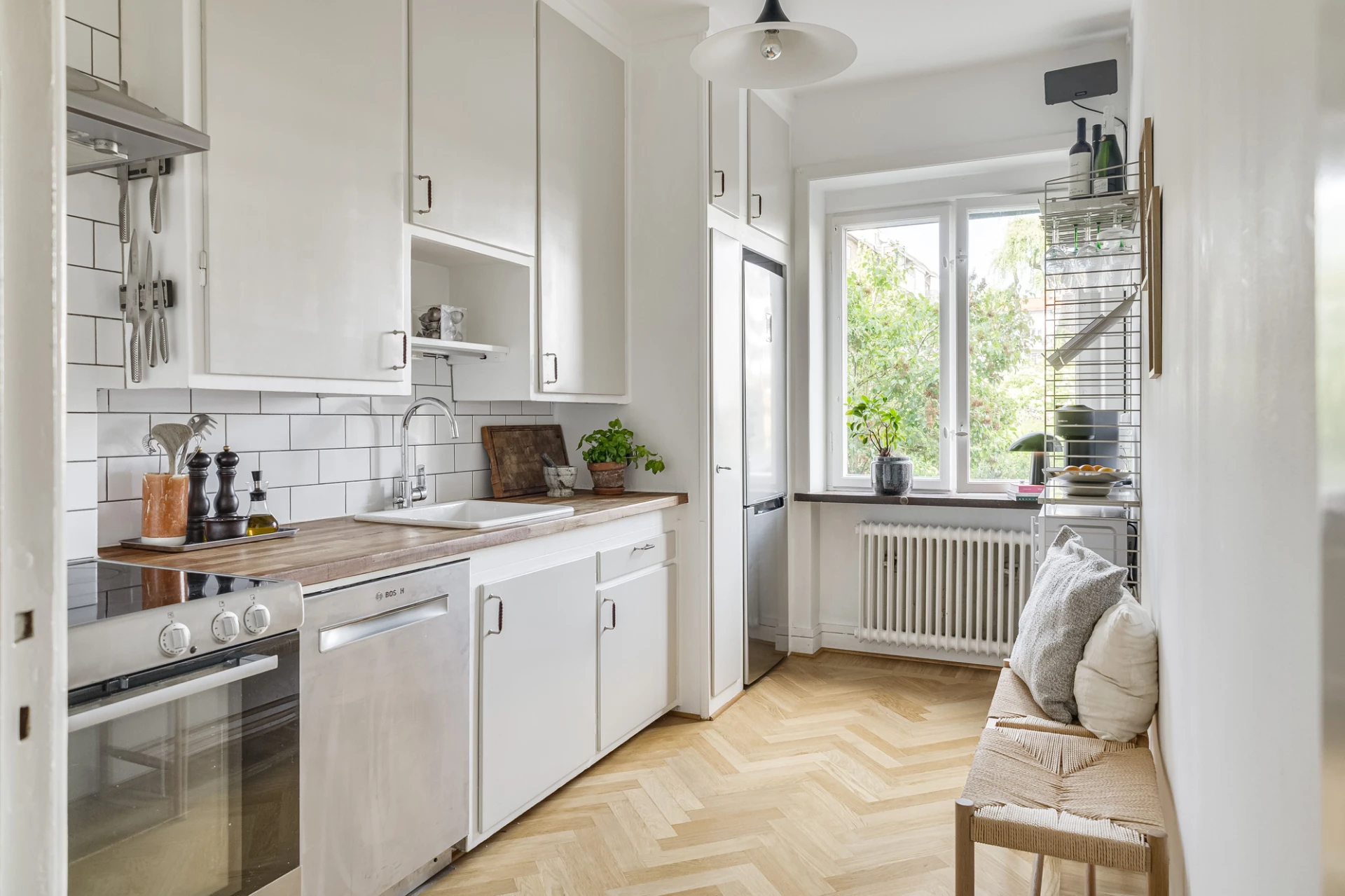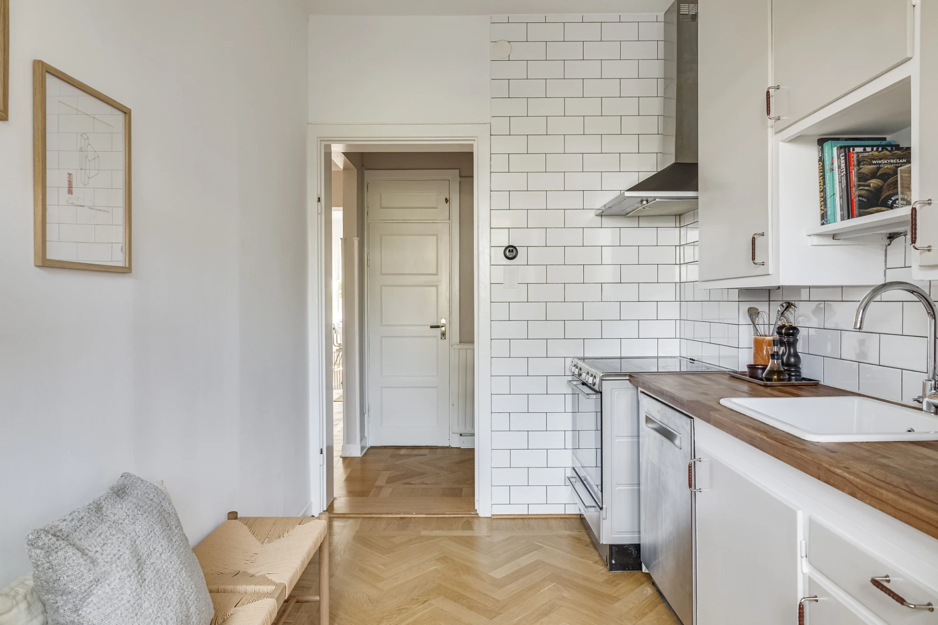 Fiskbensparkett och vita väggar. Köksinredning i original med beigemålade luckor, vitt kakel och bänkskiva i trä. Utrustat med kyl/frys, spis med glaskeramikhäll och ugn, fläkt och diskmaskin.
