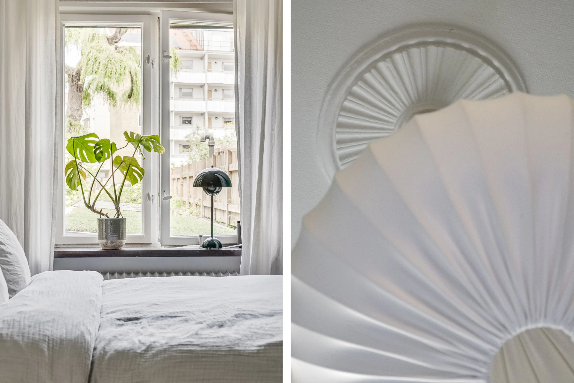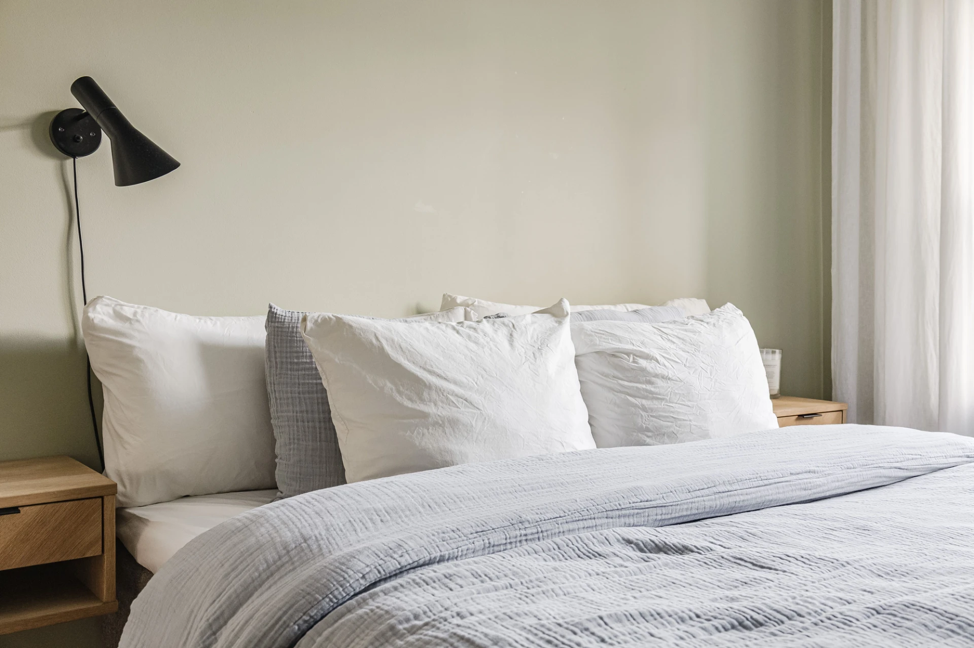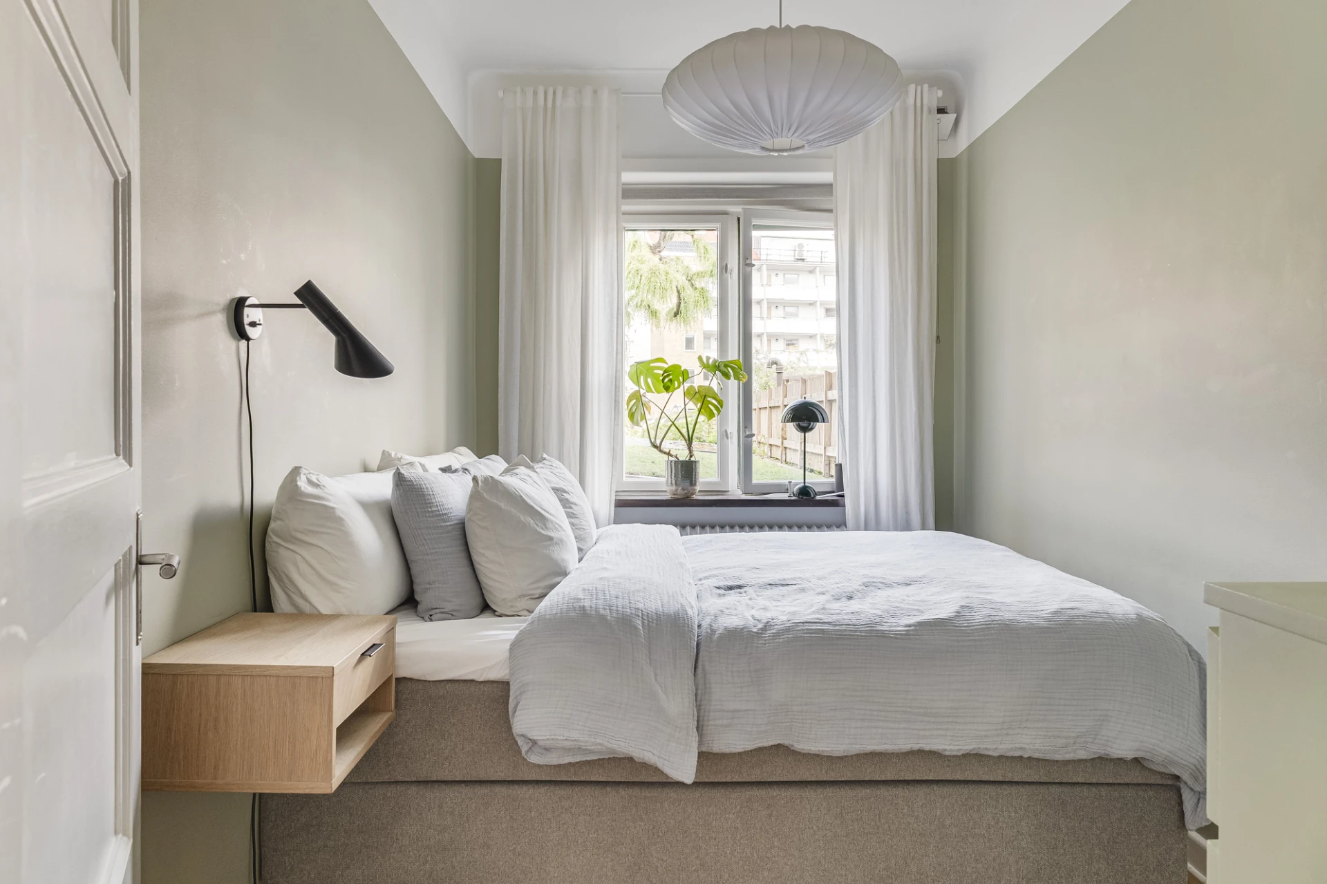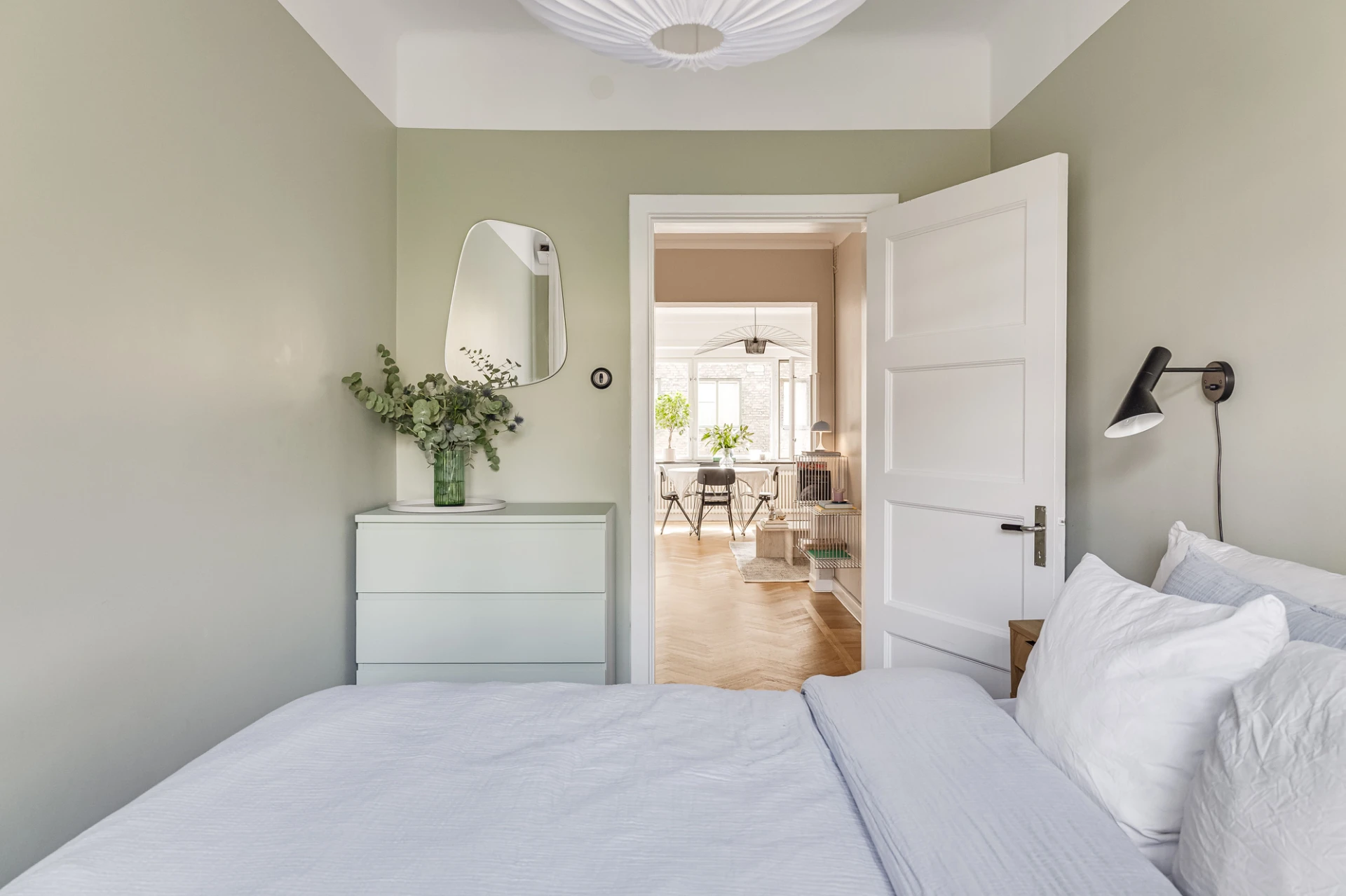 Parkettgolv (limhamnsparkett) och gröna väggar. Lamprosett. Plats för dubbelsäng. Förvaring i byrå.