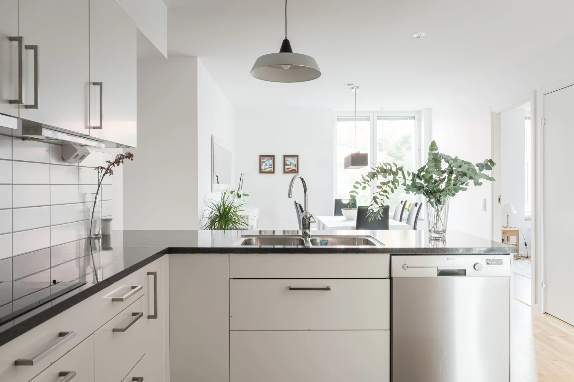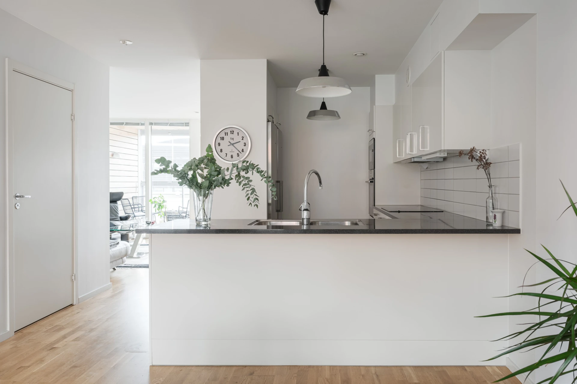 Ekparkett och vita väggar. Köksinredning från HTH med släta vita luckor, vitt kakel och bänkskiva i stenmönstrad laminat. Köket är utrustat med kyl/frys, induktionshäll, fläkt, inbyggd ugn och inbyggd mikrovågsugn samt integrerad diskmaskin. Samtliga vitvaror är från Siemens. Köket ligger i öppen planlösning med köksö mot vardagsrummet.