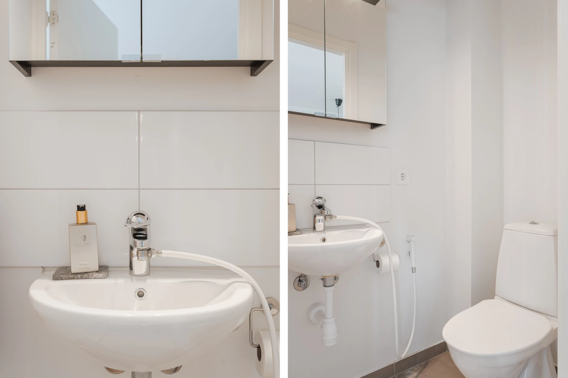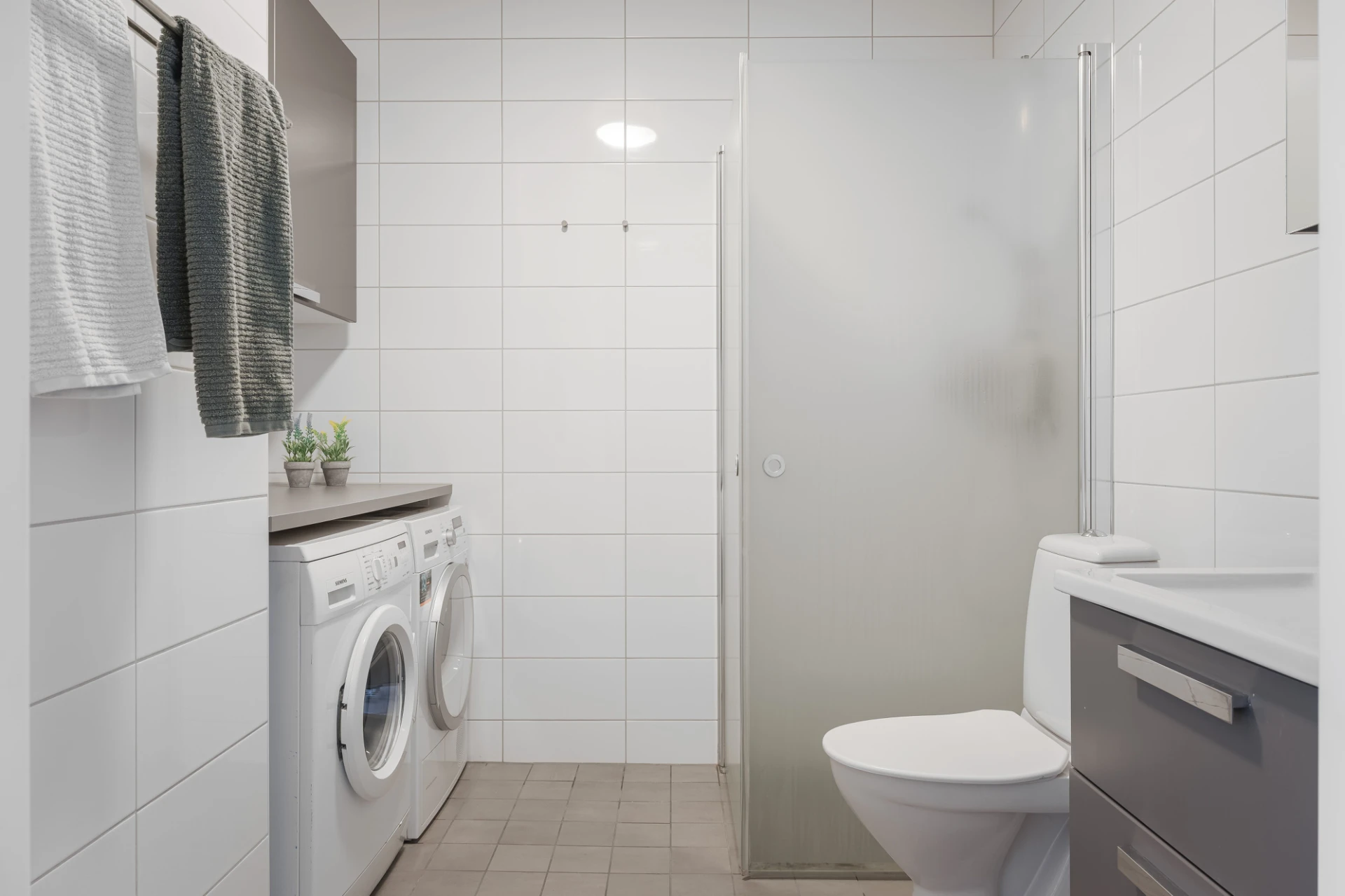 Mörkgrå klinker och vitt kakel. Badrummet är utrustat med wc, dusch med vikbara duschväggar i frostat glas, handfat med mörk kommod och spegelskåp med belysning. Här finns även tvättmaskin (Siemens) och torktumlare (Siemens) med arbetsbänk i mörk laminat samt väggskåp ovan.
