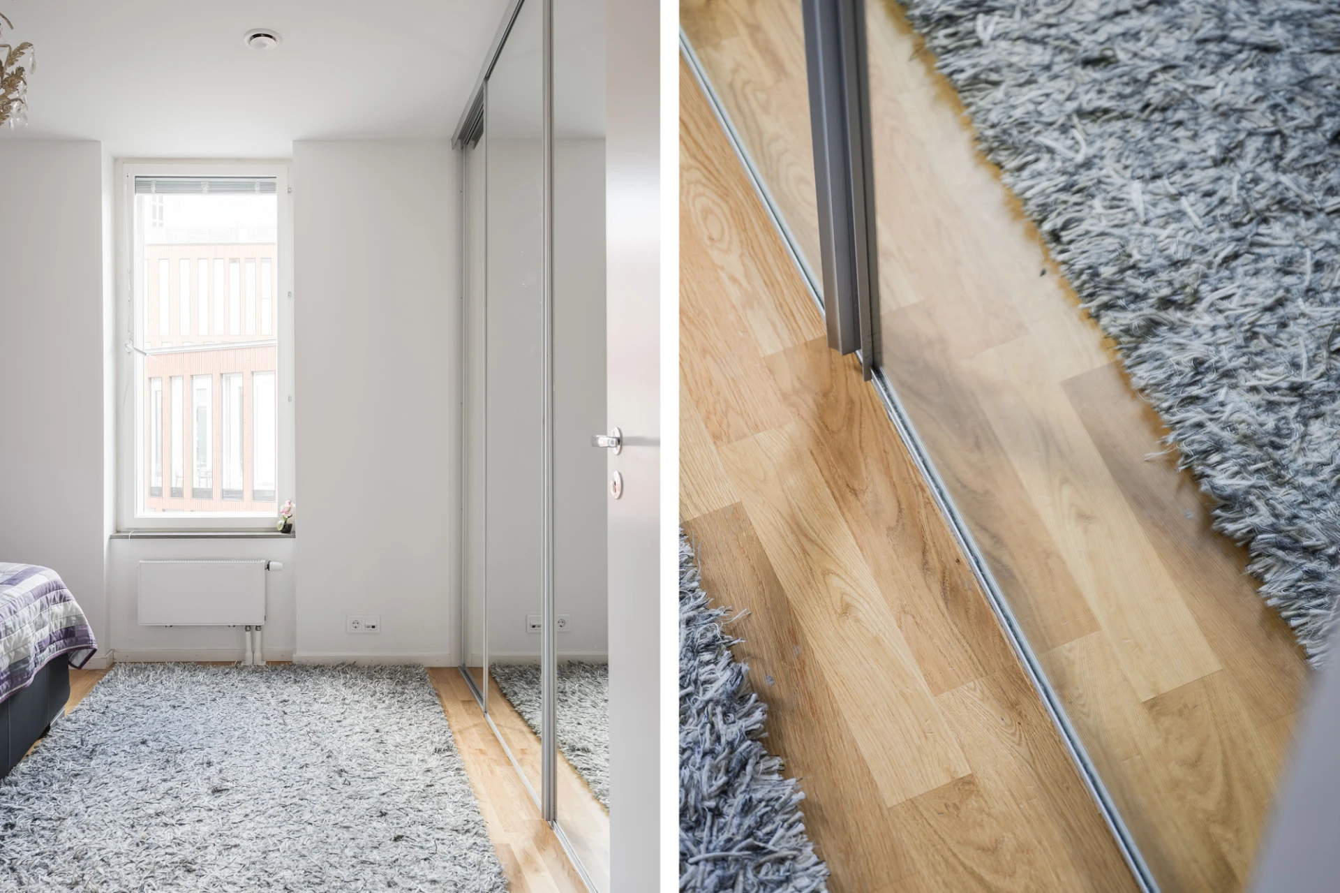 Ekparkett och vita väggar. Bostadens master bedroom med morgonsol och gott om förvaring bakom skjutdörrar.