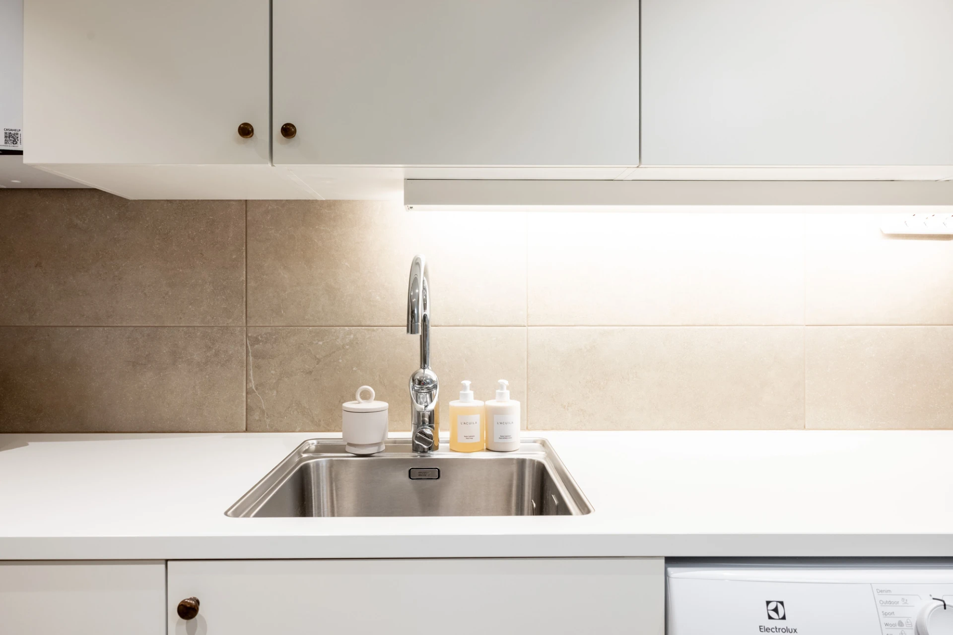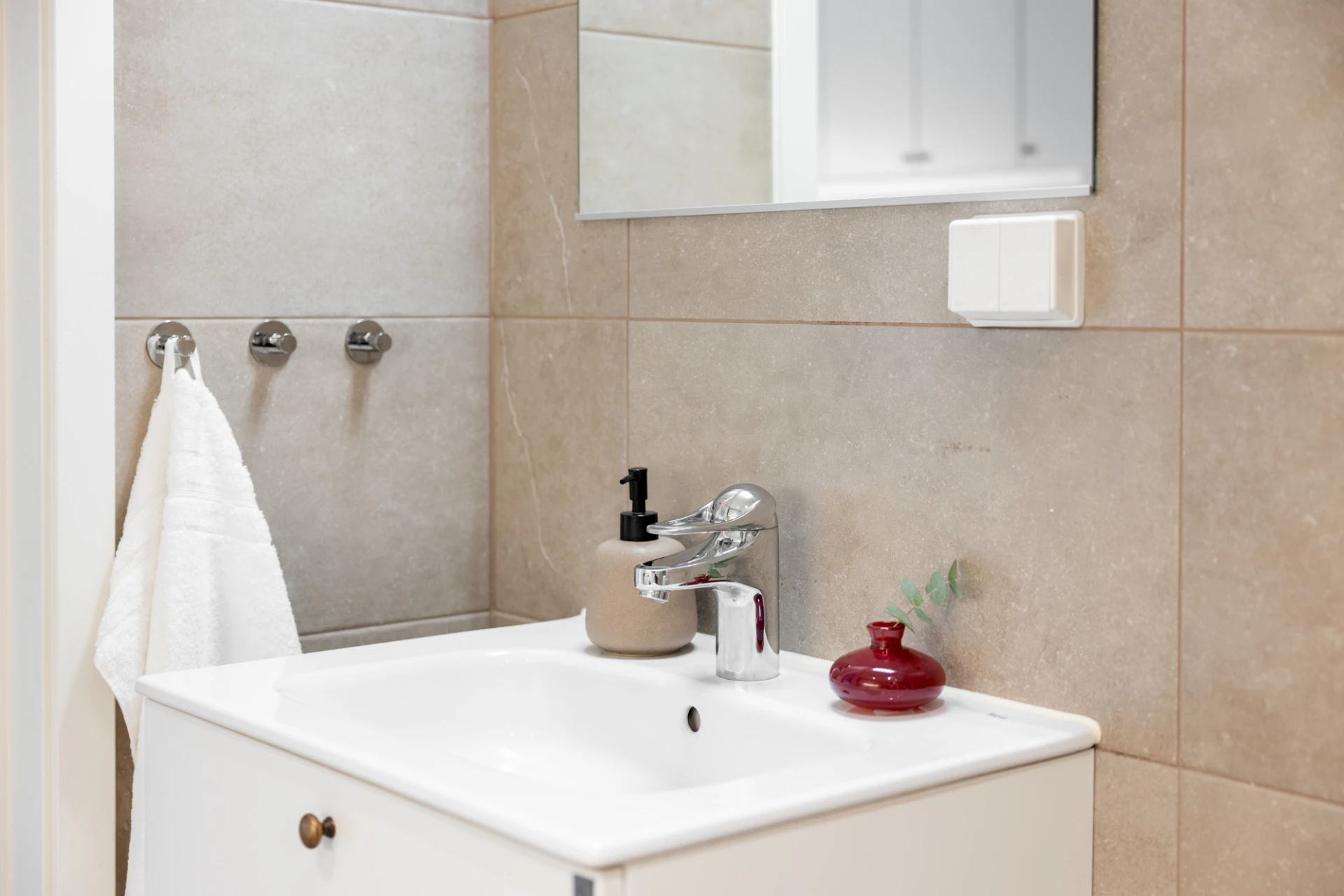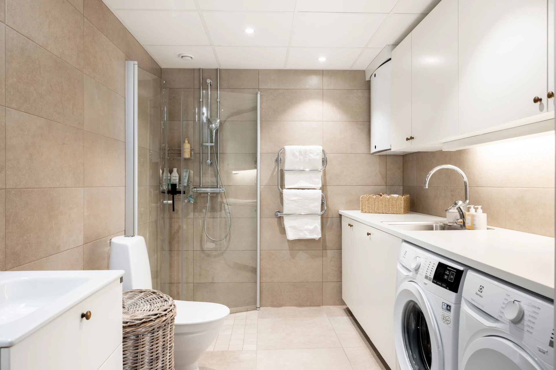 Helkaklat badrum med beige/brun klinker. Badrummet är utrustat med golvvärme, duschhörna, toalett, spegel, handdukstork och handfat med kommod. Här finns även tvättmaskin och torktumlare samt avlastningsbänk i laminat med underlimmad diskho i samt mycket förvaring.