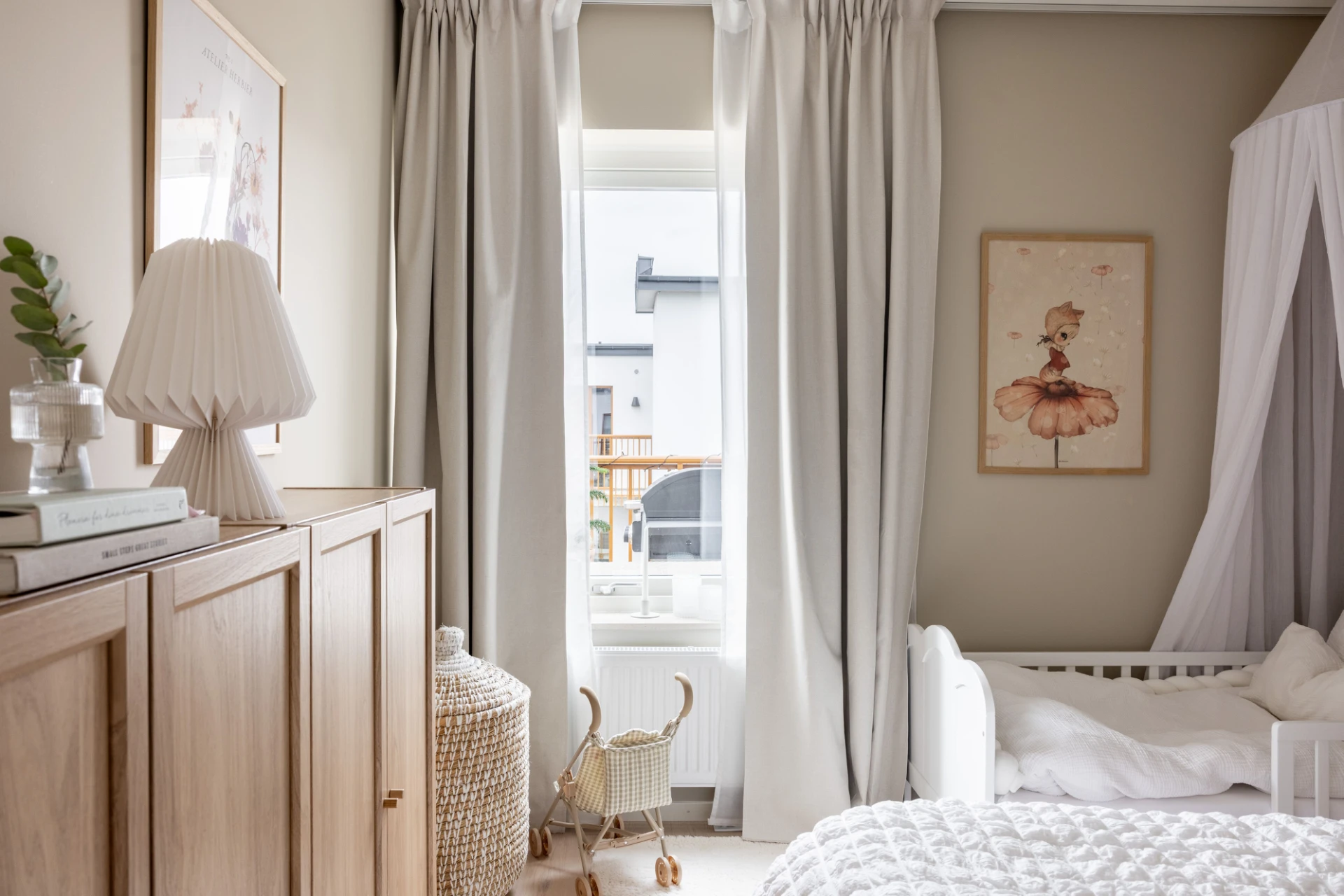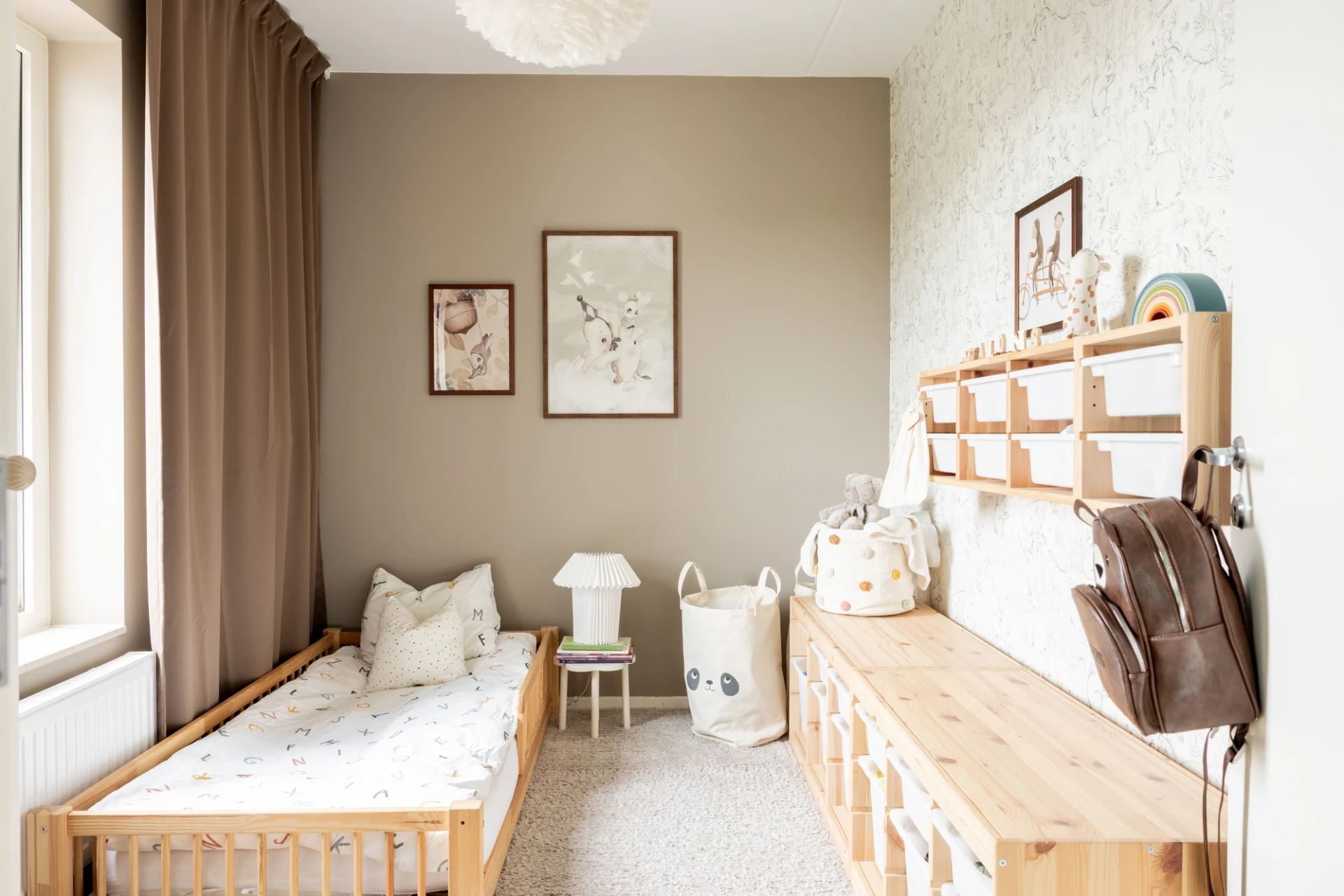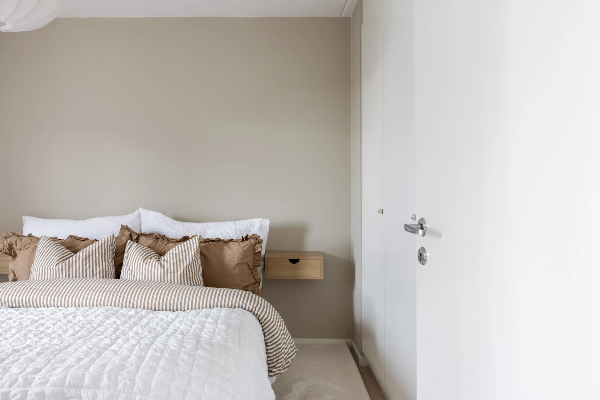 Bjelin härdad Ek enstav och beige väggfärg. Med garderob för förvaring.