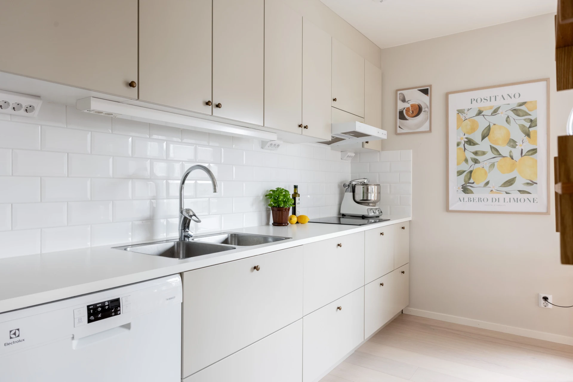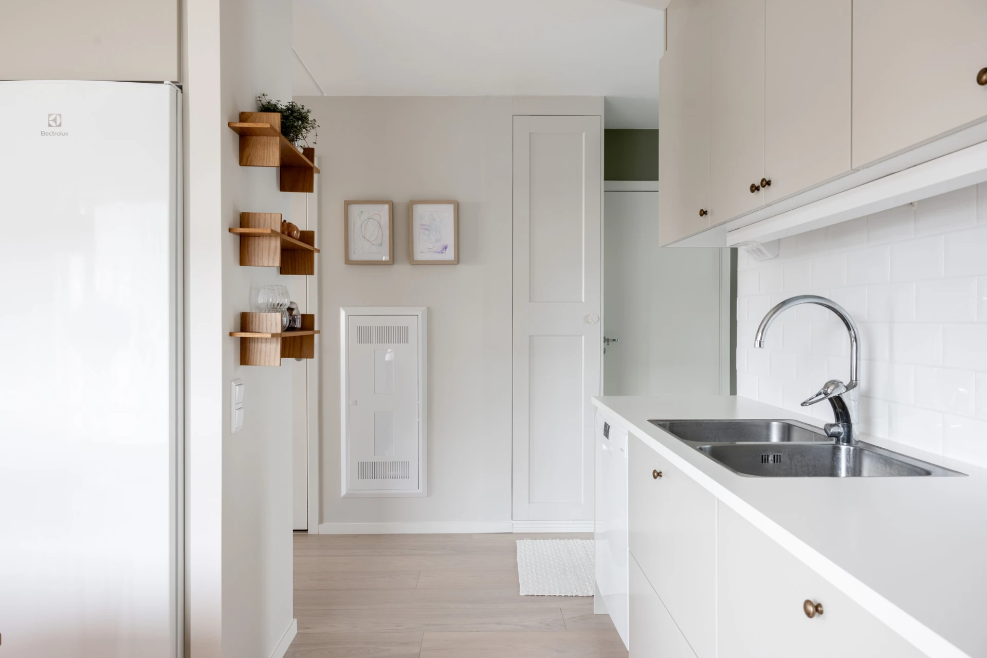 Bjelin härdad Ek enstav och beige väggfärg. Köket är från Ballingslöv med beiga luckor och vita kakelplattor ovan bänkskiva. Köket är utrustad med fläkt, ugn, micro, spishäll och kyl/frys, samt diskmaskin. Plats för ett matbord för 6 personer i öppen planlösning mot vardagsrummet.
