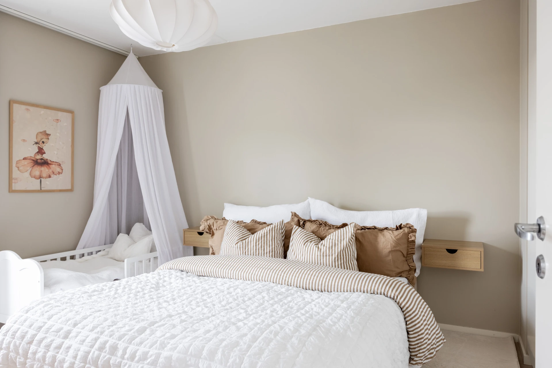 Bjelin härdad Ek enstav och bruna väggar med fondvägg i tapet. Med flera garderober för förvaring.