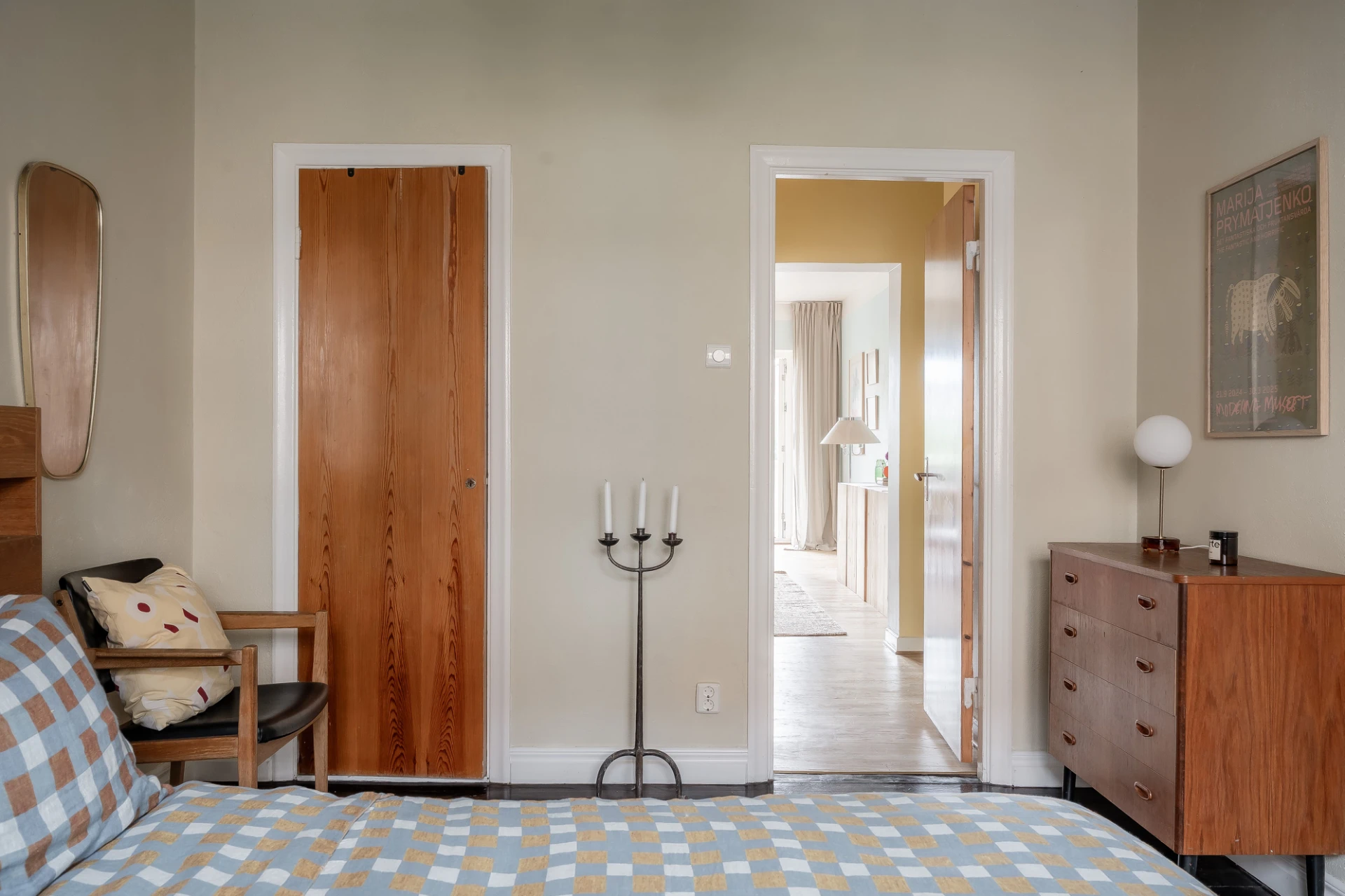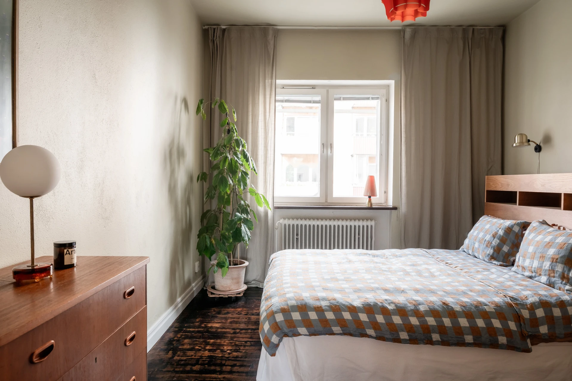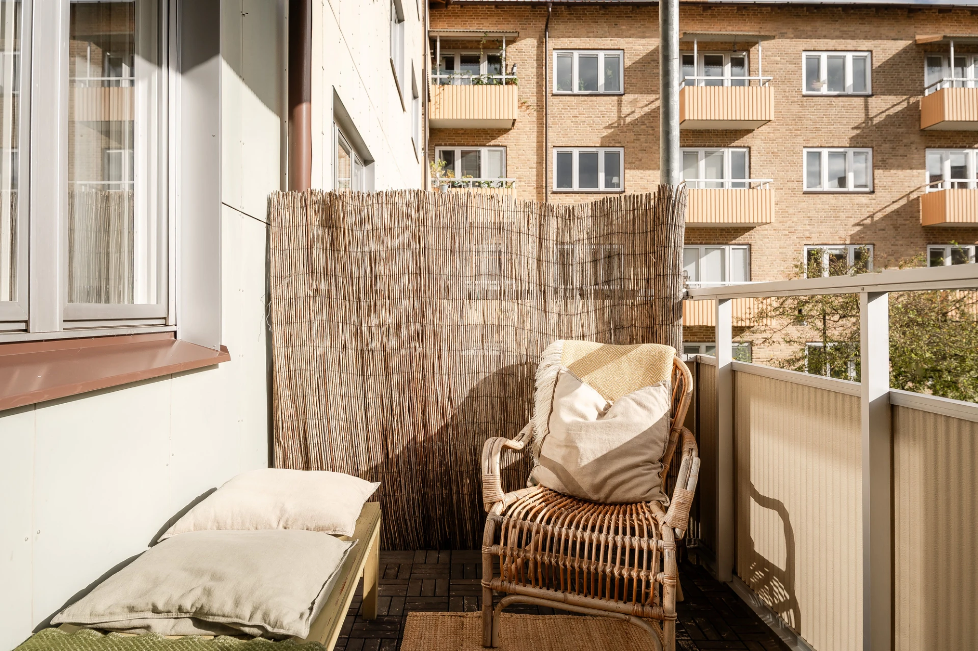 Lägenheten erbjuder lättmöblerade rum med en interiör i varma toner som skapar en ombonads känsla. Vardagsrummet är rymligt med gott om plats för både soffa och matbord och härifrån nås balkongen med fri utblick över föreningens grönskande innergård. En perfekt plats för avkoppling och sociala stunder.