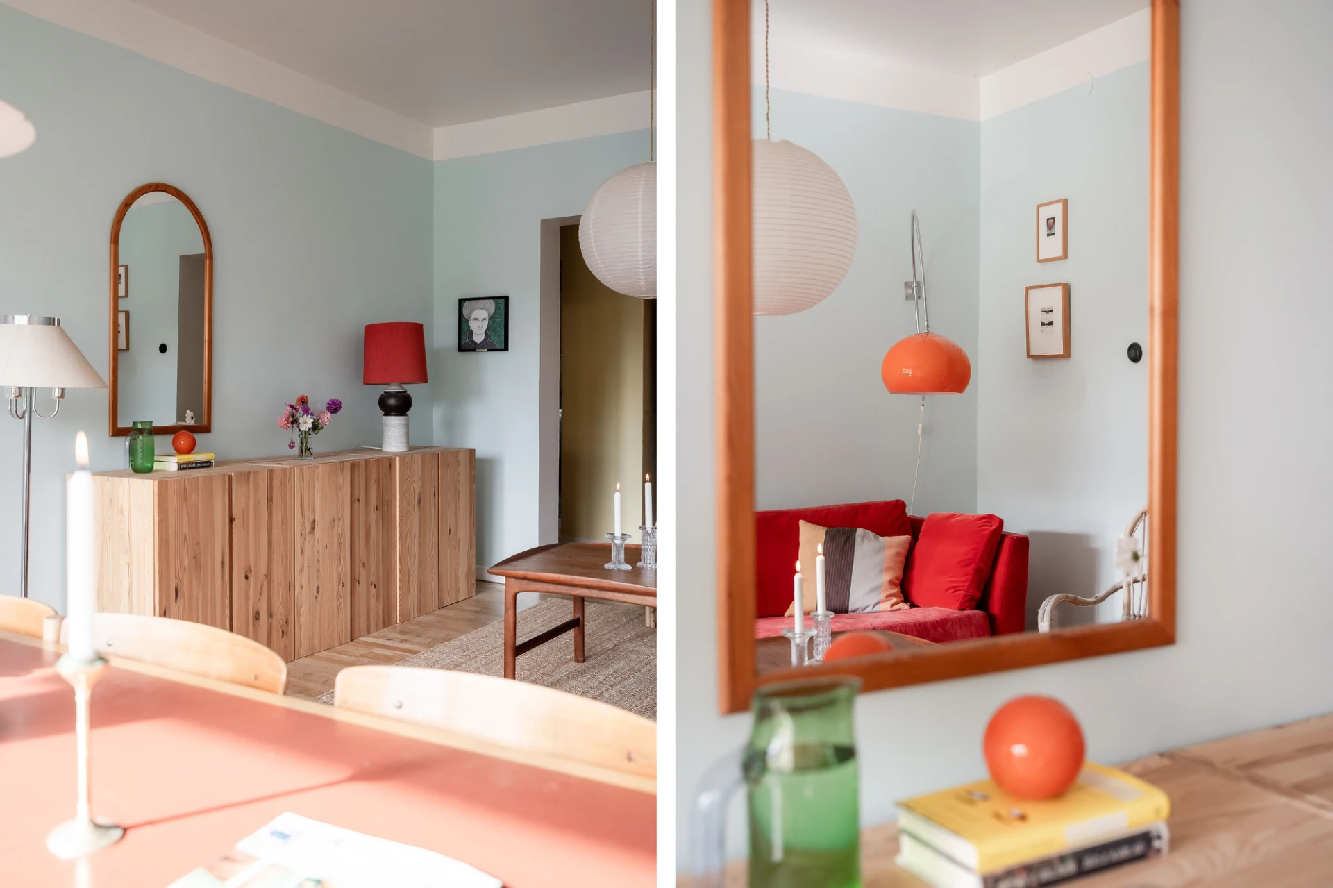 Parkettgolv och ljust blåa väggar. Plats för soffa och matbord. Utgång till balkong.