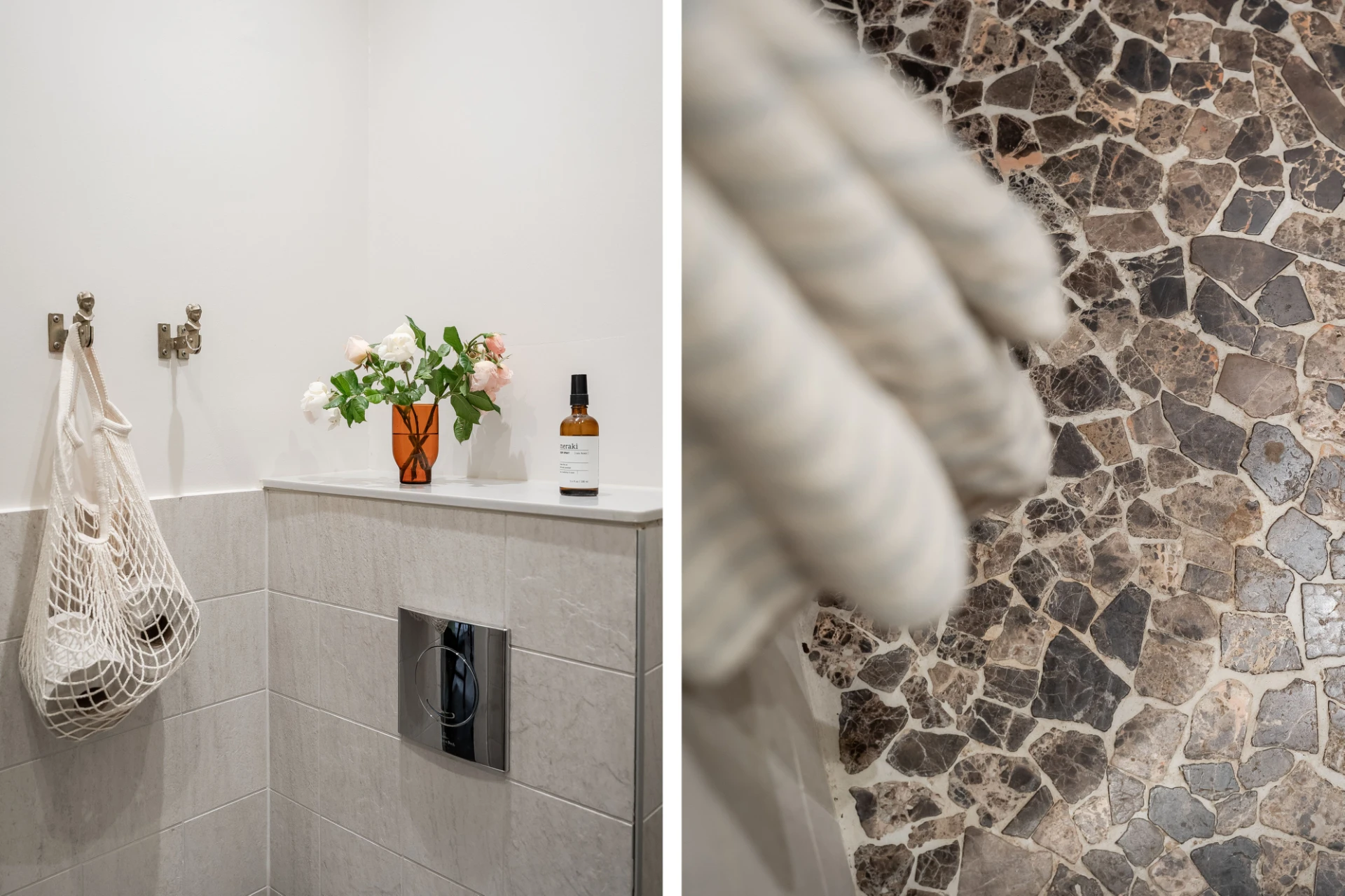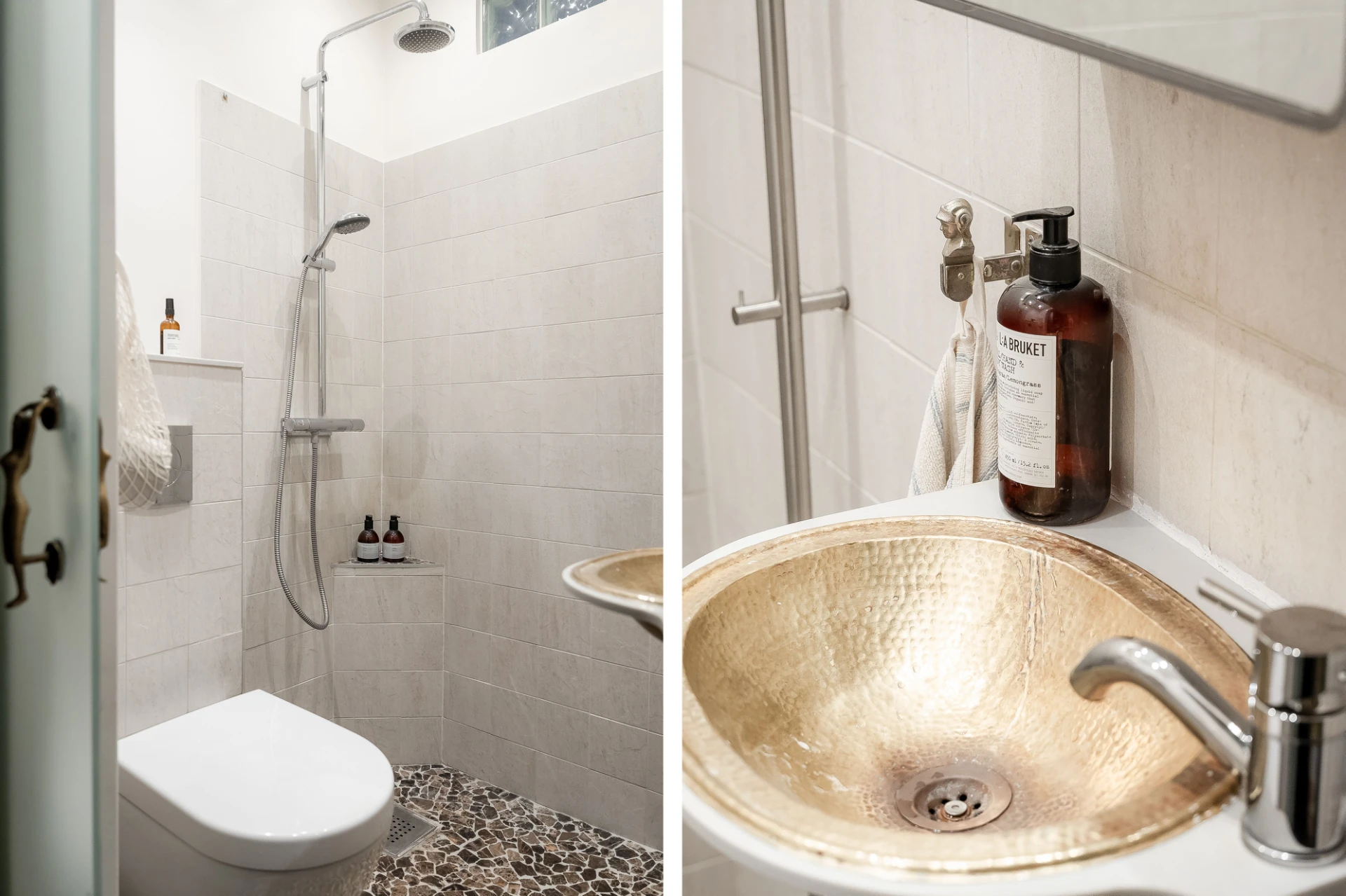 Stenmosaik på golvet och kaklade samt målade ljusa väggar. Badrummet är utrustat med takdusch, vägghängd WC, handfat och handdukstork. Golvvärme och dimbara spotlights i tak.