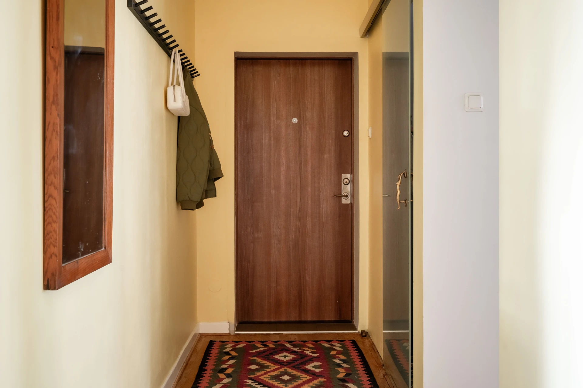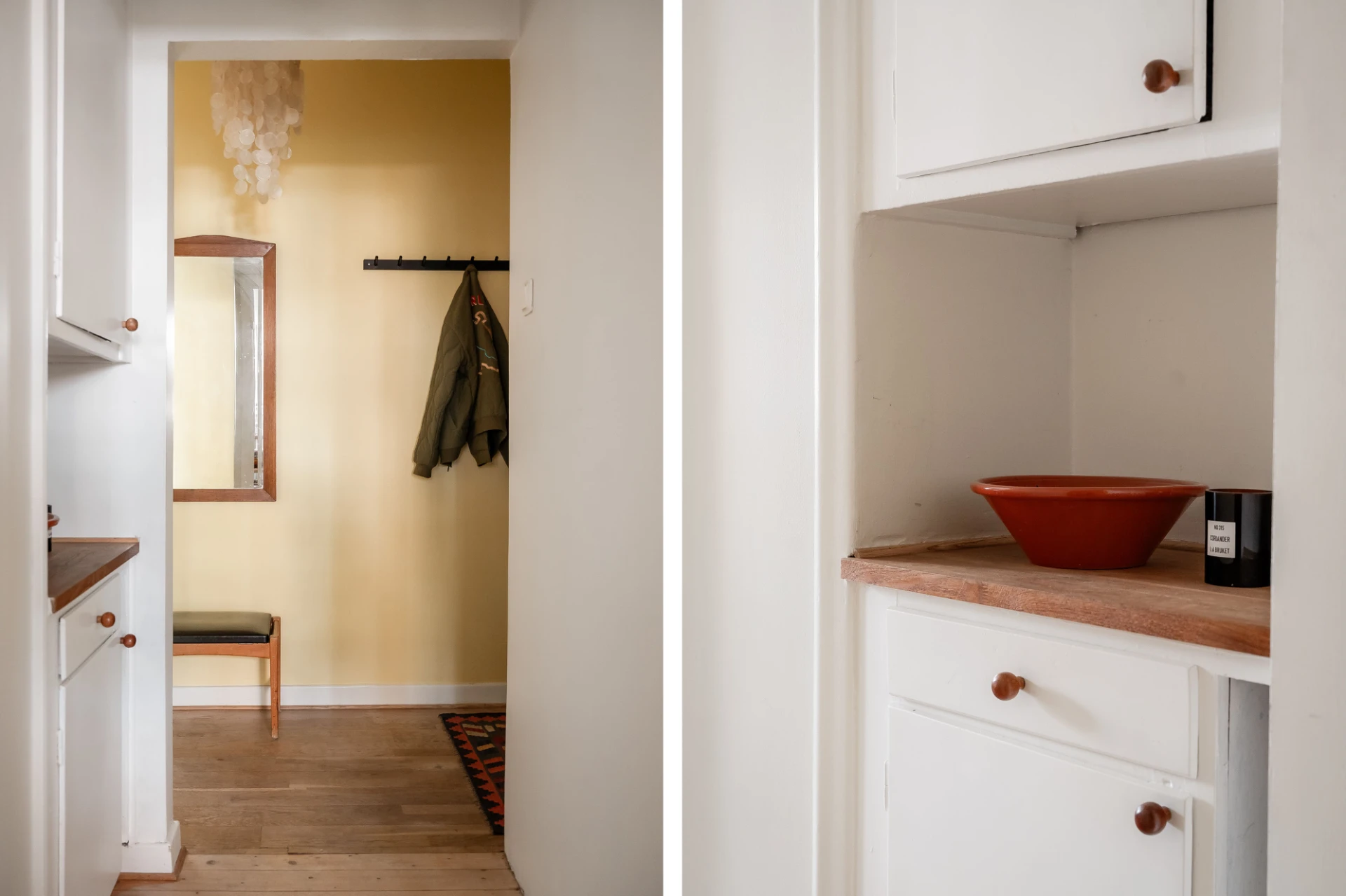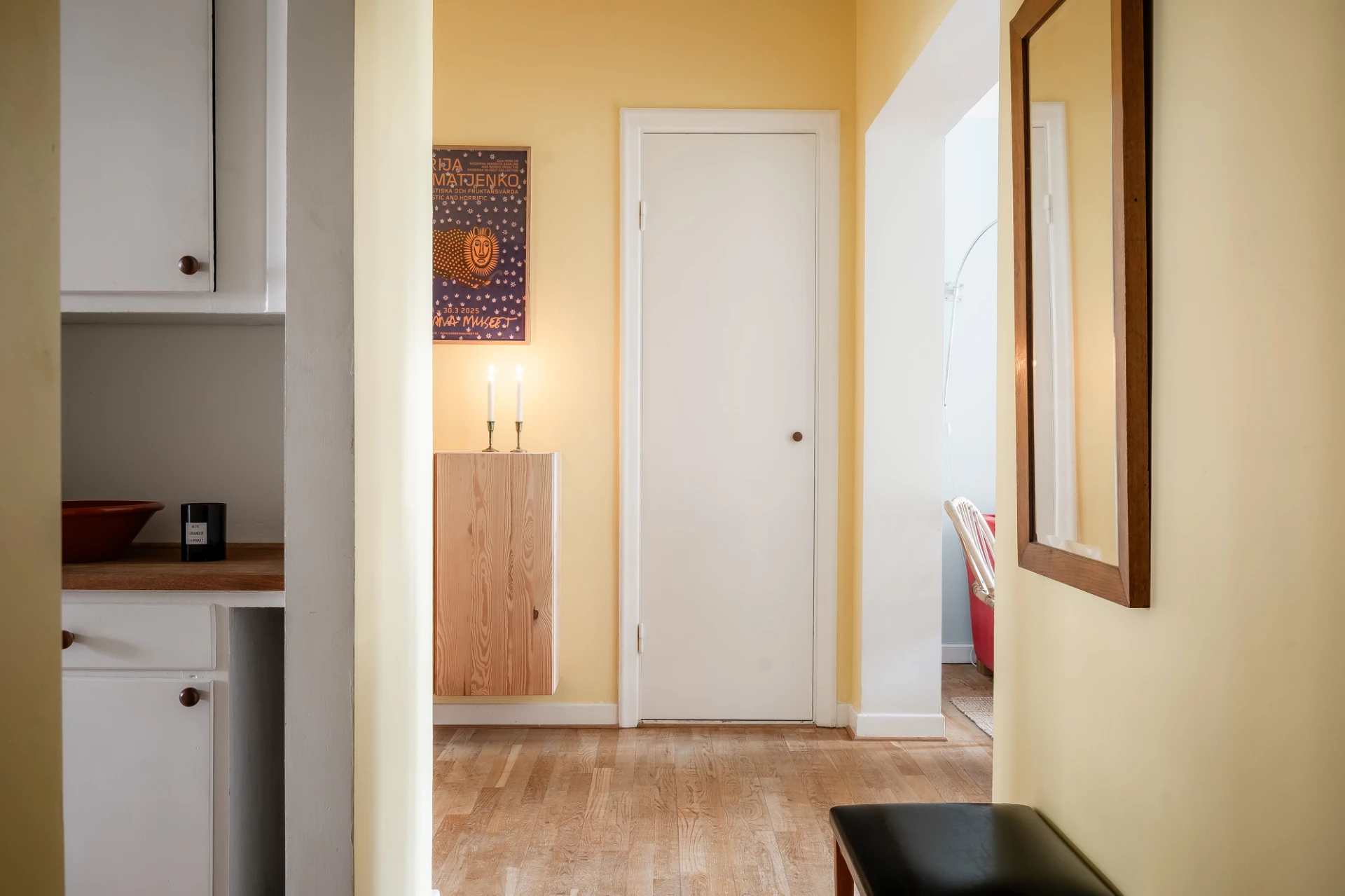 Parkettgolv och gula väggar. Ingång till klädkammare och plats för avhängsningsmöjligheter.