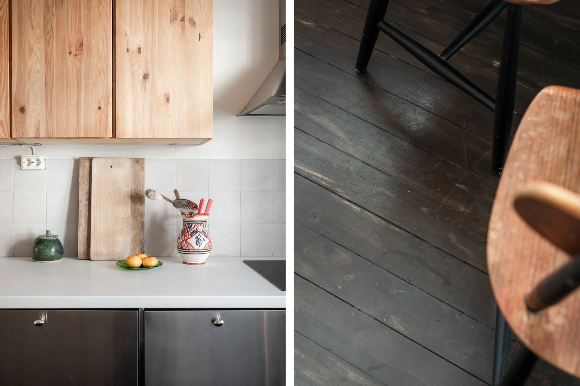 Mörkbetsat brädgolv och ljusa varma väggar. Ingång till klädkammare.