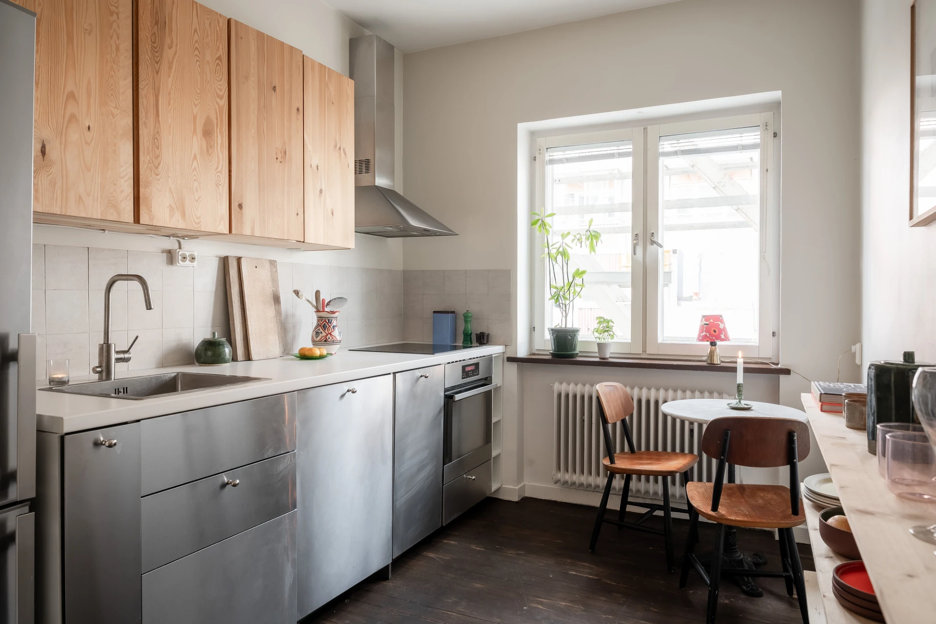 Mörkbetsat brädgolv och vita väggar. Köksskåp med luckor i rostfritt, ljust kakel ovan bänkskiva i vit laminat. Köket är utrustat med kyl/frys, induktionshäll, ugn, fläkt och integrerad diskmaskin samt tvättmaskin. I anslutning till köket finns en serveringsgång med skåpsförvaring.