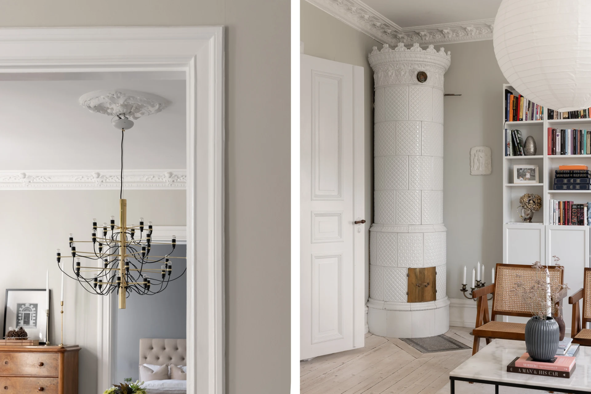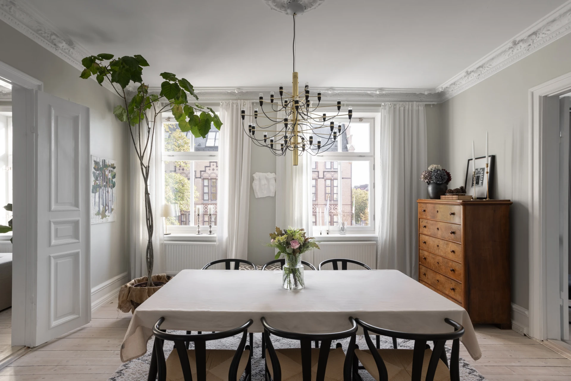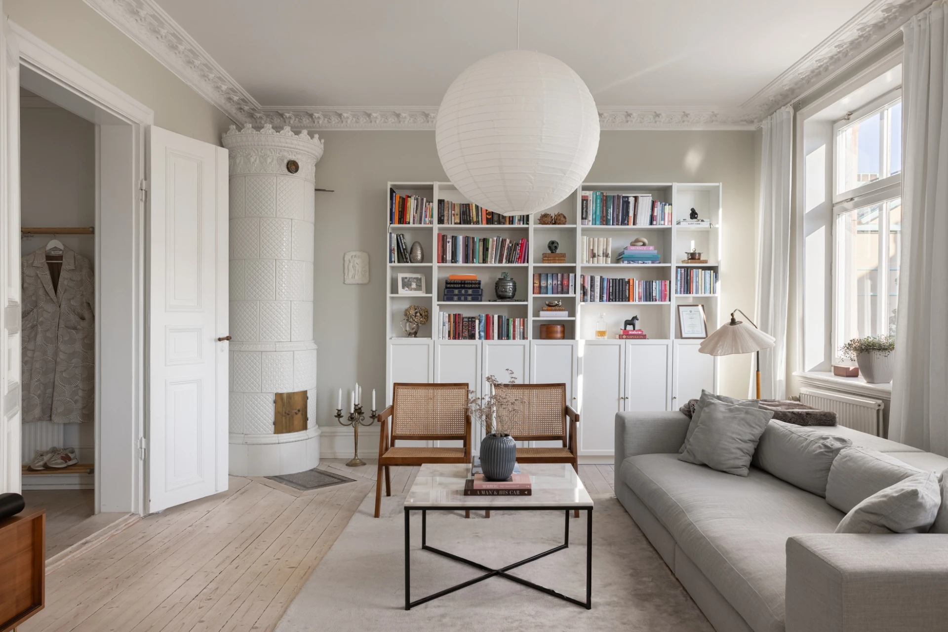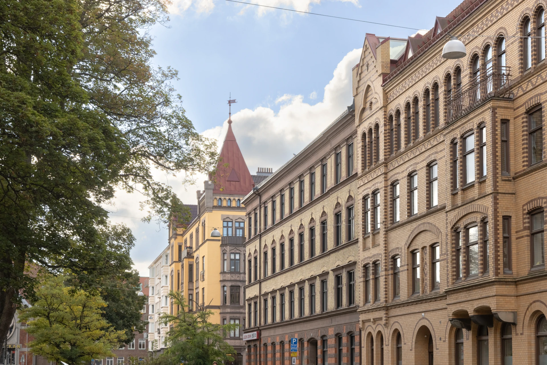 Sekelskiftescharm och modern bekvämlighet möts i denna underbara sekelskiftesvåning högst upp i huset, där tre generösa rum i fil och en välplanerad disposition skapar ett hem med både karaktär och harmoni. Här är det de klassiska detaljerna som sätter tonen - pampiga stuckaturer, takhöjd över tre meter, vackra spegeldörrar och höga fotlister. De genomgående brädgolven bidrar med en varm och ombonad känsla och ramar in de ljusa, välproportionerade rummen på ett naturligt sätt. I vardagsrummet står en kakelugn som förstärker atmosfären och ger en hemtrevlig tyngd åt sällskapsdelen. Köket håller genomgående hög standard och har direkt access till en rymlig gårdsvänd balkong i soligt sydvästläge - en given plats för såväl morgonkaffe som kvällens måltider i solen. Badrummet är renoverat med smakfulla materialval, och samtliga väggar, dörrar och tak har nyligen målats vilket ger ett fräscht och inflyttningsklart intryck.