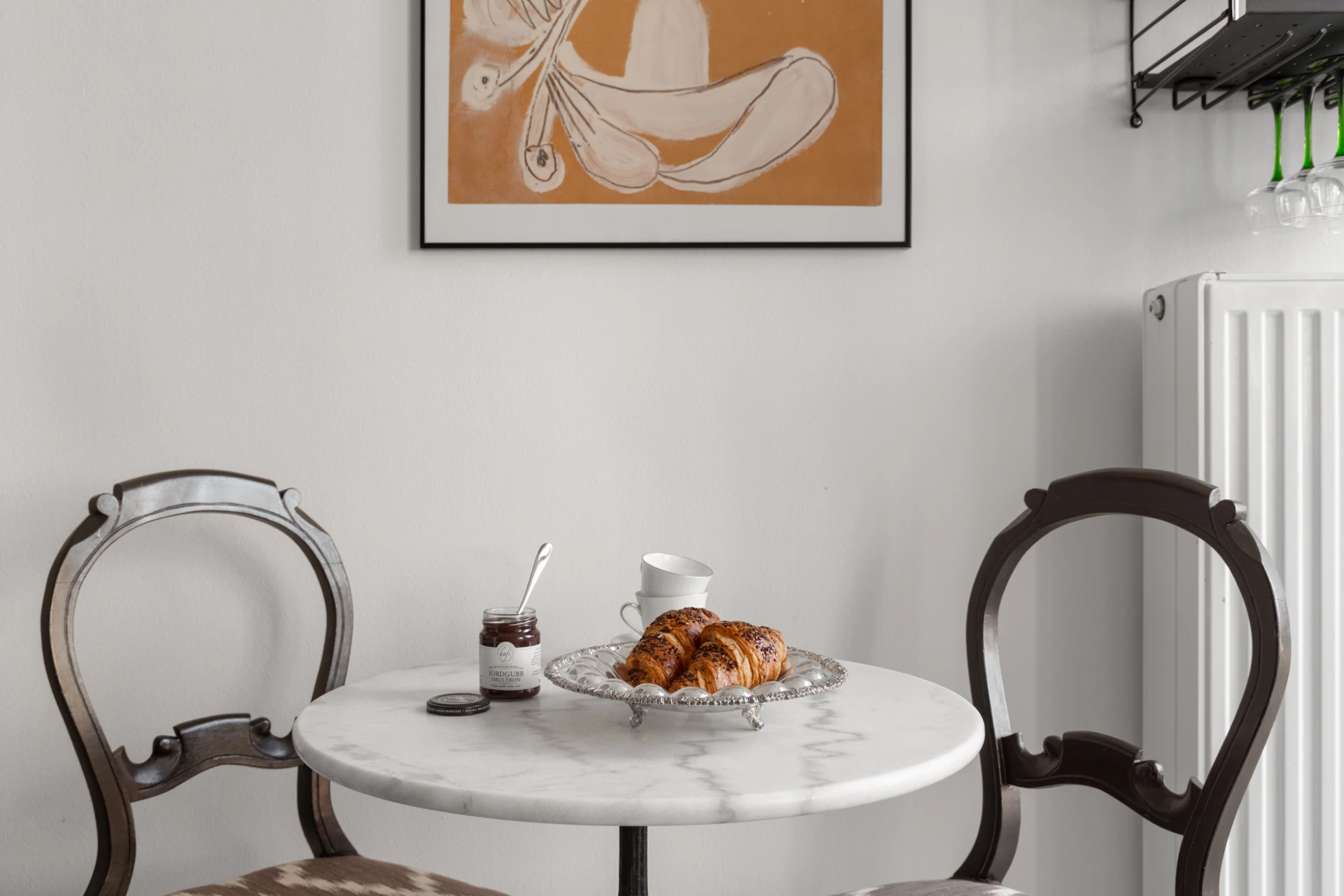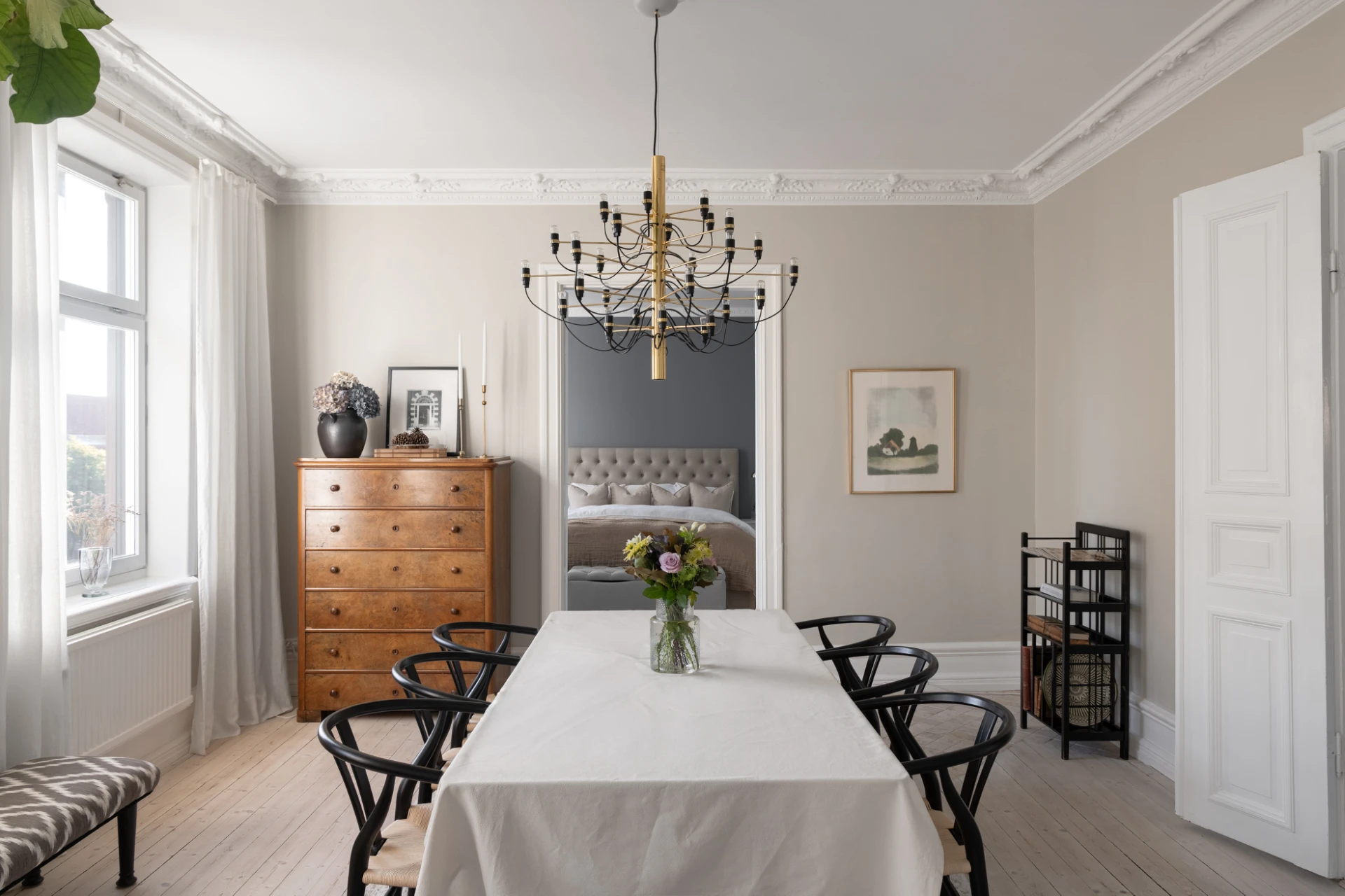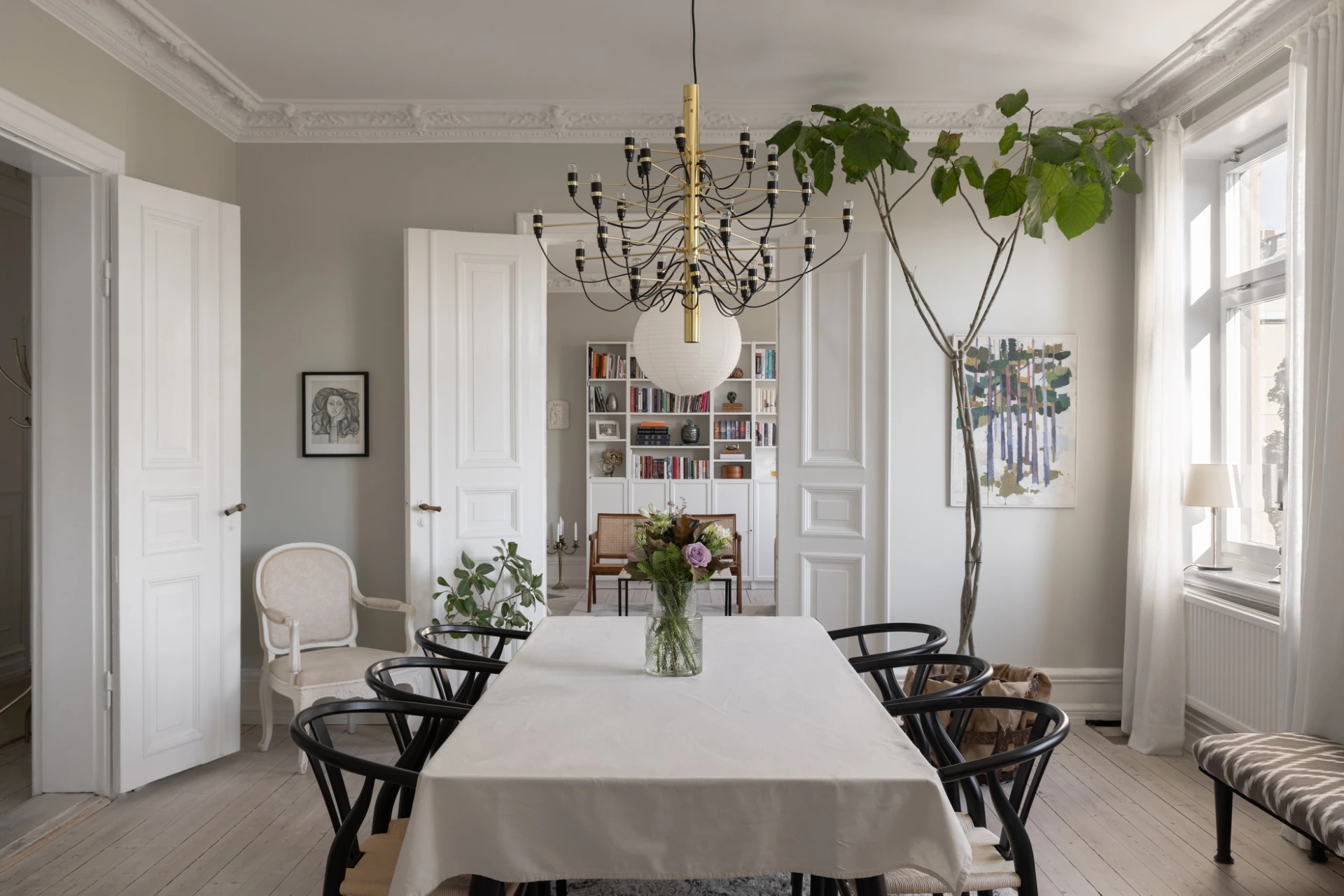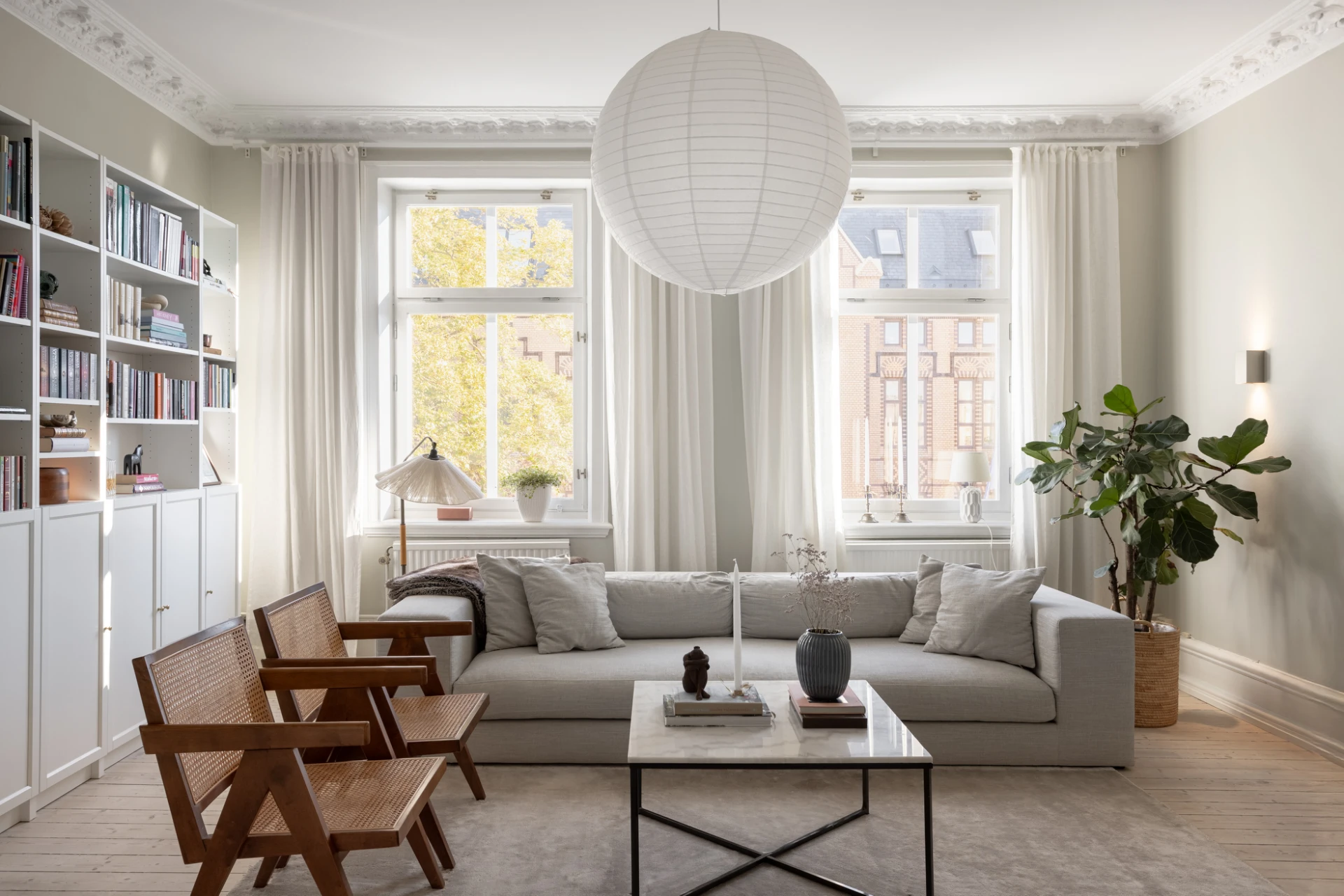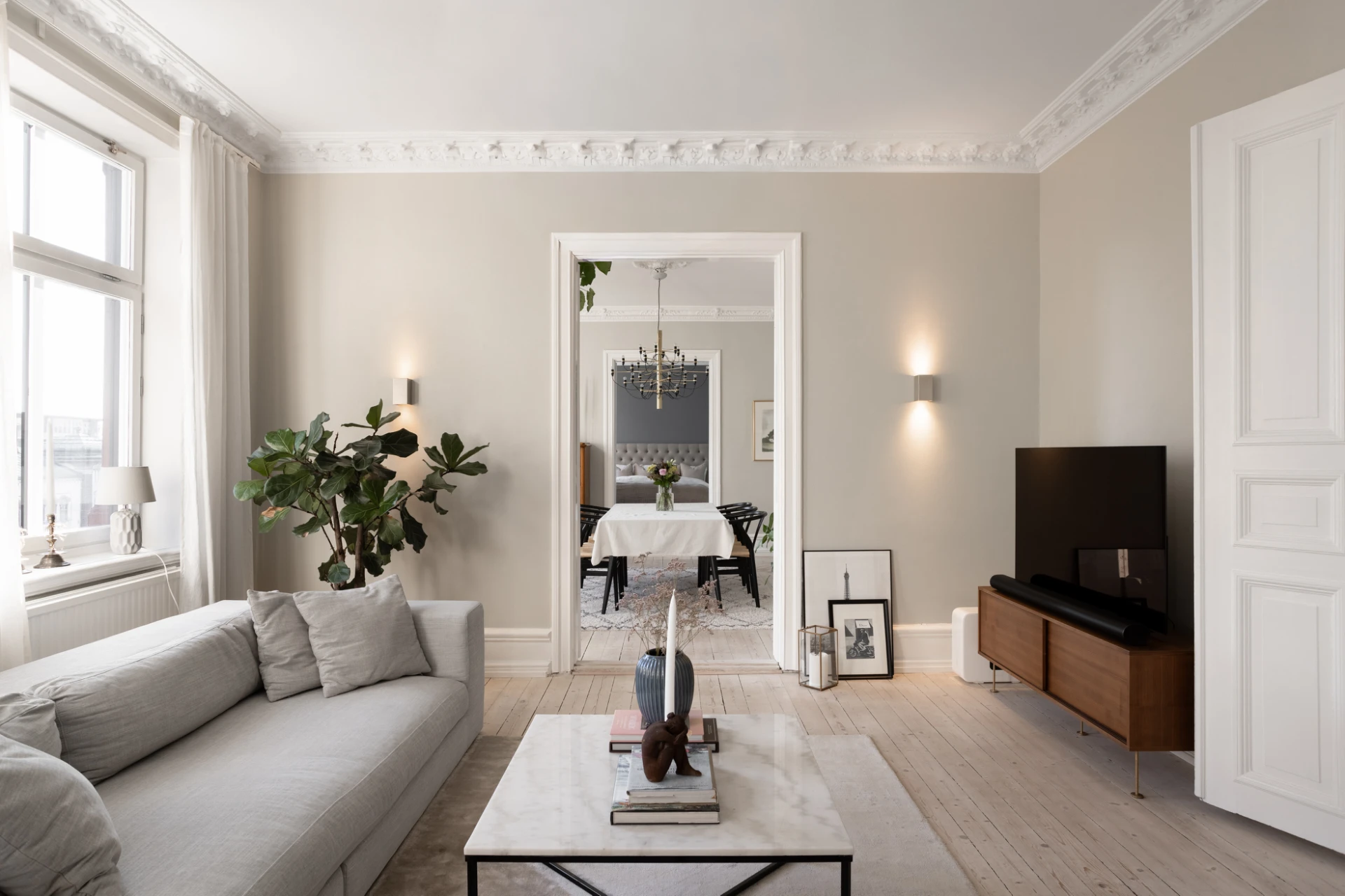 Sekelskiftescharm och modern bekvämlighet möts i denna underbara sekelskiftesvåning högst upp i huset, där tre generösa rum i fil och en välplanerad disposition skapar ett hem med både karaktär och harmoni. Här är det de klassiska detaljerna som sätter tonen - pampiga stuckaturer, takhöjd över tre meter, vackra spegeldörrar och höga fotlister. De genomgående brädgolven bidrar med en varm och ombonad känsla och ramar in de ljusa, välproportionerade rummen på ett naturligt sätt. I vardagsrummet står en kakelugn som förstärker atmosfären och ger en hemtrevlig tyngd åt sällskapsdelen. Köket håller genomgående hög standard och har direkt access till en rymlig gårdsvänd balkong i soligt sydvästläge - en given plats för såväl morgonkaffe som kvällens måltider i solen. Badrummet är renoverat med smakfulla materialval, och samtliga väggar, dörrar och tak har nyligen målats vilket ger ett fräscht och inflyttningsklart intryck.