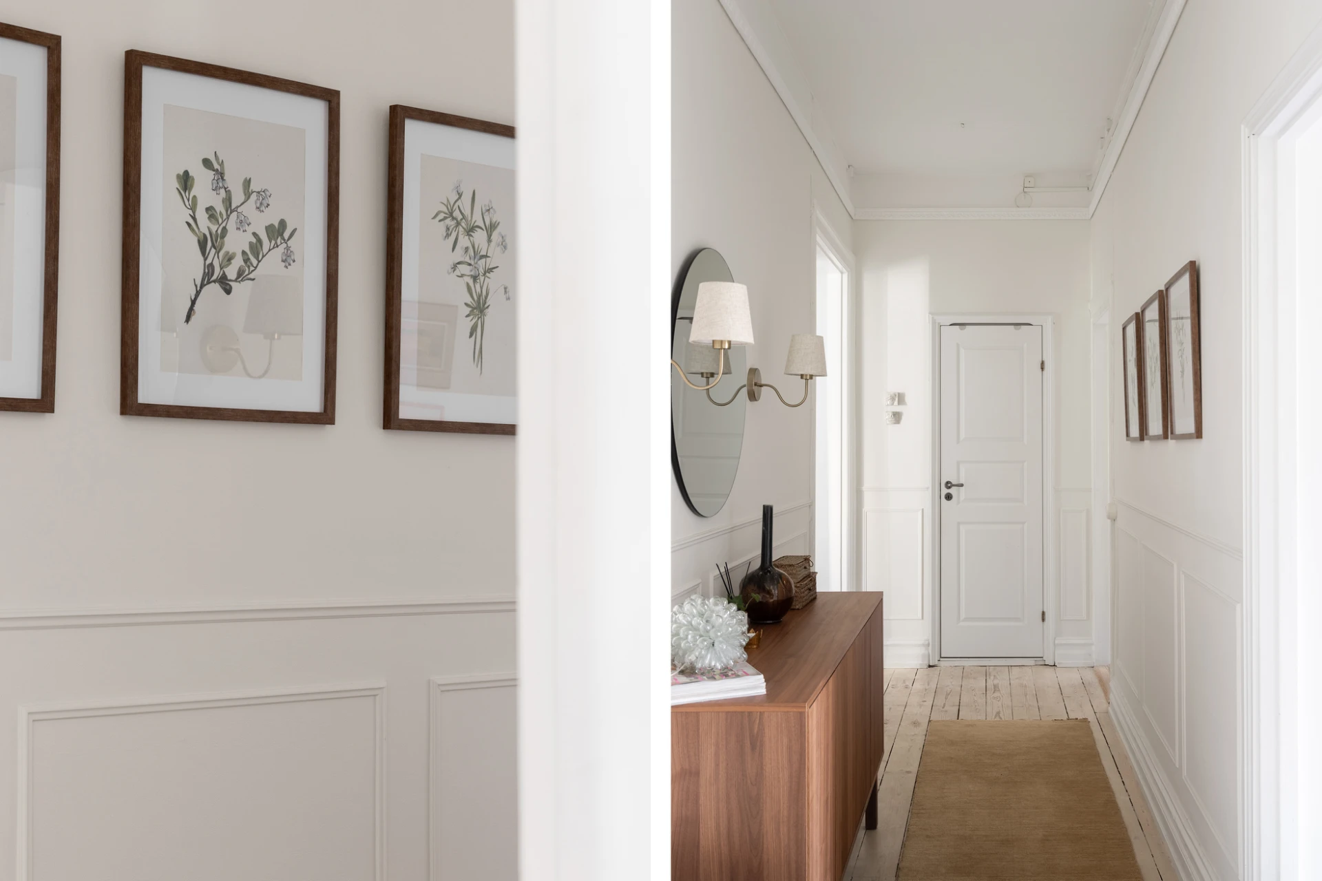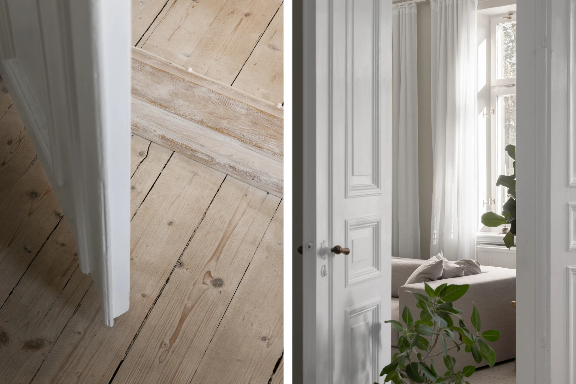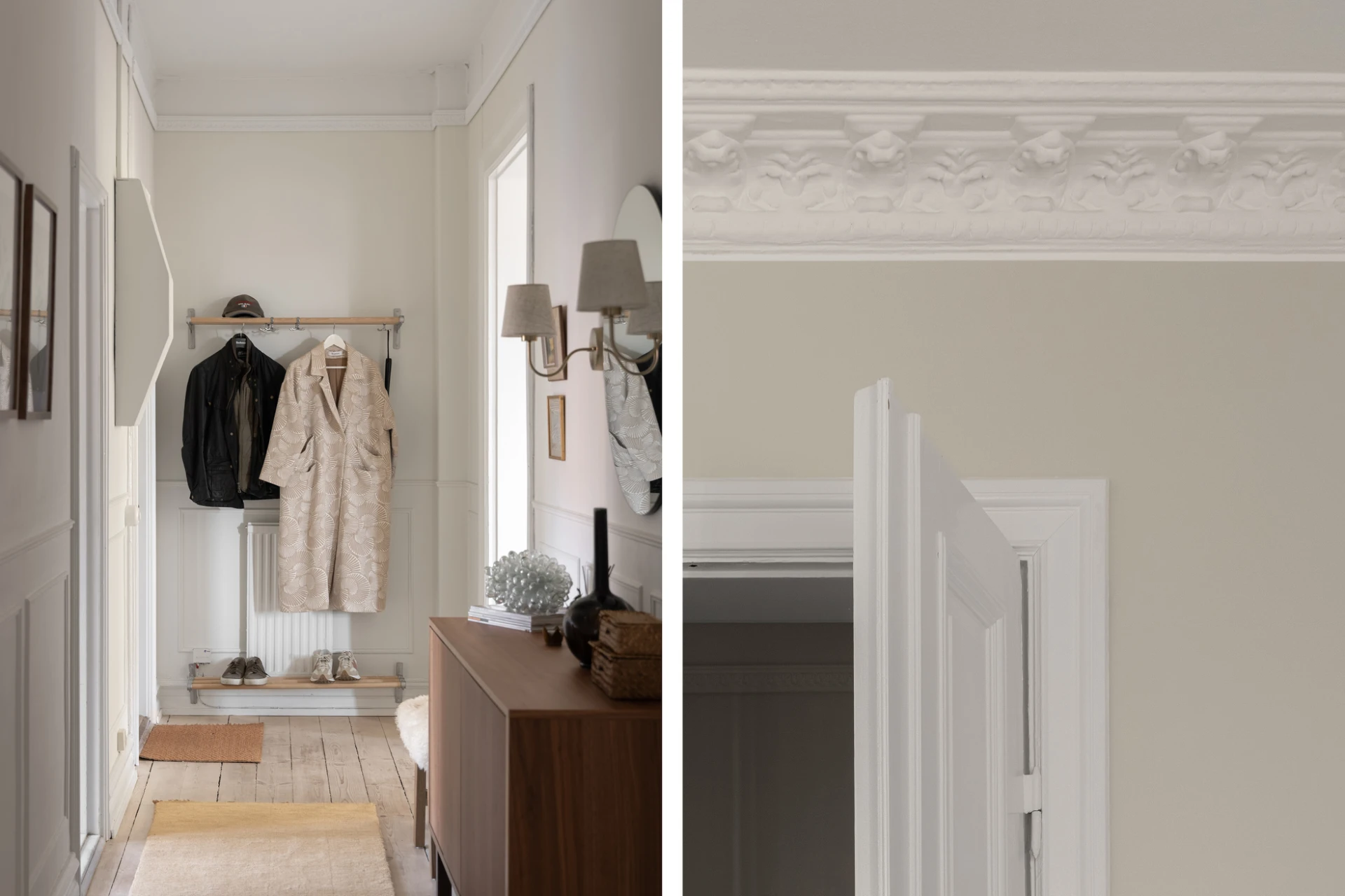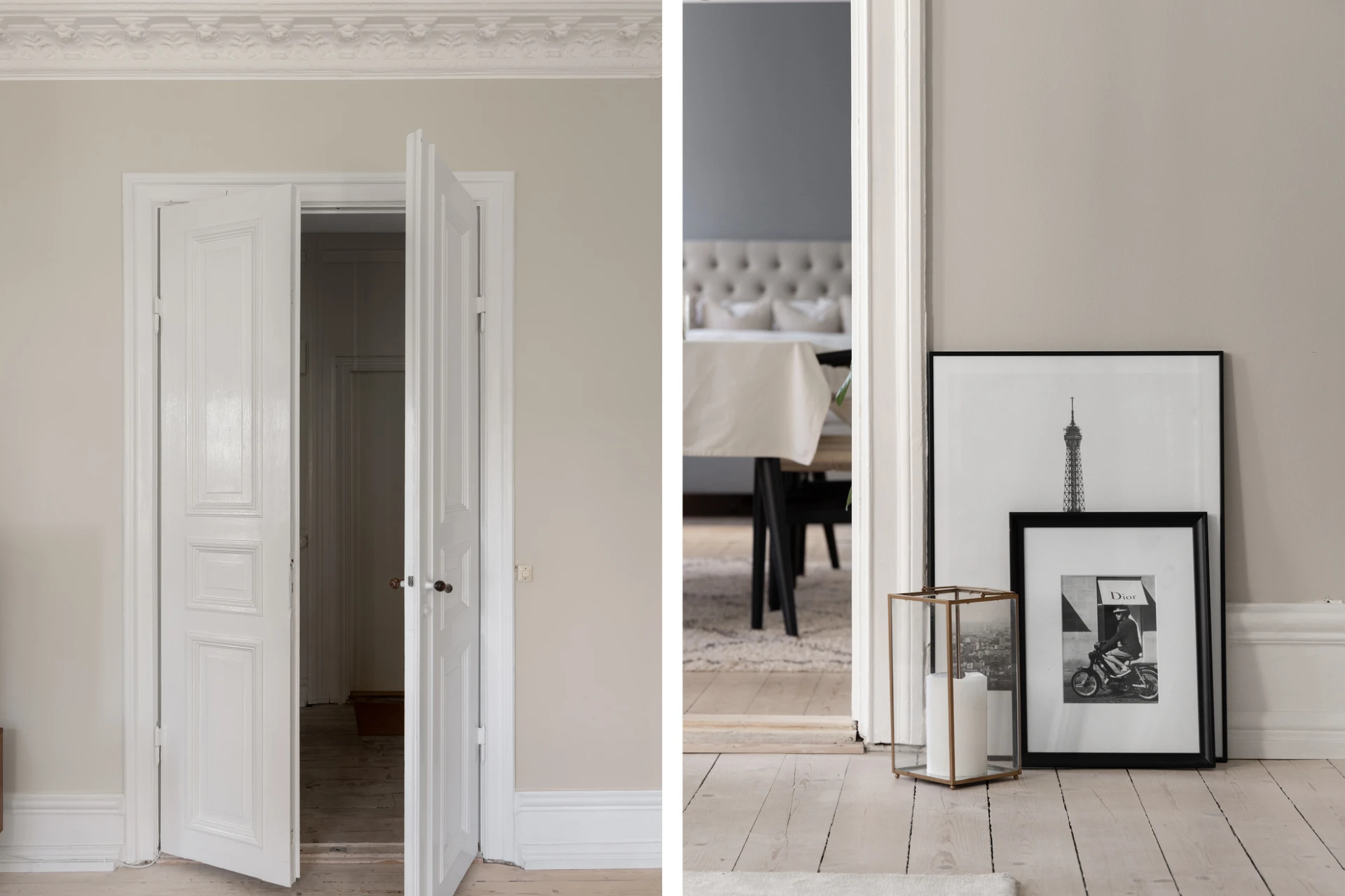 Brädgolv och greige väggar. Ingång till klädkammare.