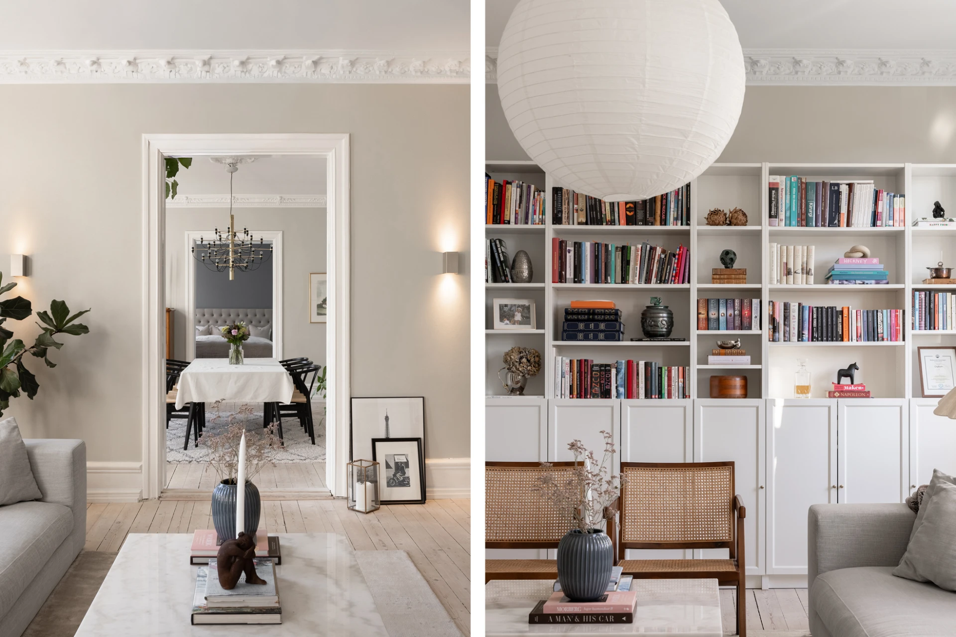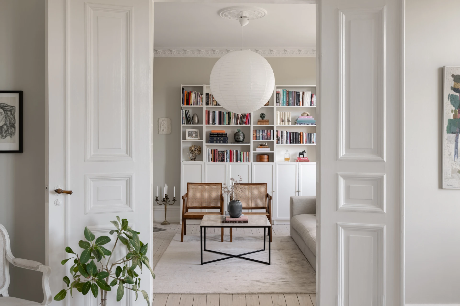 Brädgolv och greige väggar. Två ingångar i form av tidstypiska dubbeldörrar.