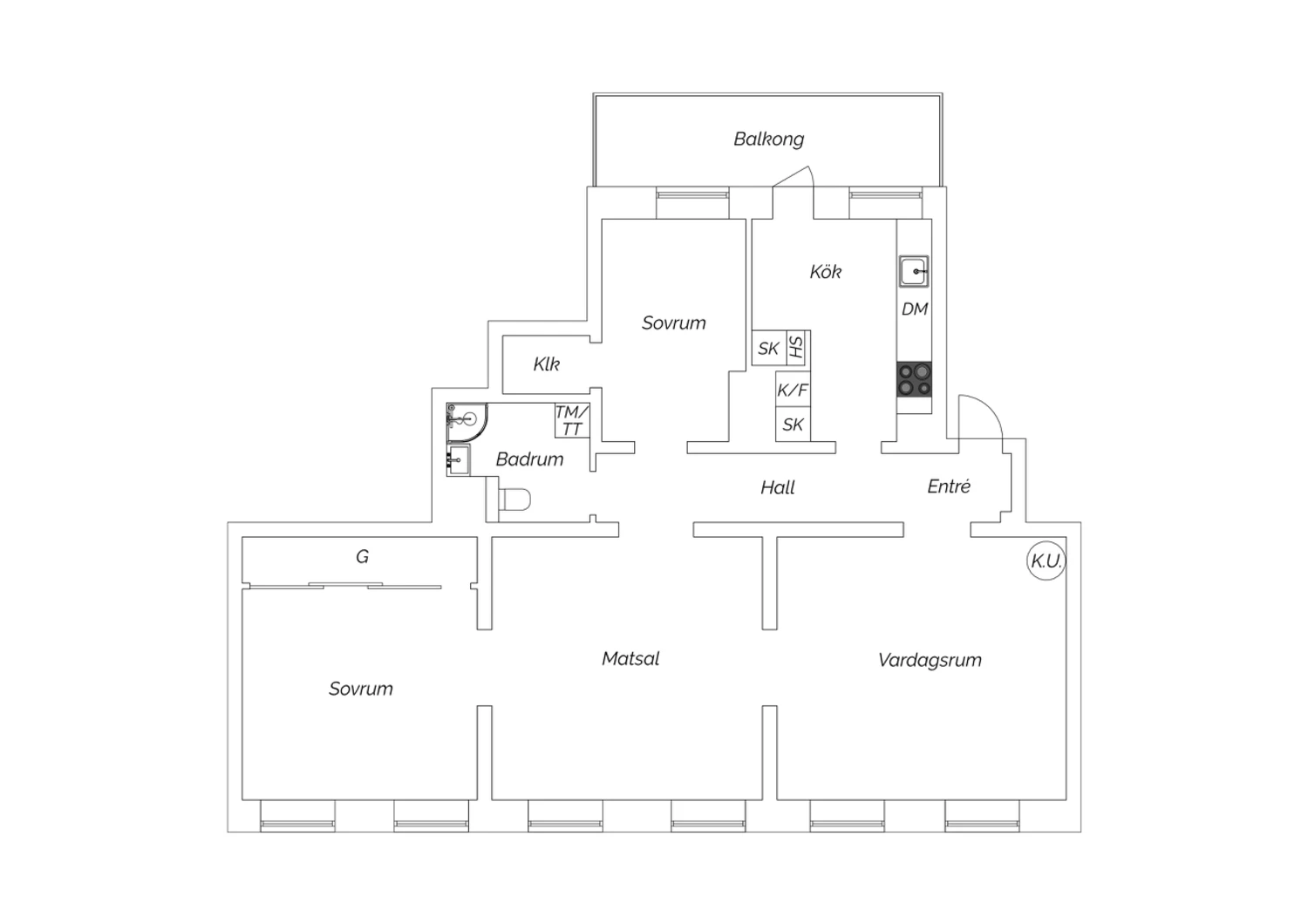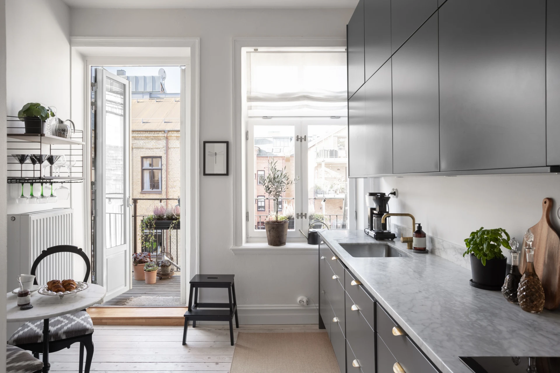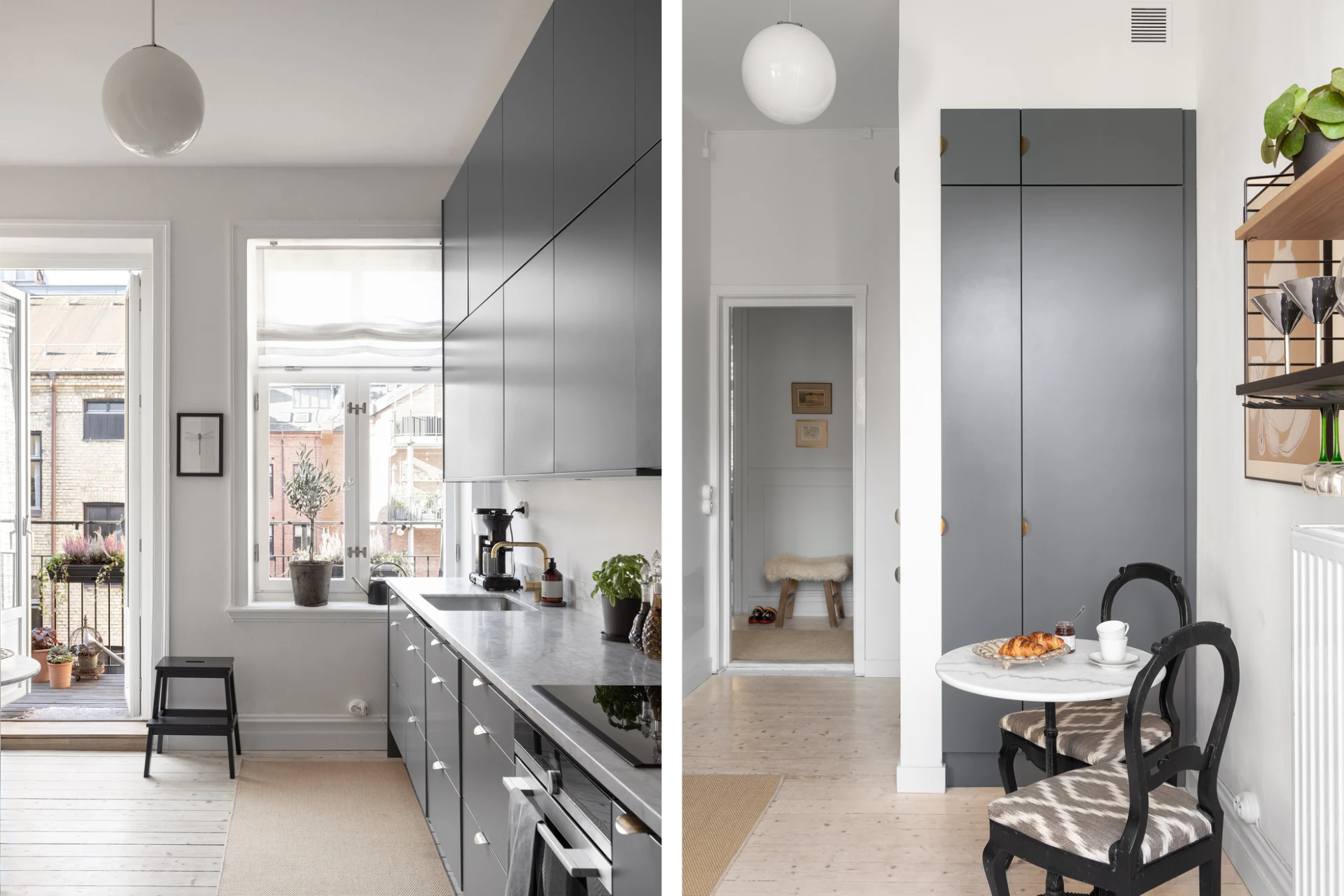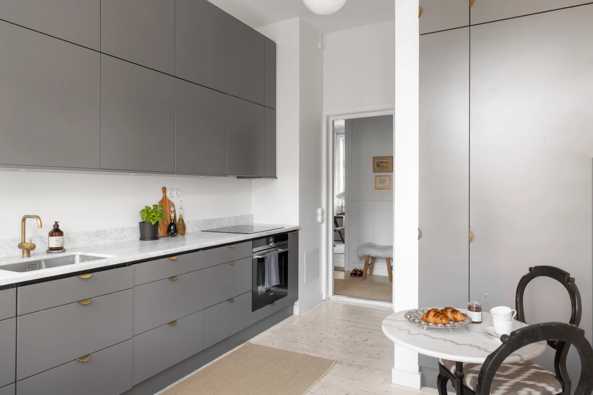 Brädgolv och vita väggar. Grå köksinredning (Vedum) med bänkskiva och stänkskydd i marmor. Utrustat med kyl/frys, induktionshäll, fläkt, inbyggd ugn/mikrovågsugn samt diskmaskin (2023). Samtliga vitvaror är från Siemens. Generöst med förvaring. Plats för mindre matbord. Utgång till gårdsvänd balkong i sydvästläge.