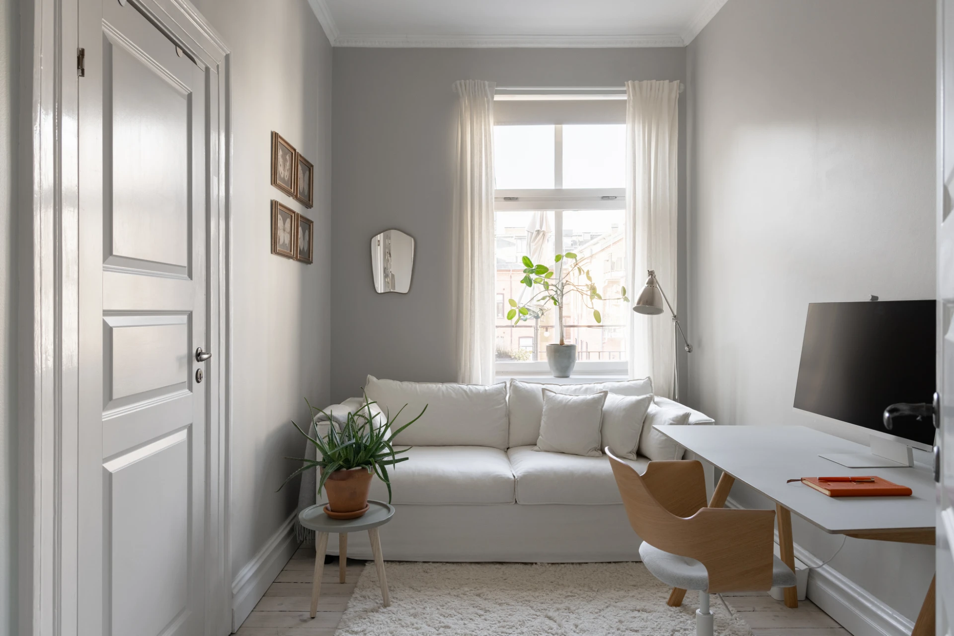 Brädgolv och äggskalsvita väggar. Plats för avhängning.