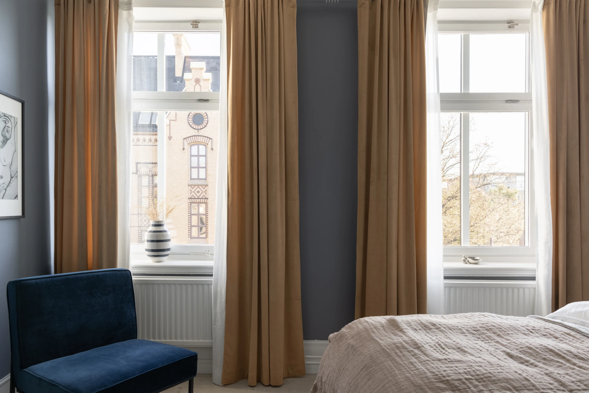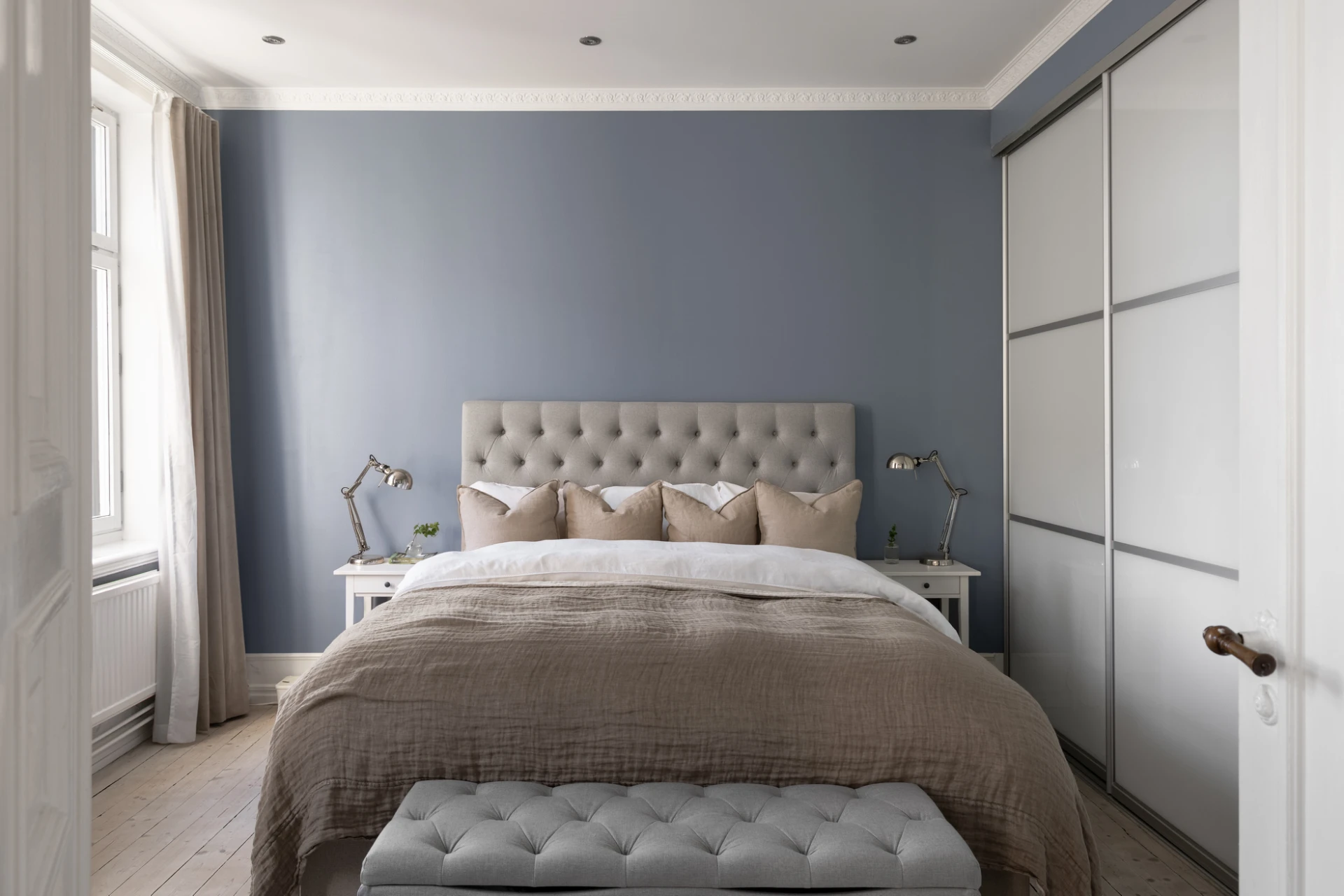 Brädgolv och mörkblå väggar. Förvaring i skjutdörrsgarderob längs ena väggen med djup och hög förvaring som utnyttjar takhöjden.