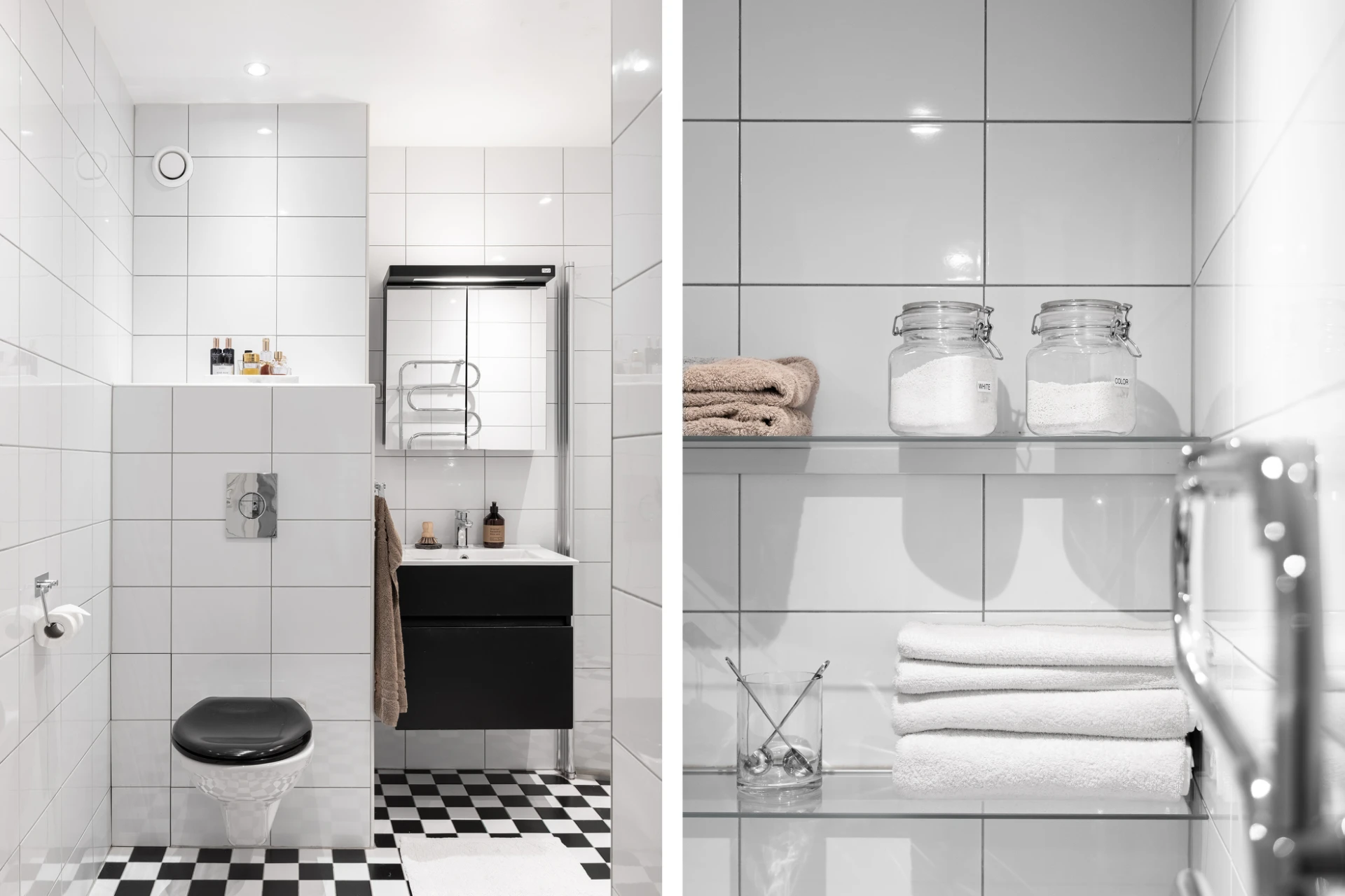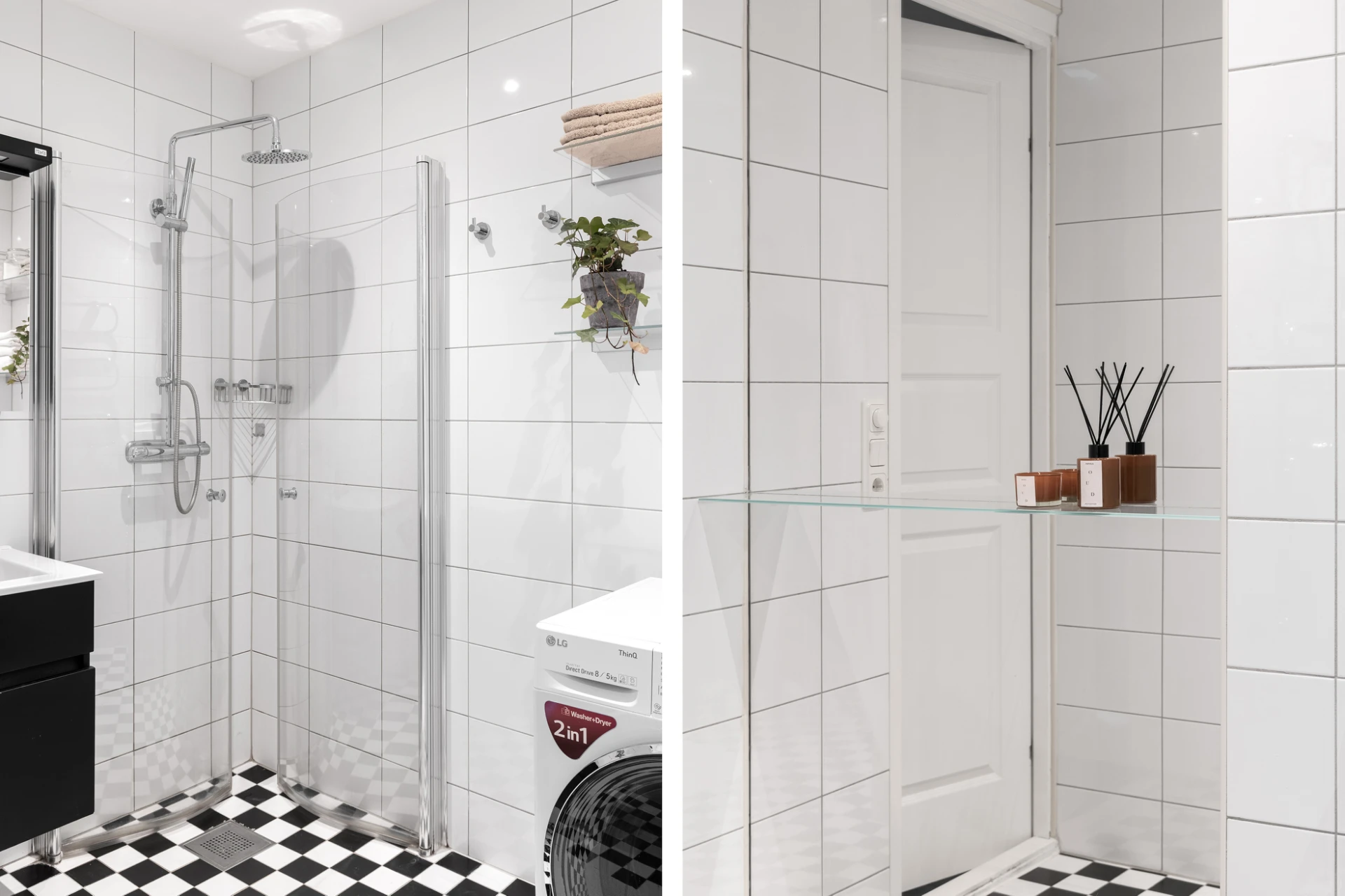 Schackrutig klinker och vitt kakel. Utrustat med takdusch, svängda vikbara duschväggar, vägghängd wc, handfat med svart kommod, spegelskåp, stor väggspegel längs ena väggen, handdukstork och kombinerad tvättmaskin/torktumlare (LG).