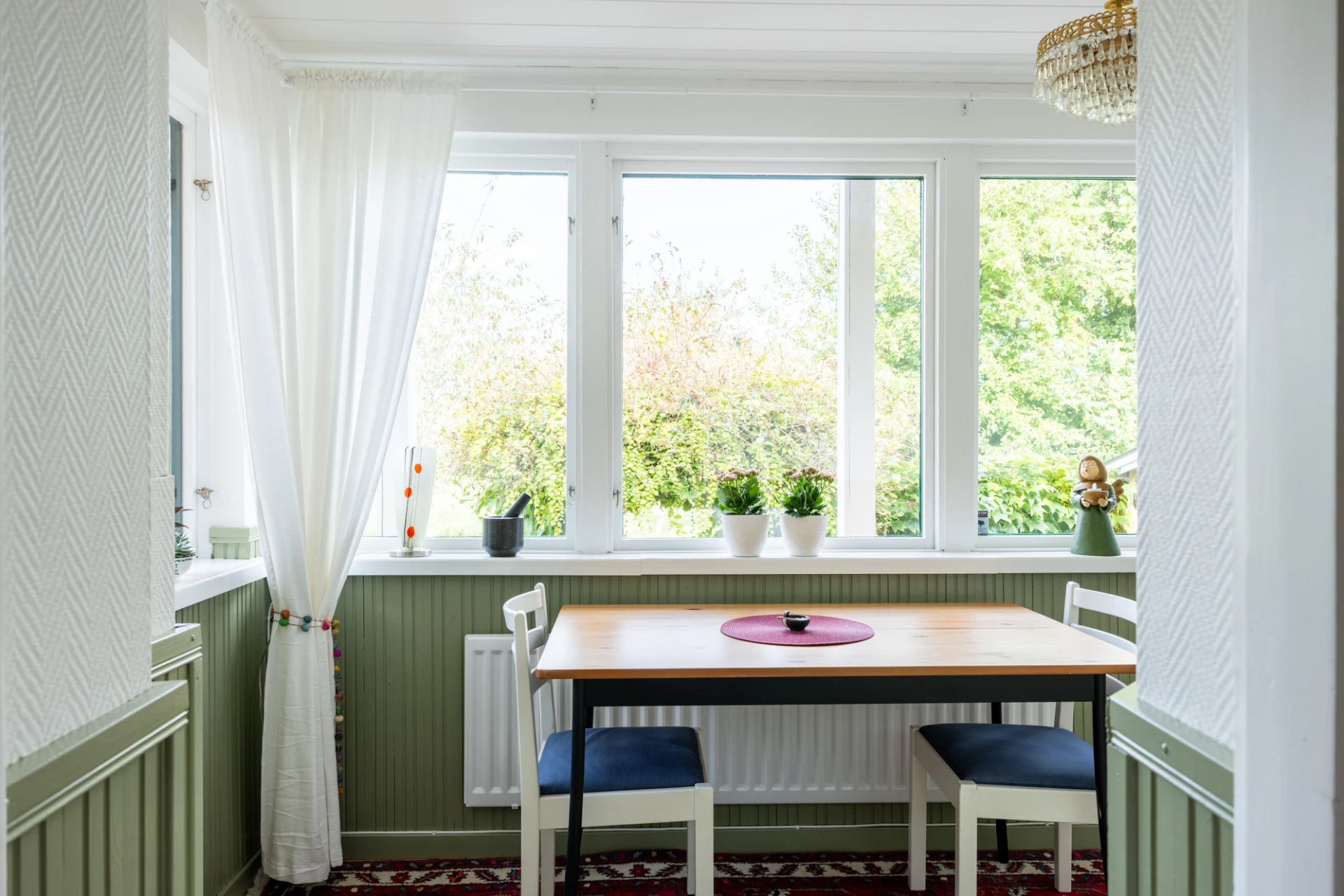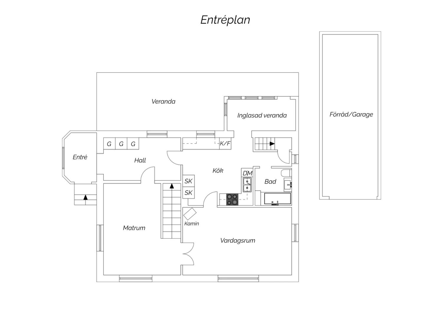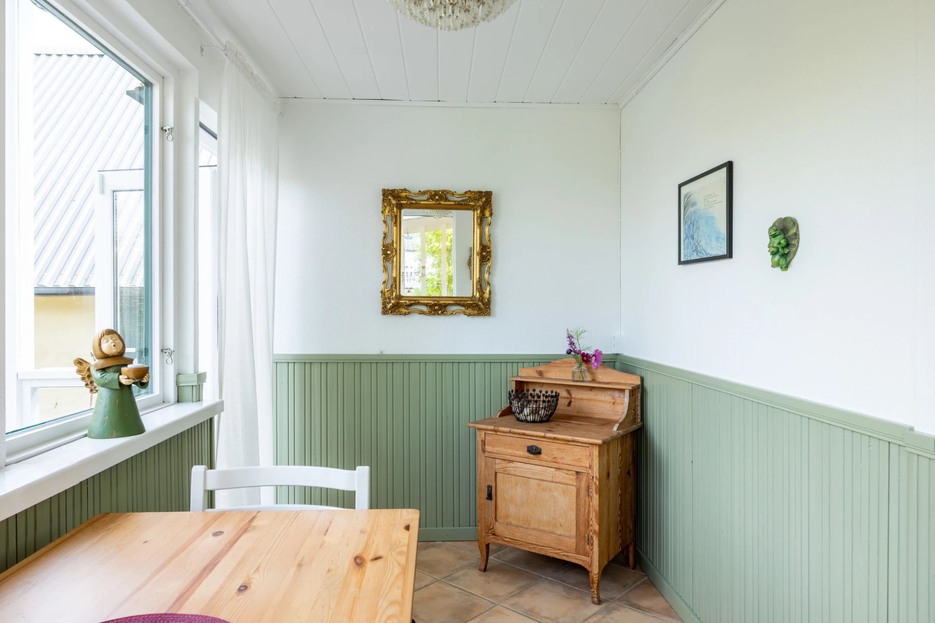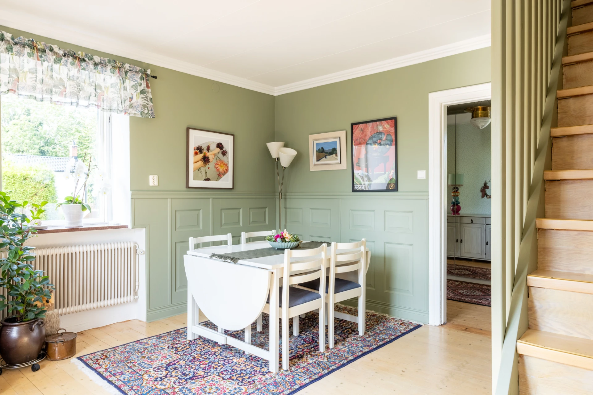 Entréplanet bjuder på ett trivsamt vardagsrum med braskamin, ett nyrenoverat matrum samt ett charmigt och praktiskt kök. Till köket ansluter en av favoritplatserna i huset, nämligen den lilla verandan, där måltiderna kan avnjutas året runt med utsikt mot grönområdet. Här sitter man gärna länge och väl! Det finns även en rejäl terrass, delvis överbyggd och vindskyddad. Den är en stor tillgång under sommarens lata dagar och förlänger utesäsongen. Under en del av huset finner vi källaren, vilken inrymmer tvättstugan och praktisk förvaring. Här nere är takhöjden lite lägre men det funkar helt klart som tvättstuga etc.
