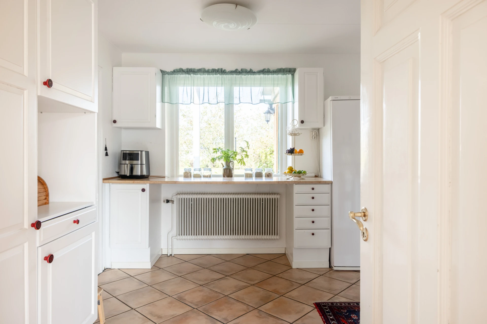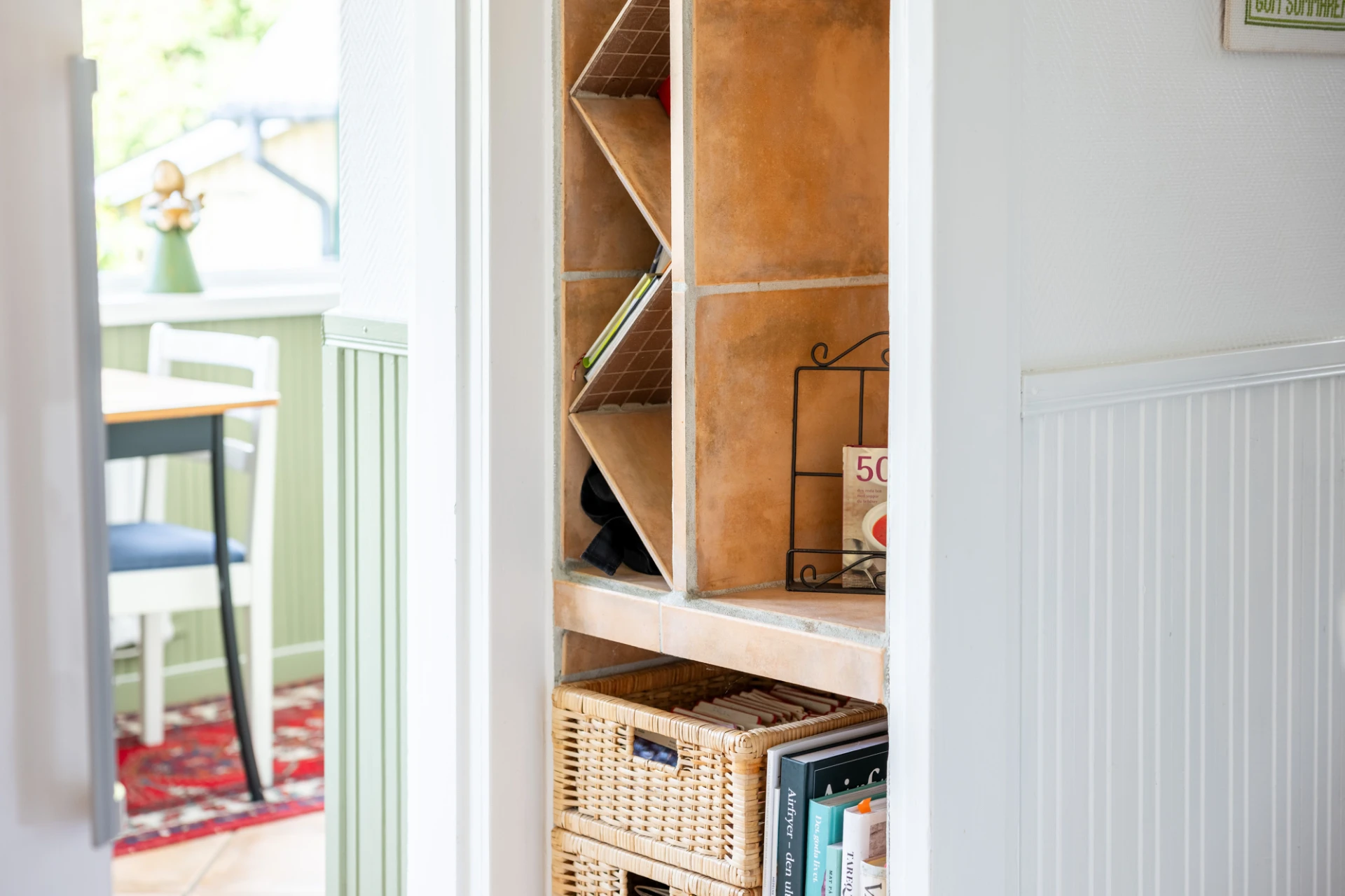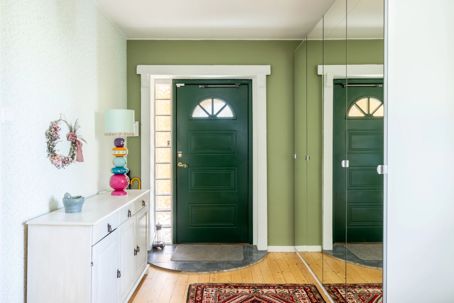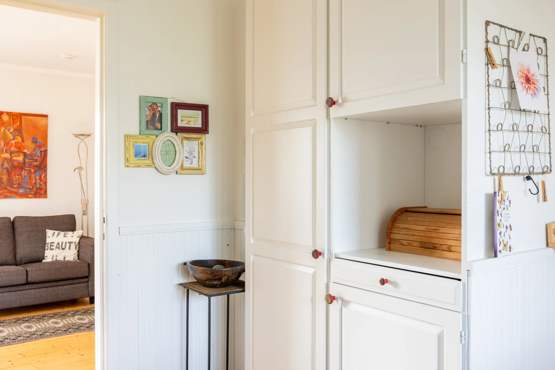 Entréplanet bjuder på ett trivsamt vardagsrum med braskamin, ett nyrenoverat matrum samt ett charmigt och praktiskt kök. Till köket ansluter en av favoritplatserna i huset, nämligen den lilla verandan, där måltiderna kan avnjutas året runt med utsikt mot grönområdet. Här sitter man gärna länge och väl! Det finns även en rejäl terrass, delvis överbyggd och vindskyddad. Den är en stor tillgång under sommarens lata dagar och förlänger utesäsongen. Under en del av huset finner vi källaren, vilken inrymmer tvättstugan och praktisk förvaring. Här nere är takhöjden lite lägre men det funkar helt klart som tvättstuga etc.