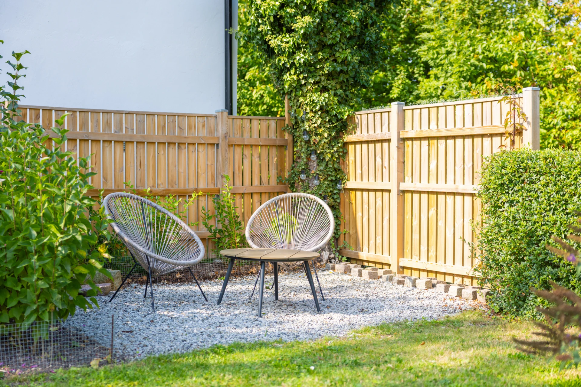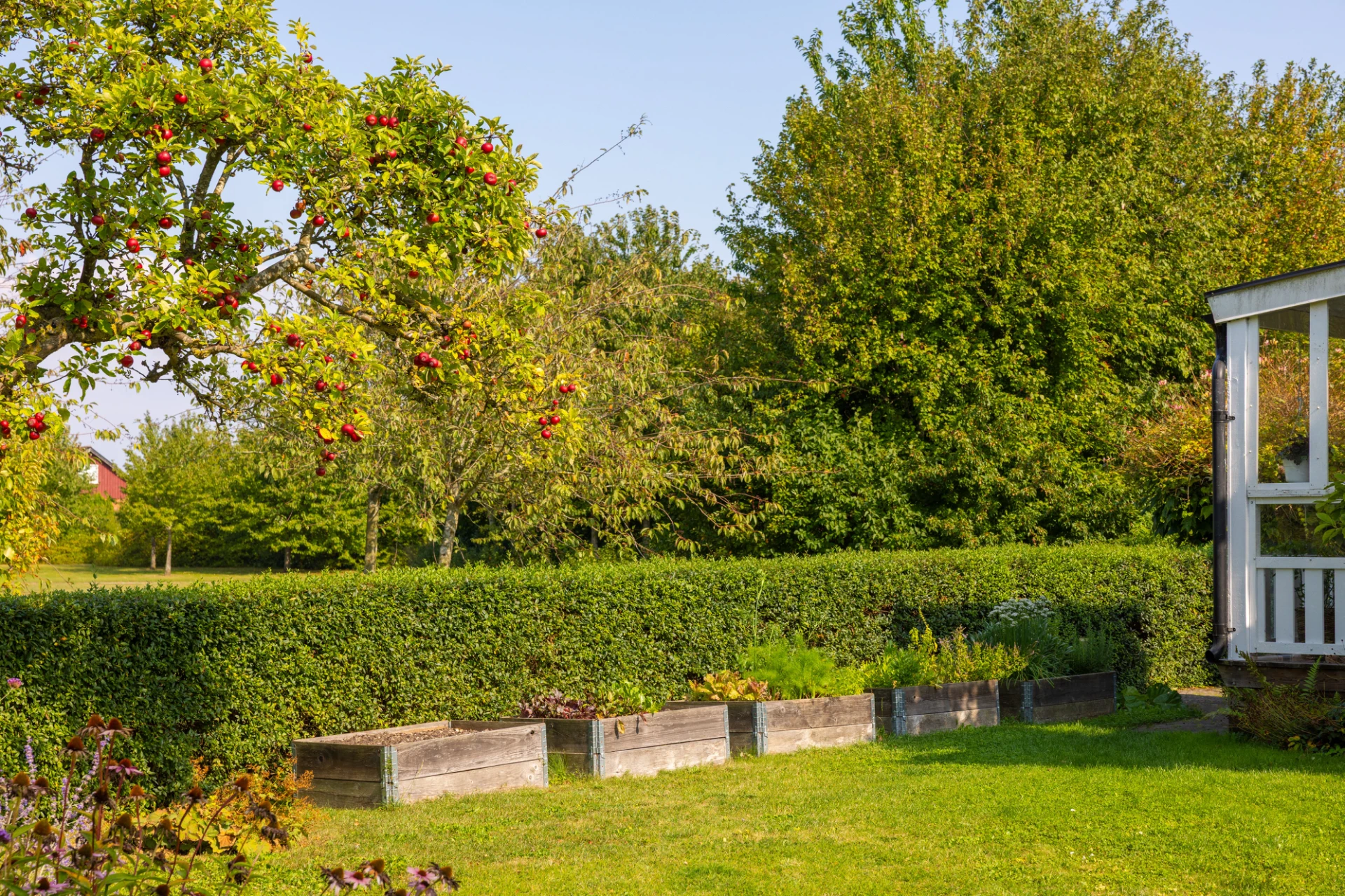 Trädgården är lummig och insynsskyddad, med grind direkt ut mot ett stort grönområde. Här finns sittplatser i både sol och skugga samt gott om plats för både odling och barnlek. På tomten finns garage, förråd med arbetsbänk, separat vedförråd samt plats för flera bilar på uppfarten.