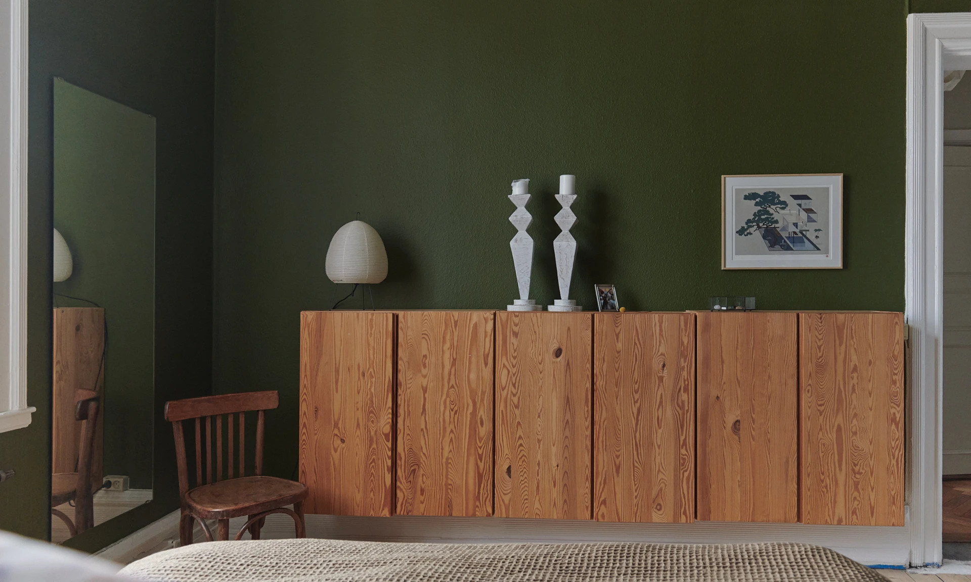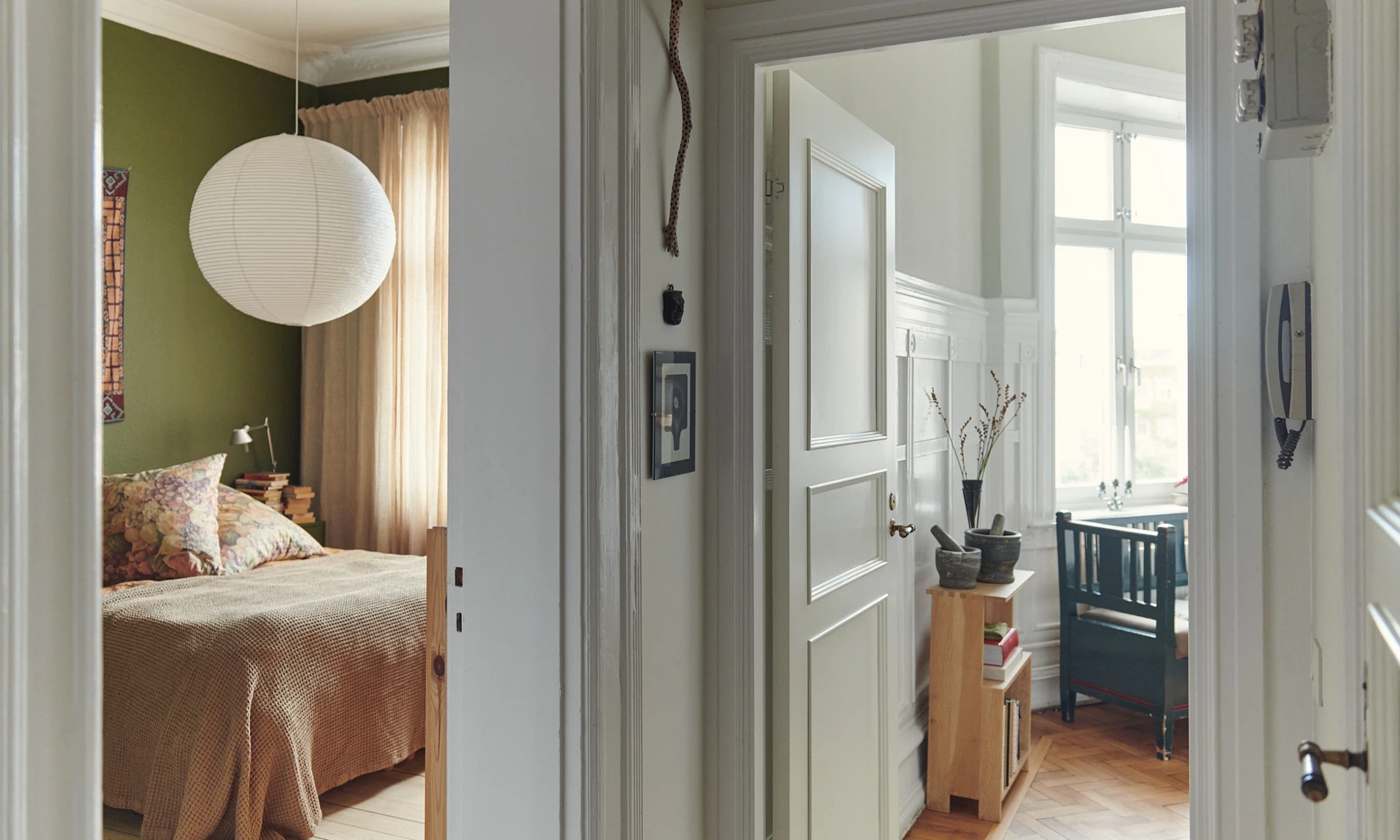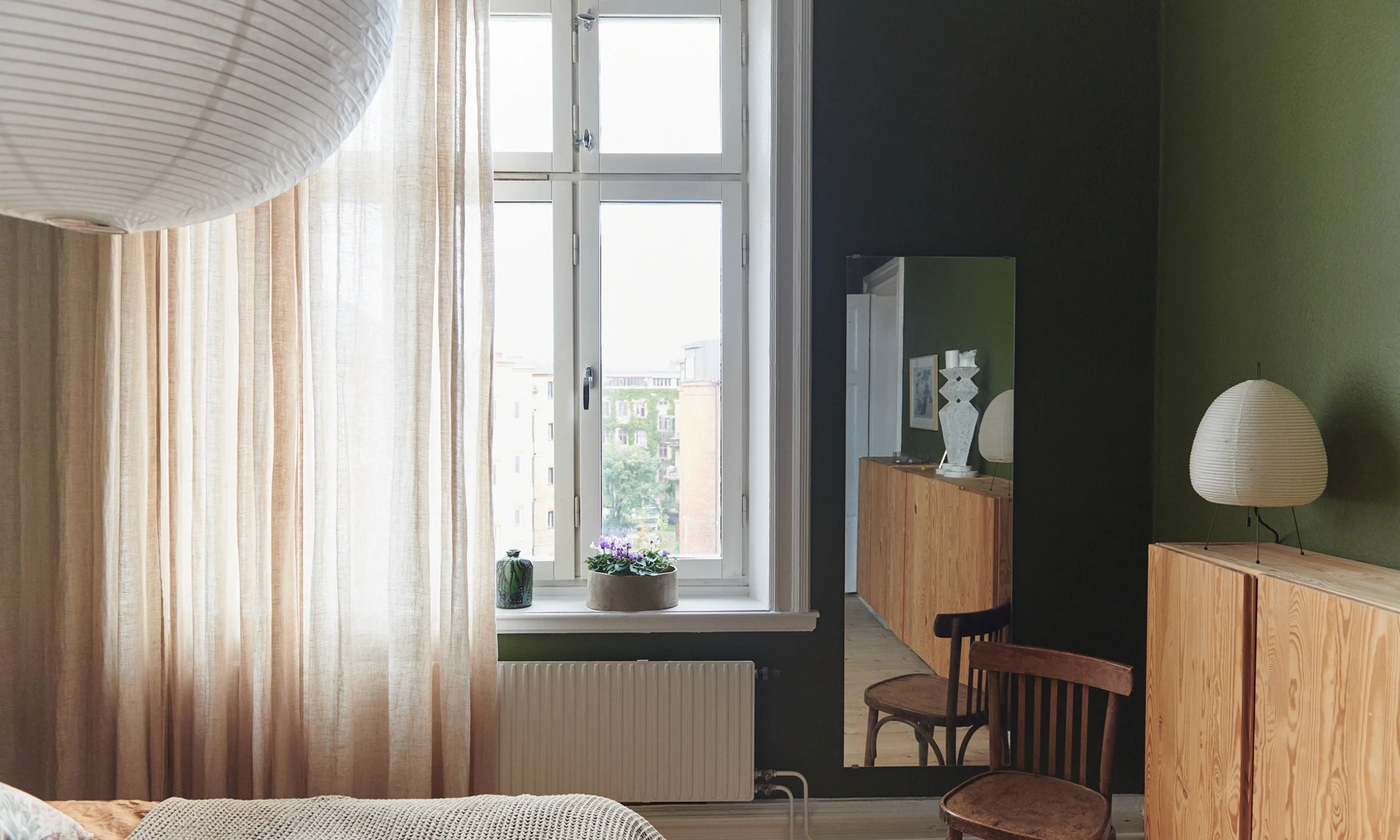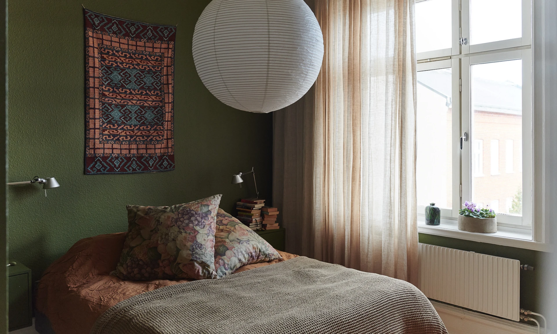 Harmonisk plats där djupgröna väggar möter originalgolv i trä. De stora fönstren släpper in rikligt med ljus samtidigt som de generösa ytorna ger gott om plats för både dubbelsäng och förvaring. Här finns även smart, inbyggd förvaring i form av garderober med både hyllplan och klädstänger som sväljer det mesta.