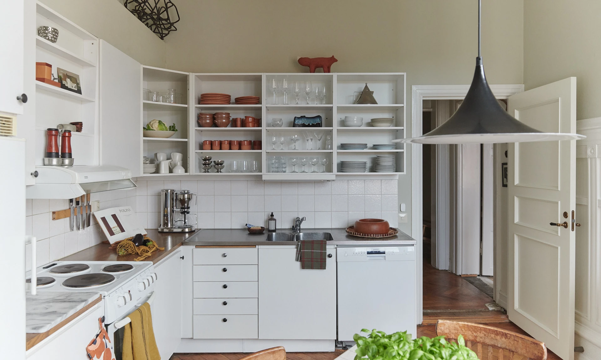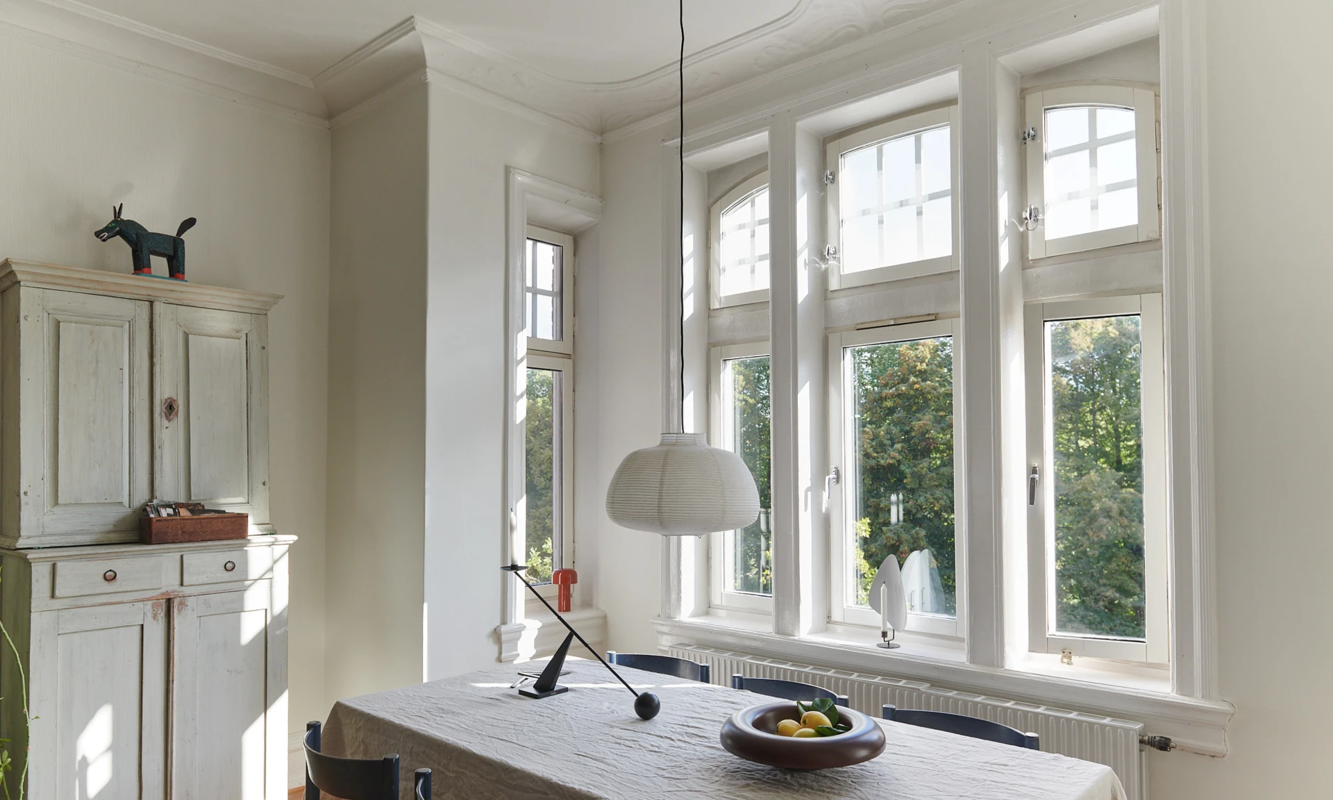 Det stora köket bjuder på en härlig kombination av funktion och tidlös charm. Här finns gott om arbetsyta och generöst med förvaring bakom klassiska köksluckor. Öppna hyllor ramar in rummet och skapar en levande känsla. På golvet ligger fiskbensparkett och väggarna pryds av spegelpanel som förstärker den genuina atmosfären. Vid det stora matbordet ryms både familj och vänner. Djupa fönsternischer, utsikt mot himmel och vackra fasader.