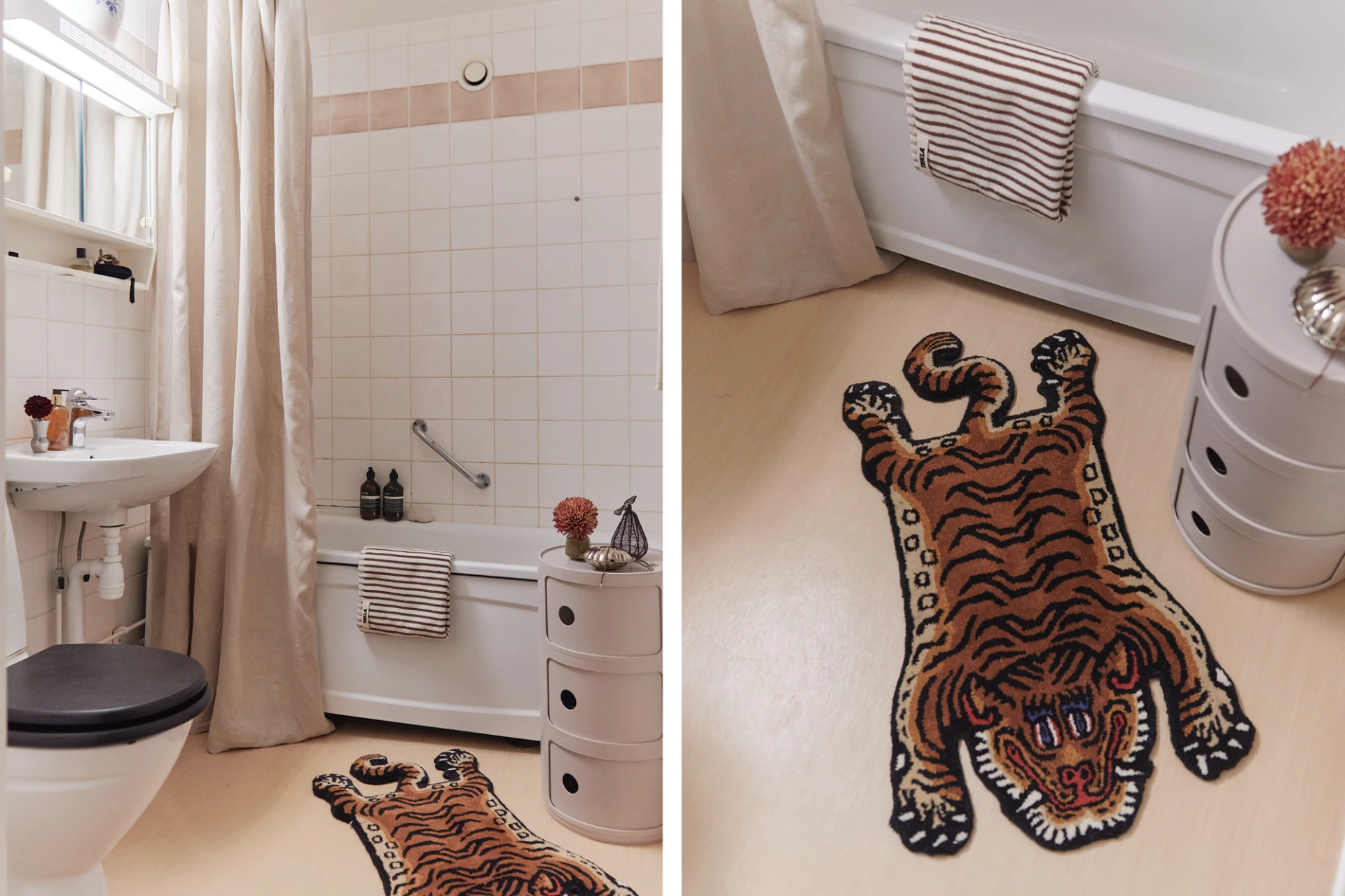 Badrummet är ljust och funktionellt med badkar, handfat och WC. Väggarna är helkaklade i vitt med en dekorbård i beige ton och golvet är belagt med en ljus våtrumsmatta.