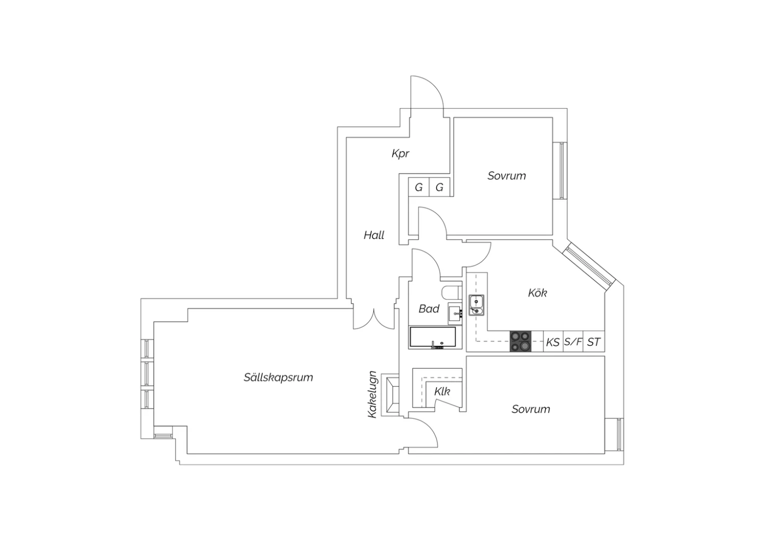 Ett fantastiskt sällskapsrum som kombinerar klassisk charm med modern elegans. Här möts vackra originaldetaljer som högt i tak, takstuckaturer och stora fönsterpartier som flödar in med ljus, tillsammans med en tidlös fiskbensparkett som ger rummet karaktär och värme. Rummets smycke är den bevarade kakelugnen i ljusgrått med dekorativt krön, som skapar en naturlig mittpunkt och ger en ombonad känsla. Från sällskapsrummet nås även bostadens andra sovrum.