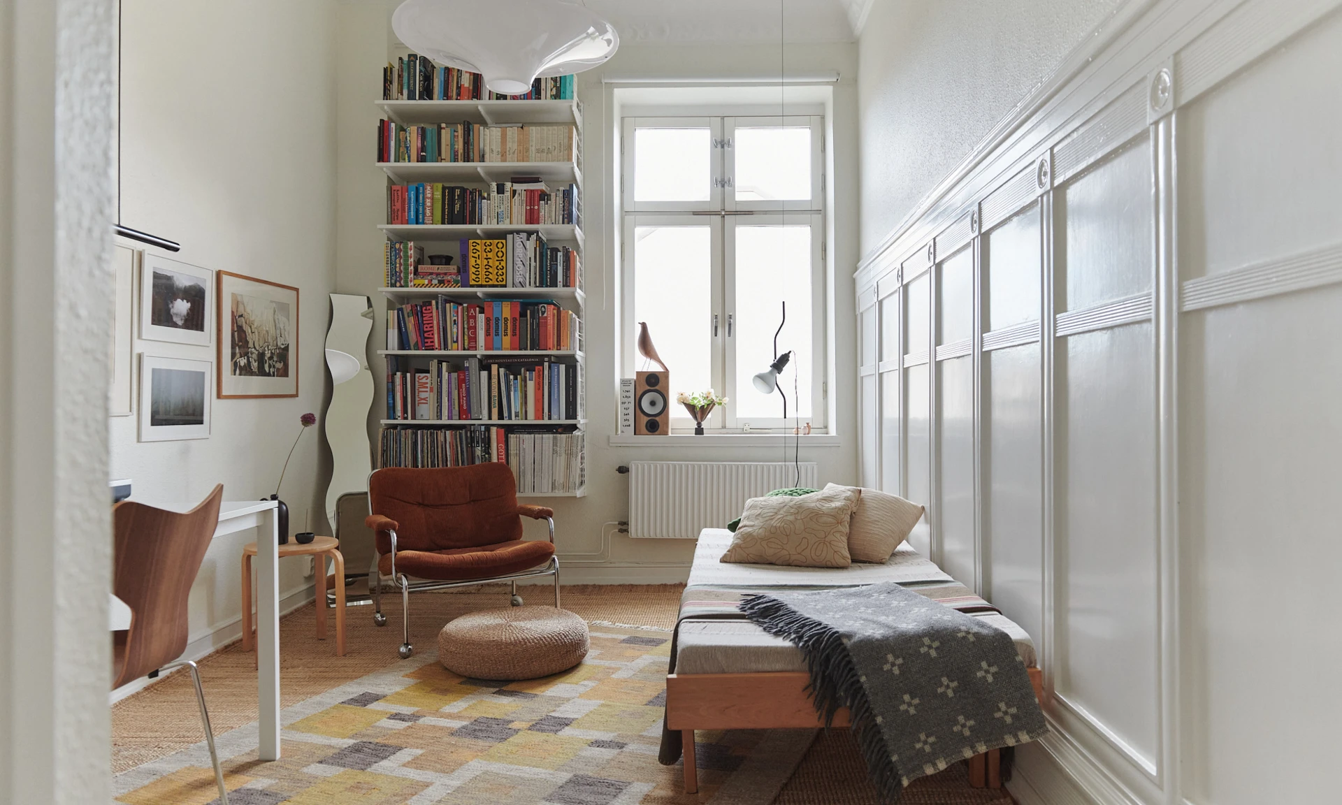 Det höga fönstret mot innergården släpper in rikligt med ljus. Väggarna pryds av en vacker spegelpanel som ger rummet karaktär. Rummet rymmer med lätthet en säng, skrivbord och fåtölj, vilket gör det perfekt som gästrum, arbetsrum eller kombinerat läsrum. Bakom dörren till vänster finns dessutom en praktisk klädkammare som erbjuder god förvaring. På golvet ligger laminat med trägolv under och väggarna är ljusa.
