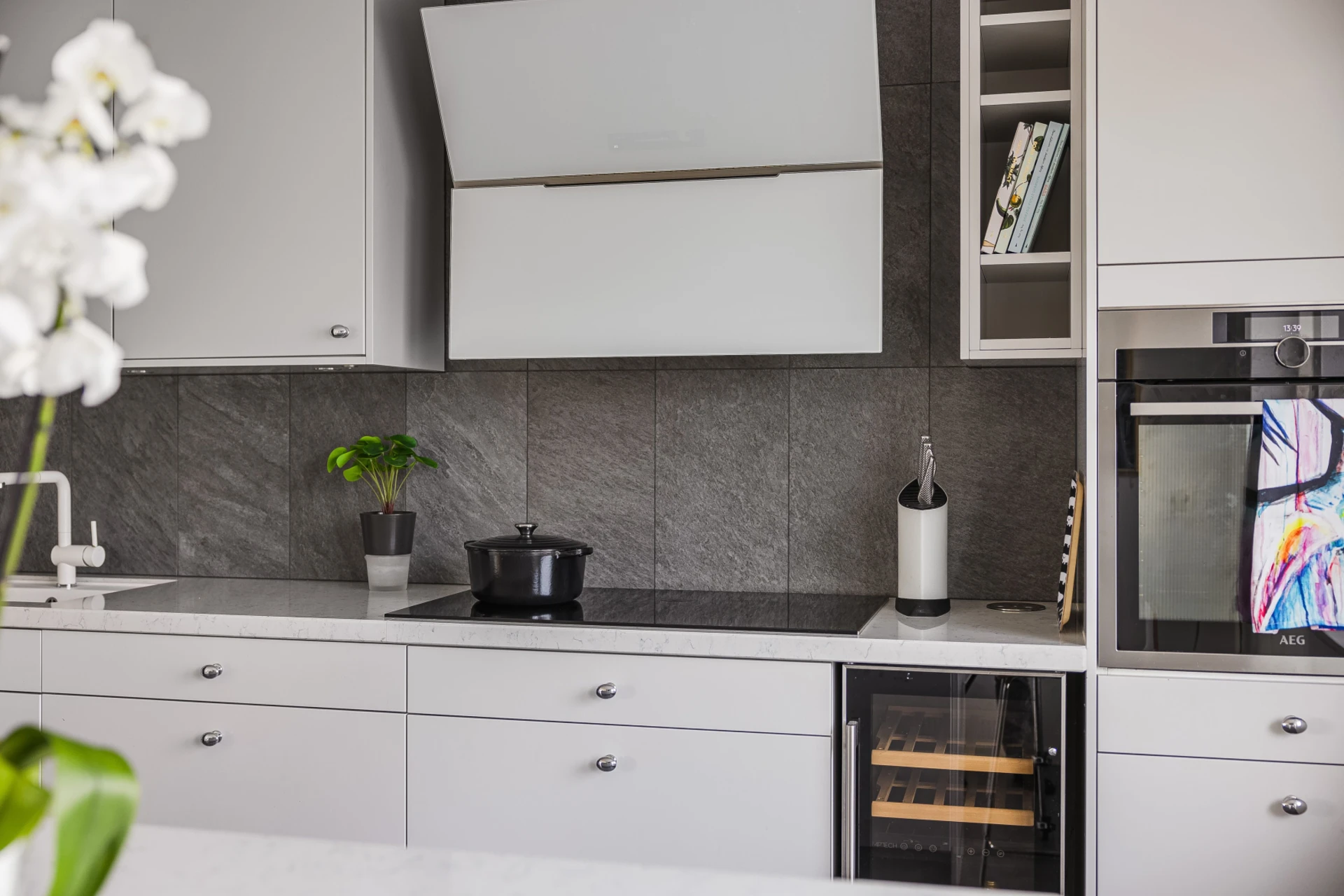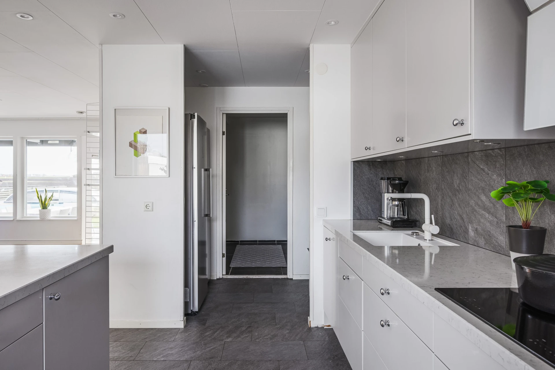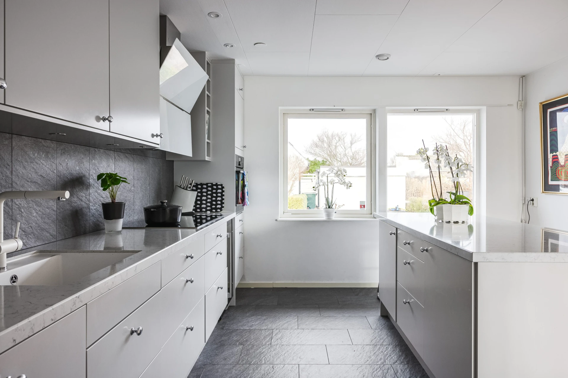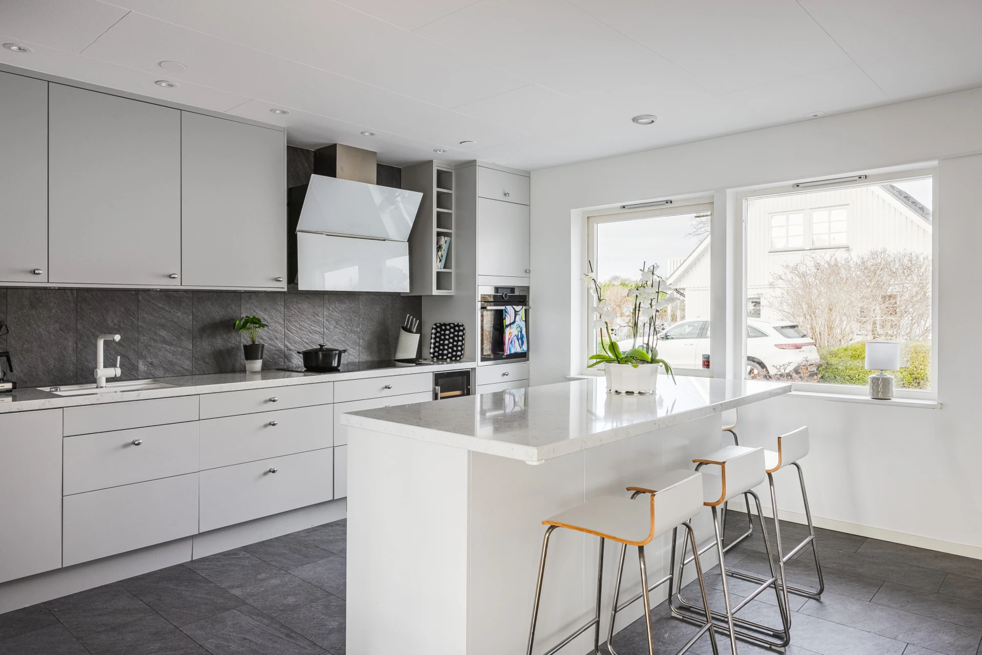 Klinker på golv och vita väggar. Vit köksinredning med kakel ovan bänkskiva i ljus komposit sten. Köket är utrustat med köksö samt induktionshäll, fläkt, vask, integrerad diskmaskin, kyl och frys, vinkyl, inbyggd ugn samt mikrovågsugn. Öppet mot matplats/vardagsrum.