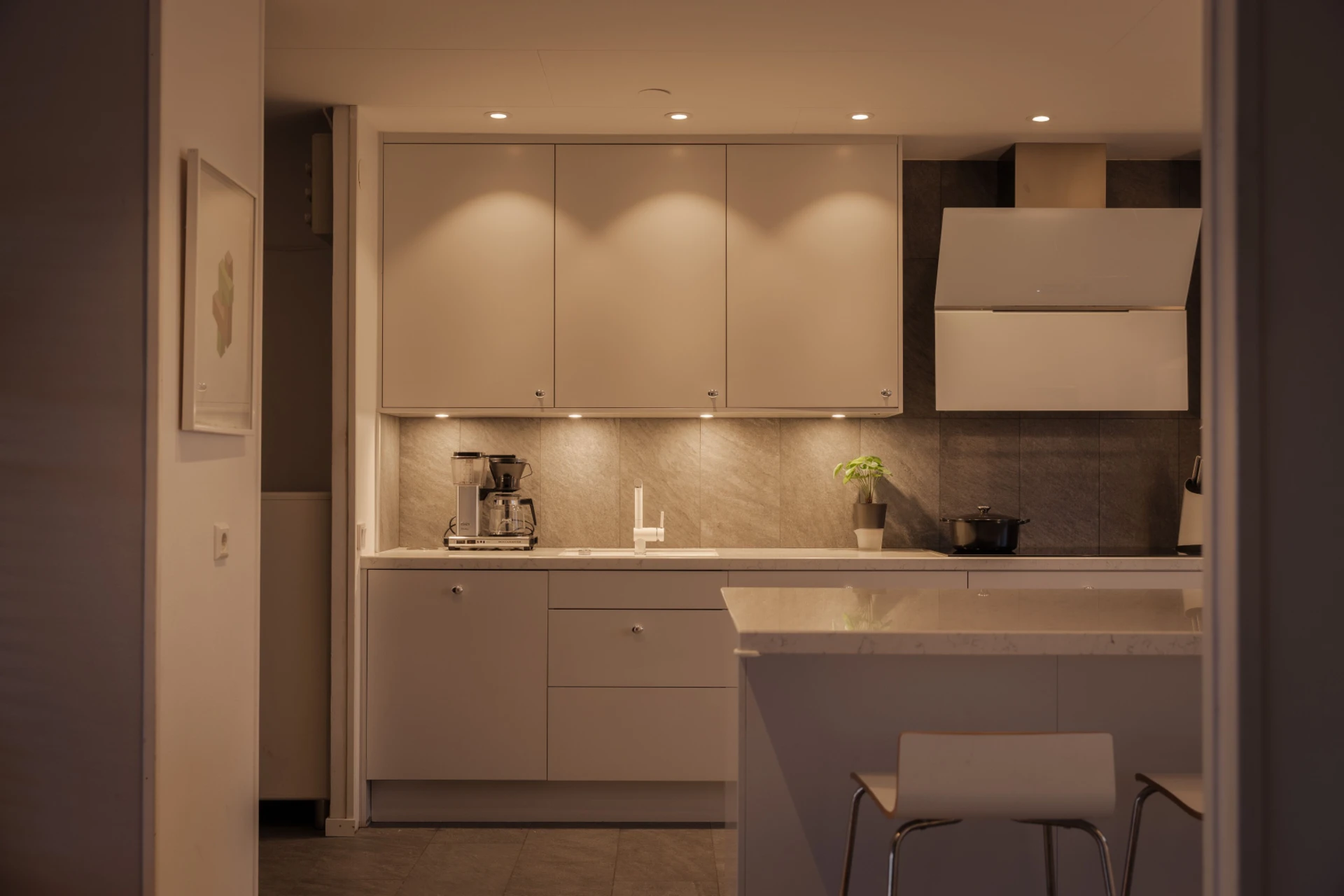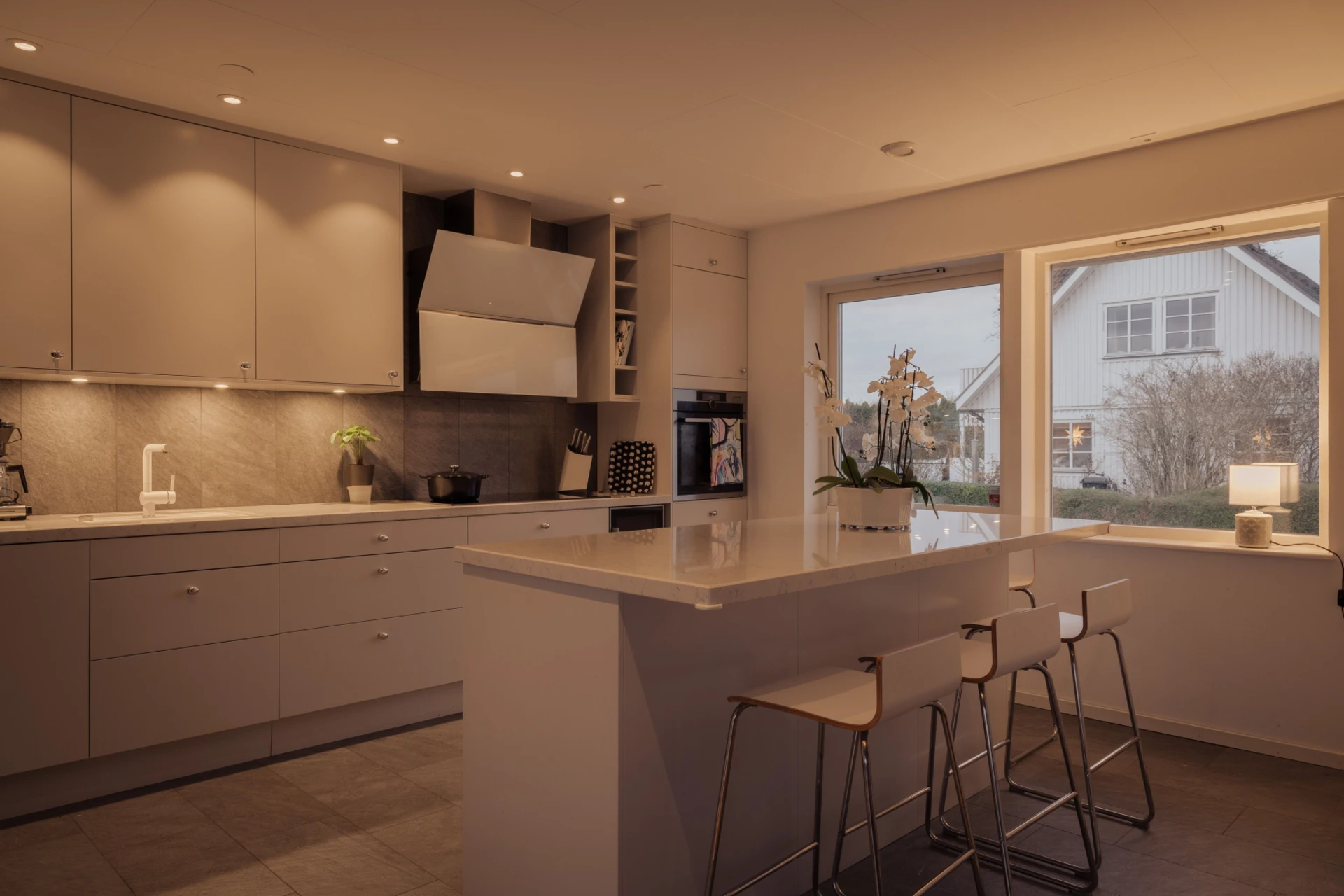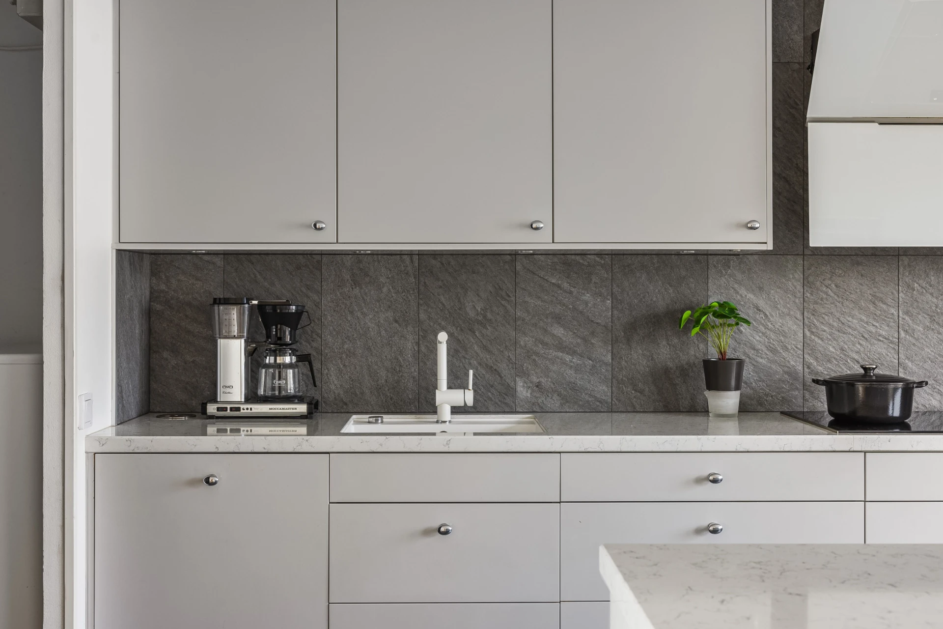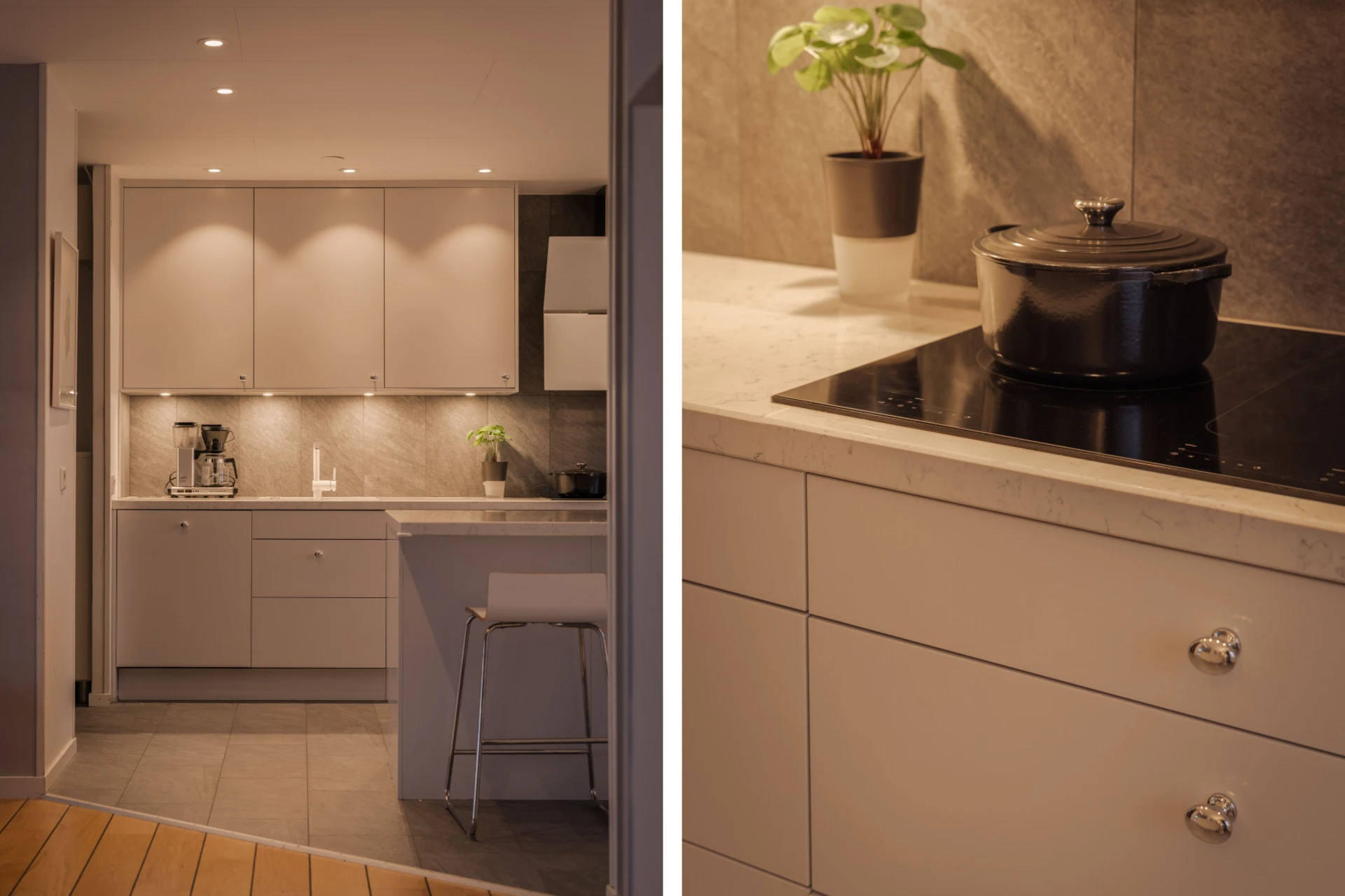 Klinker på golv och vita väggar. Vit köksinredning med kakel ovan bänkskiva i ljus komposit sten. Köket är utrustat med köksö samt induktionshäll, fläkt, vask, integrerad diskmaskin, kyl och frys, vinkyl, inbyggd ugn samt mikrovågsugn. Öppet mot matplats/vardagsrum.