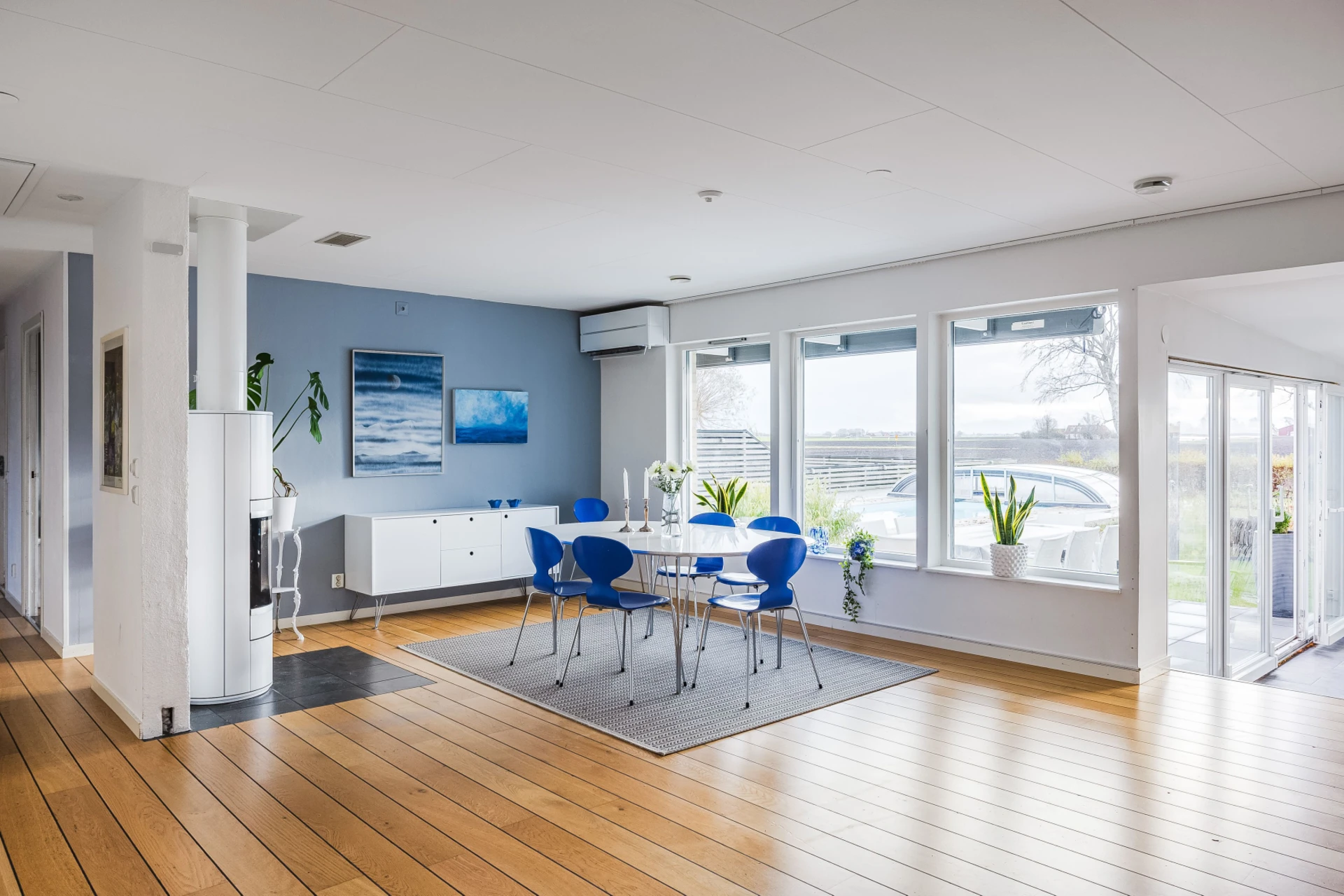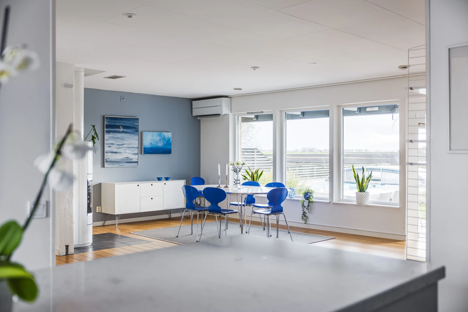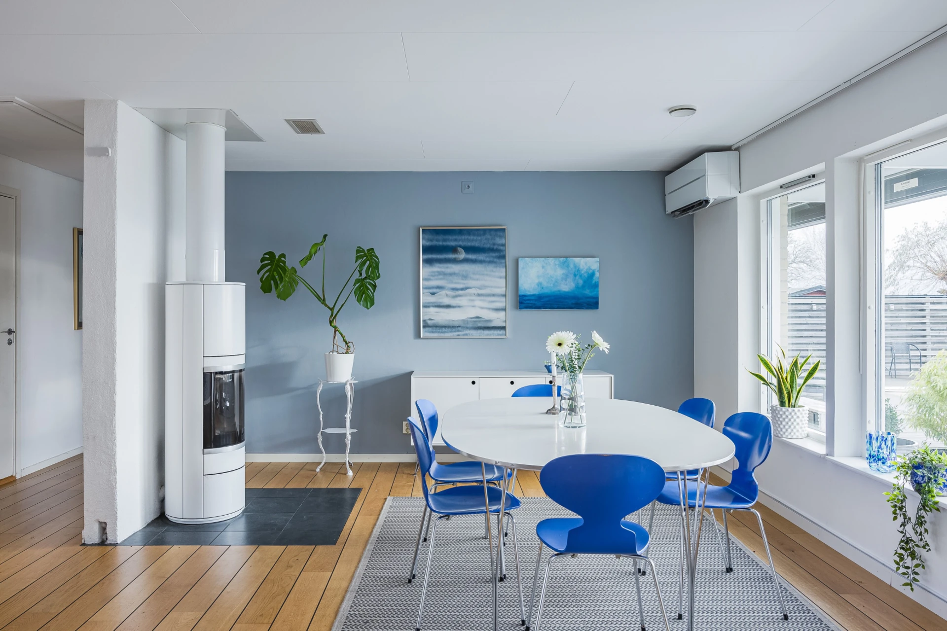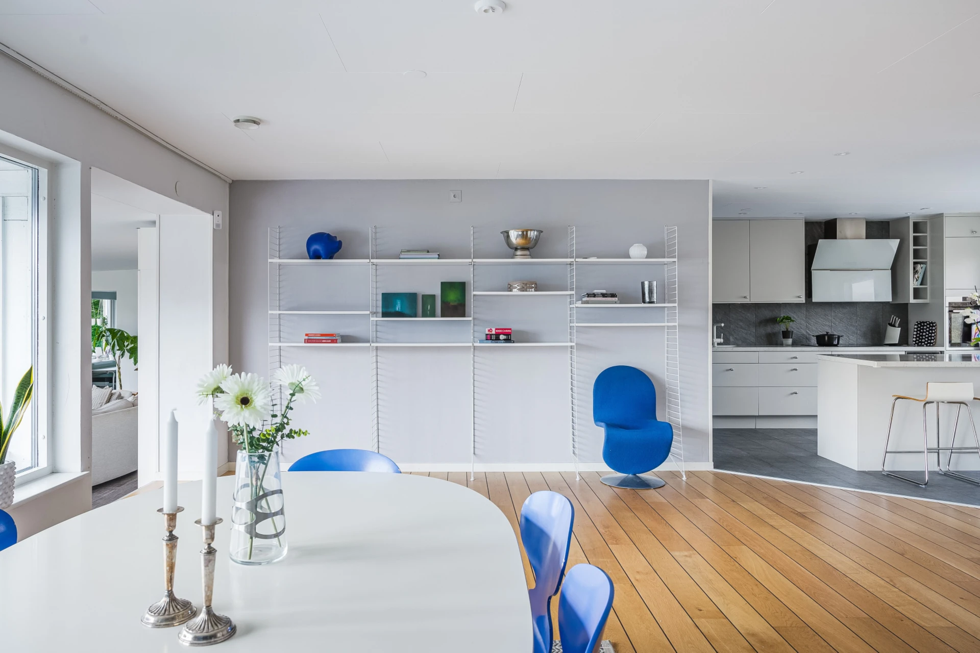 Parkett på golv och ljusa väggar samt en fondväg i blå färg, mycket fönster för bra ljusinsläpp. Öppen planlösning mot kök och vardagsrum.