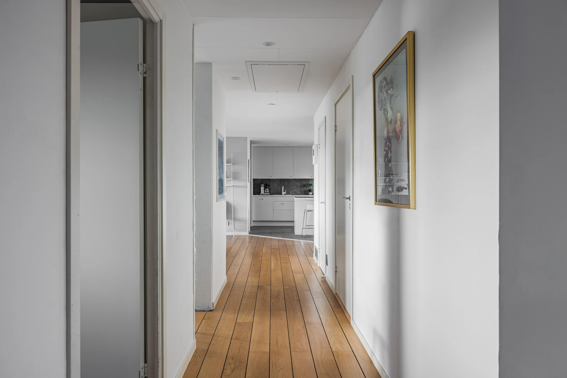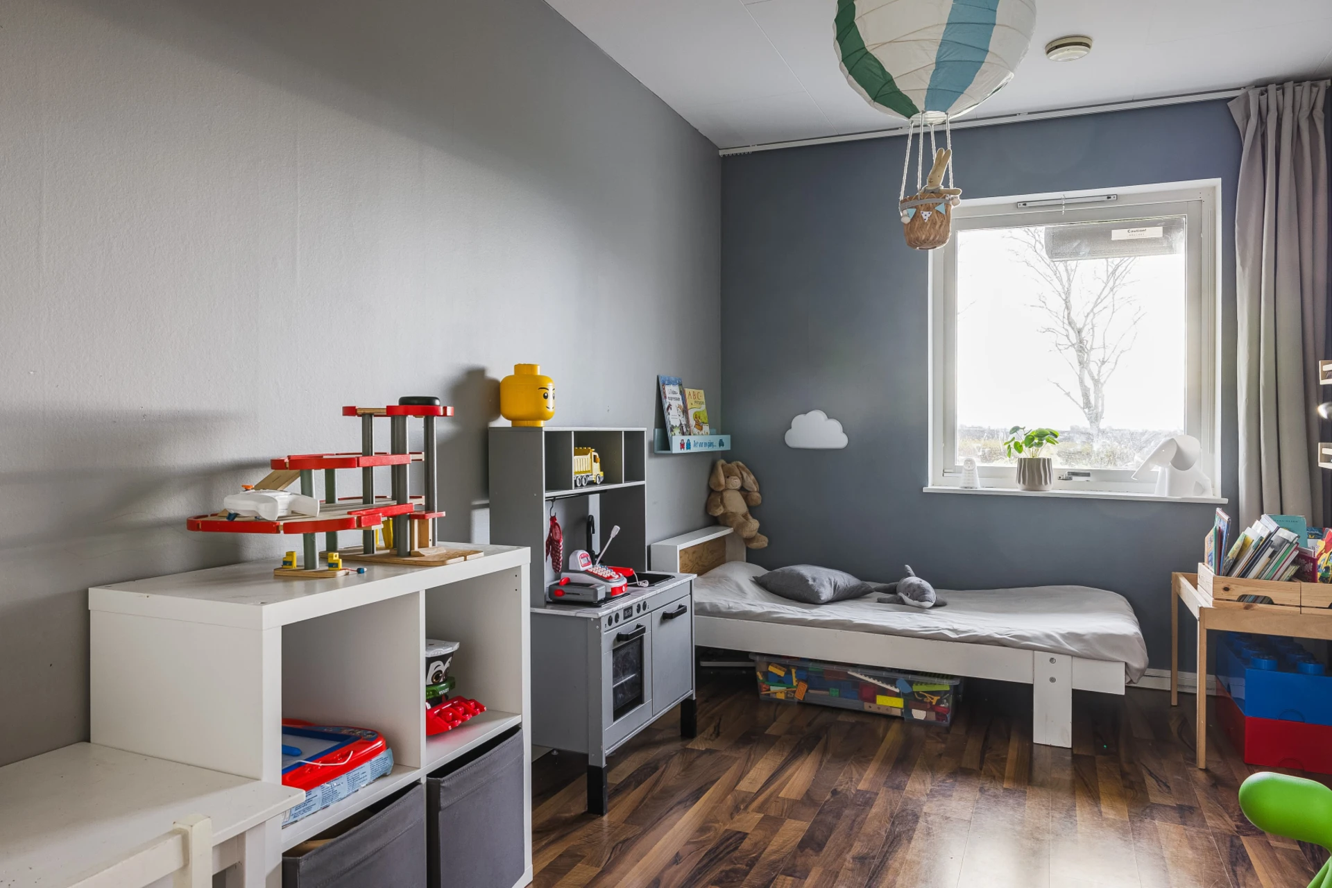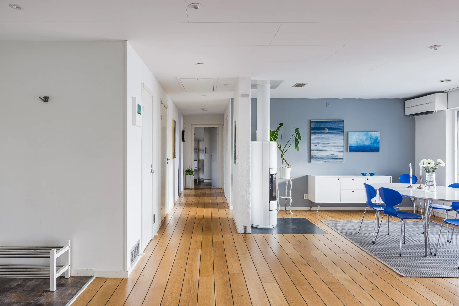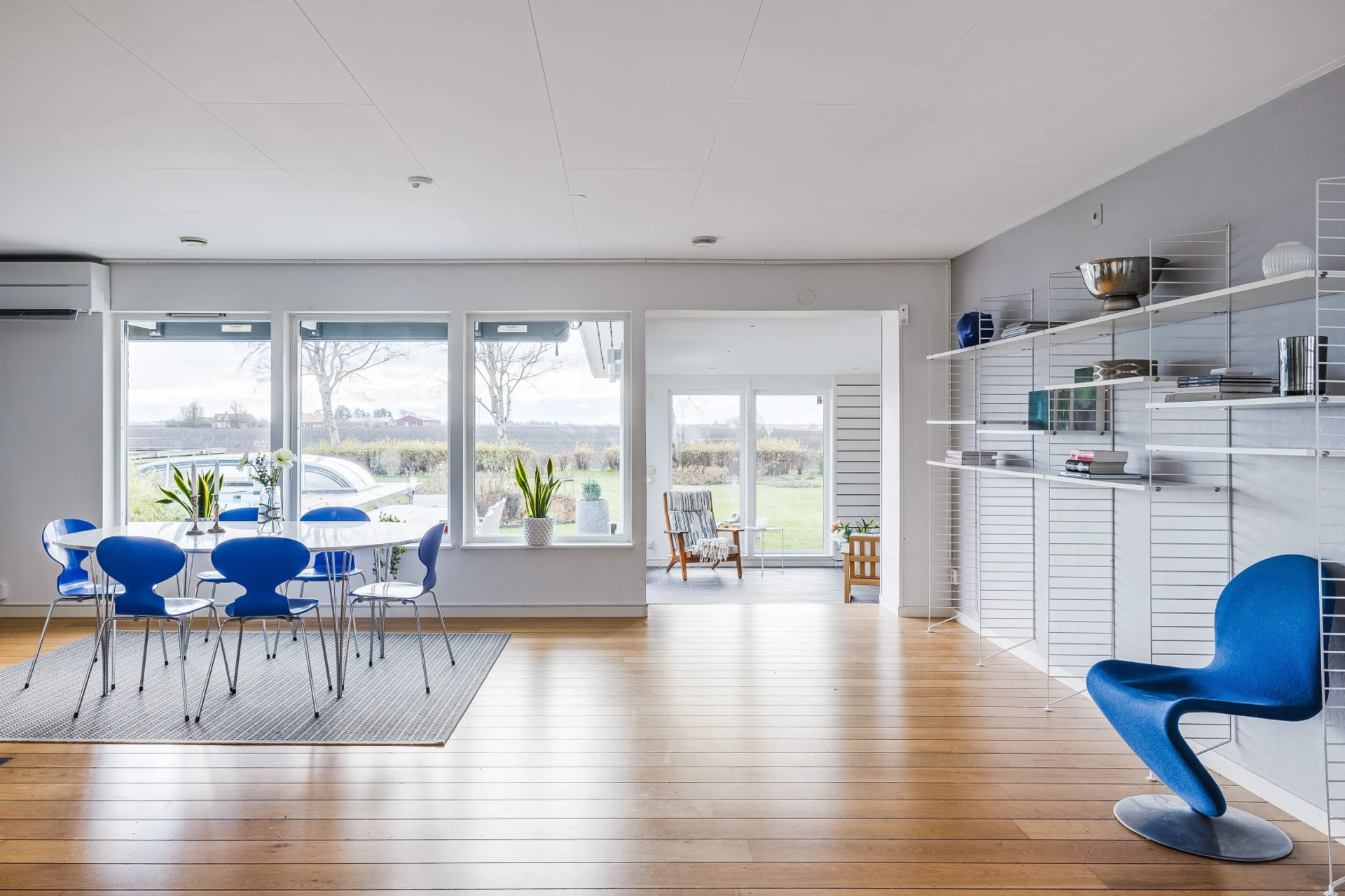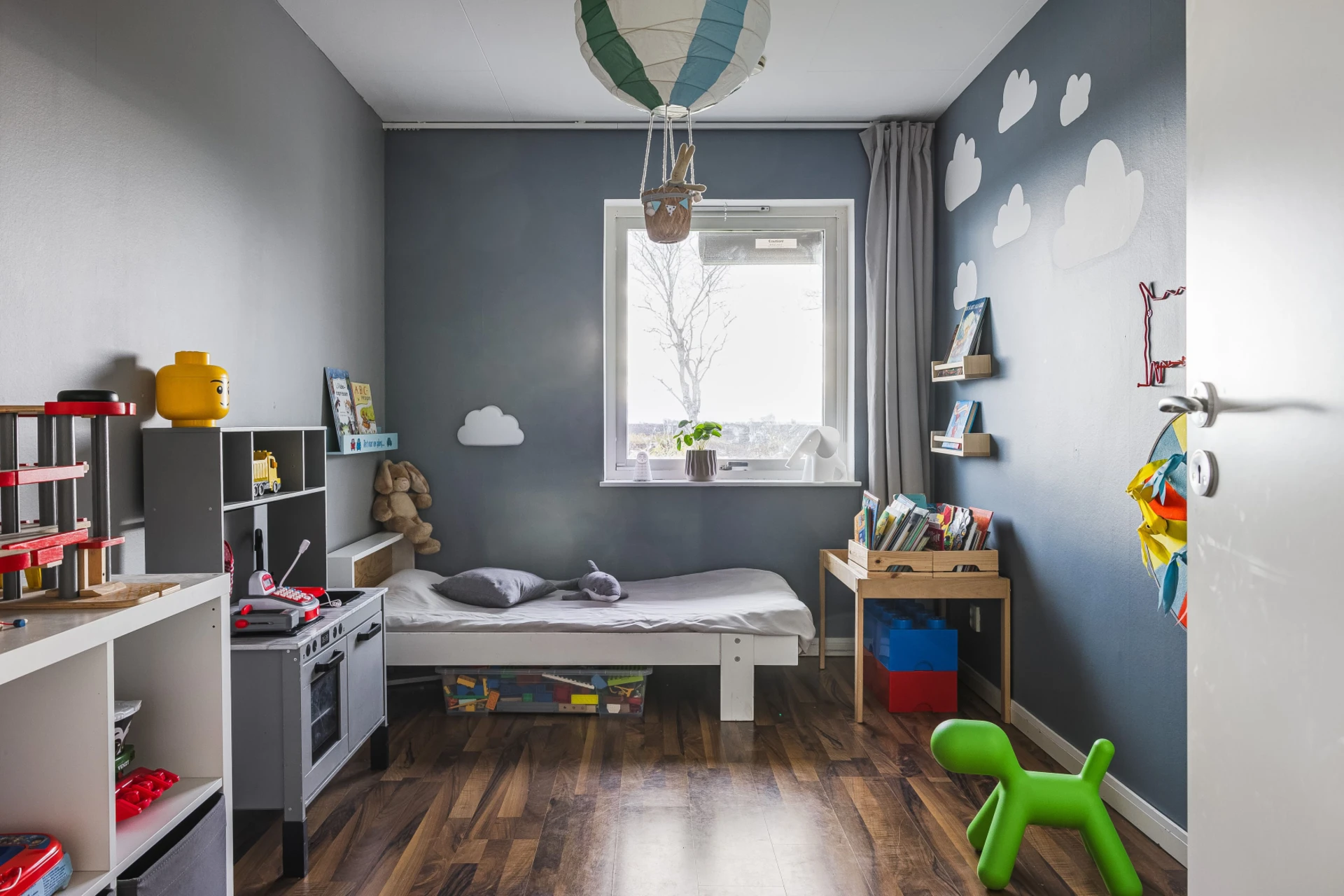 Parkett på golv och ljusa väggar samt en fondväg i blå färg, mycket fönster för bra ljusinsläpp. Öppen planlösning mot kök och vardagsrum.