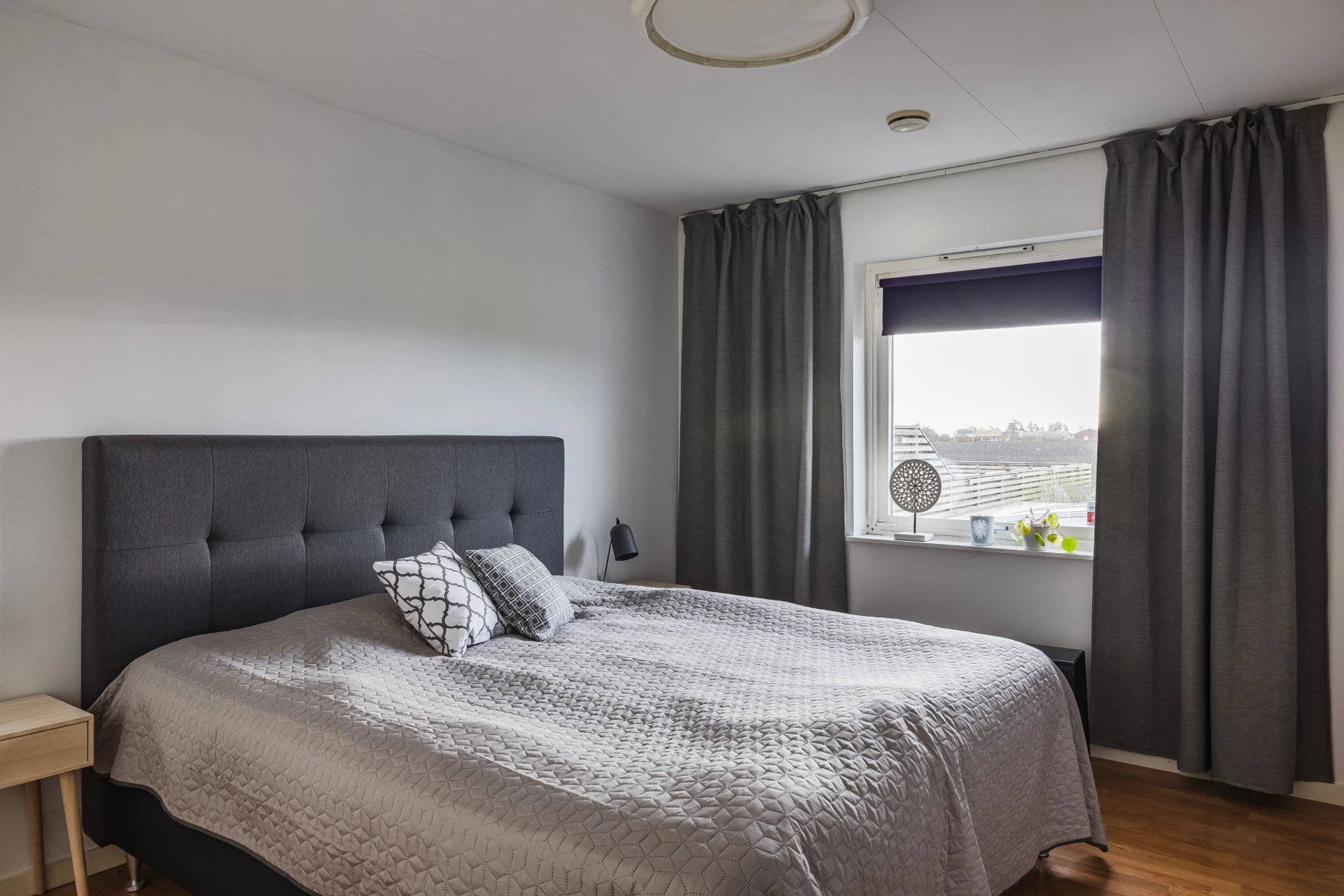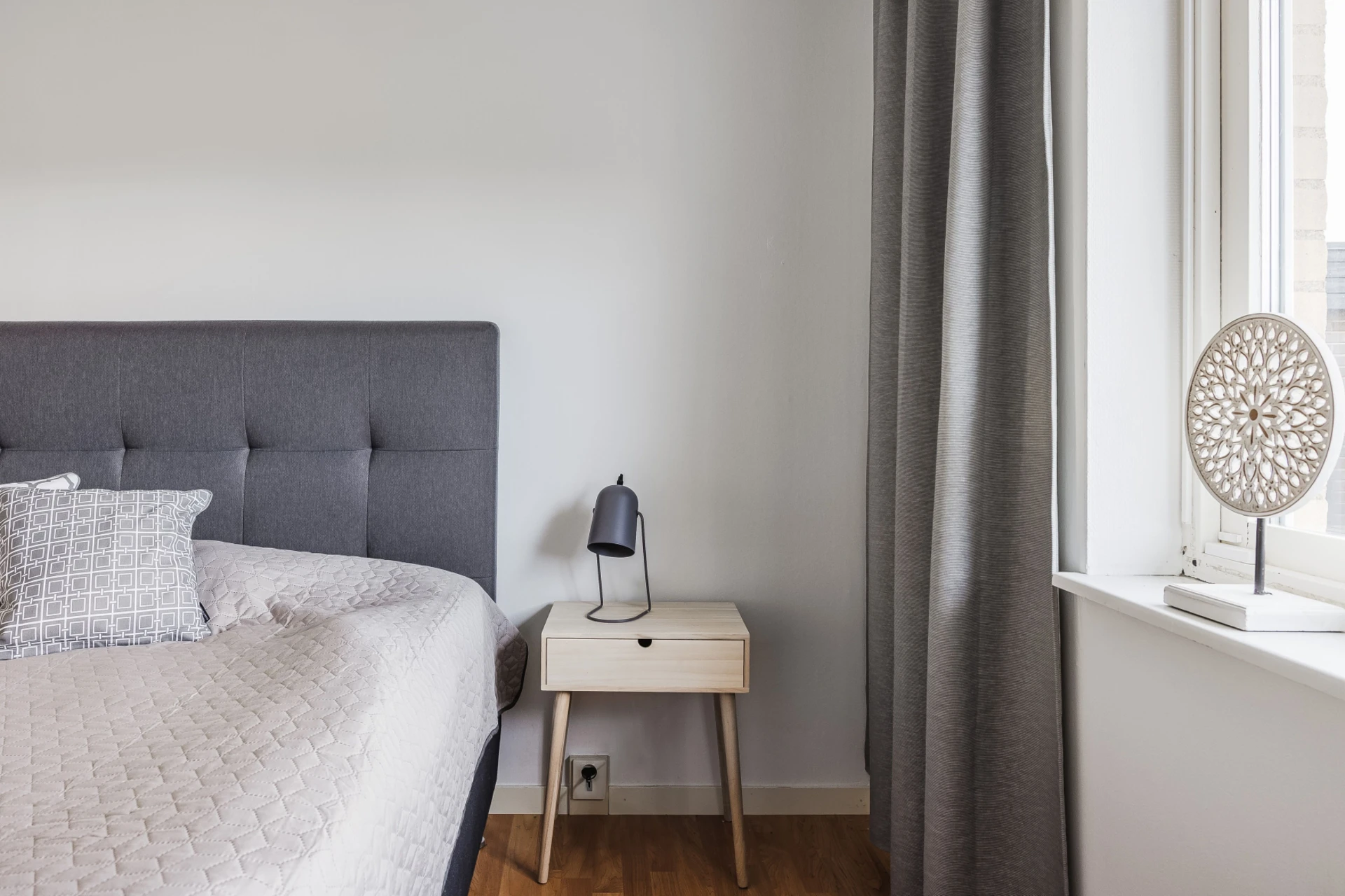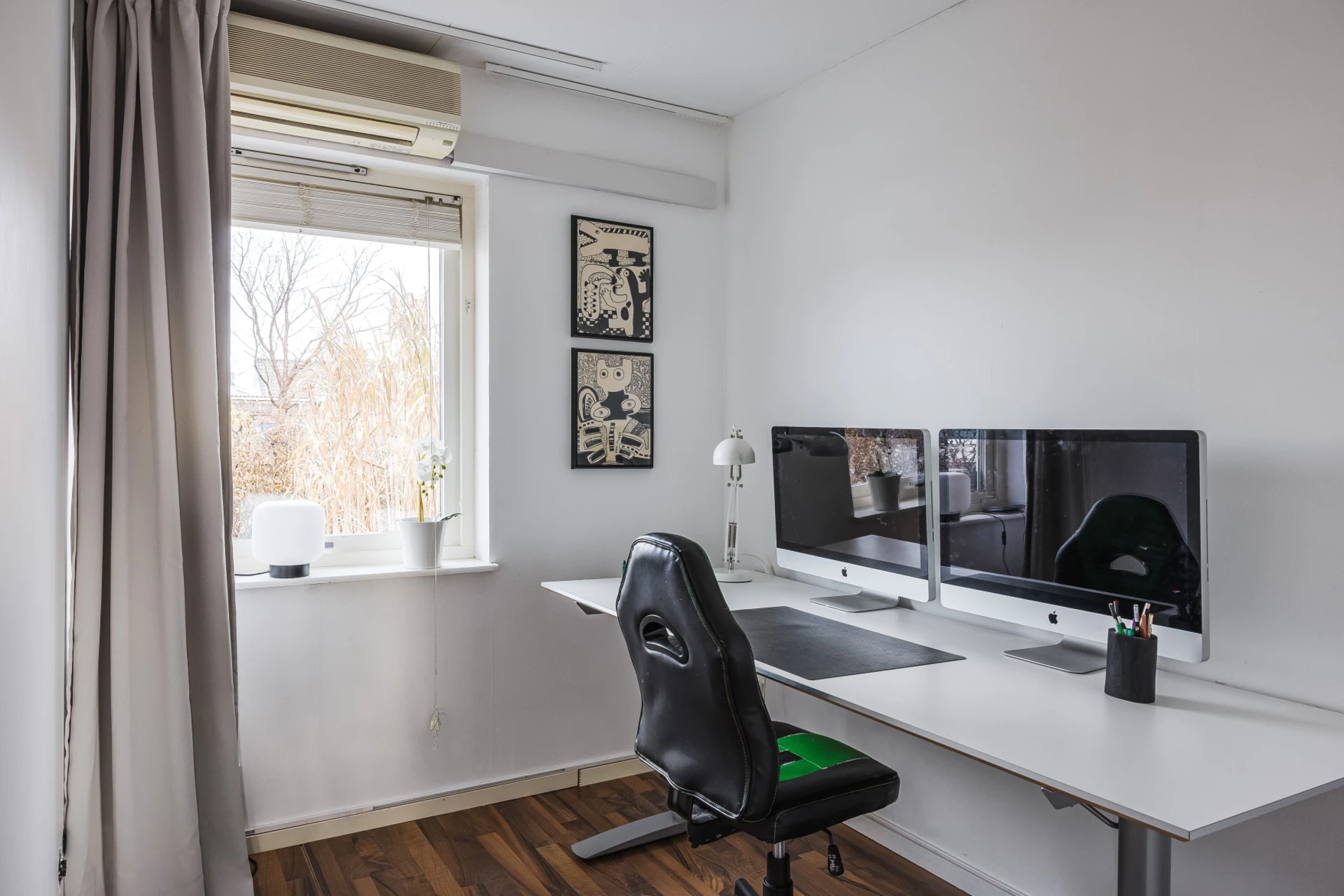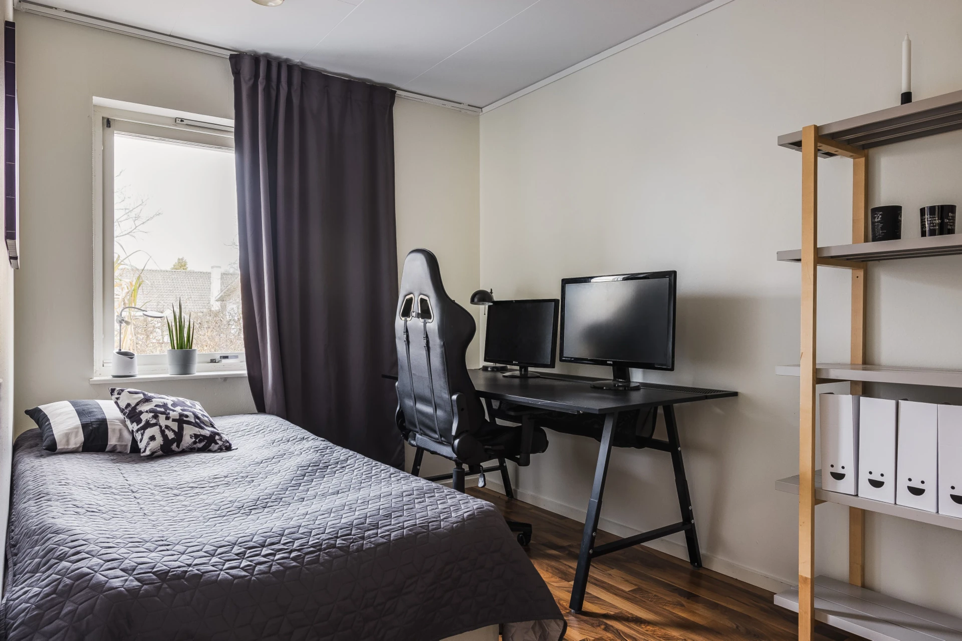Parkett på golv och ljusa väggar samt en fondväg i blå färg, mycket fönster för bra ljusinsläpp. Öppen planlösning mot kök och vardagsrum.