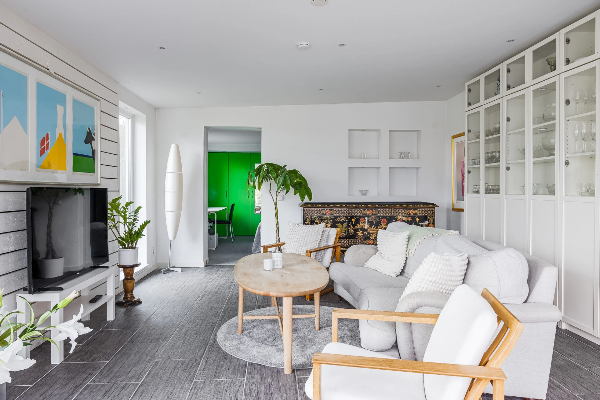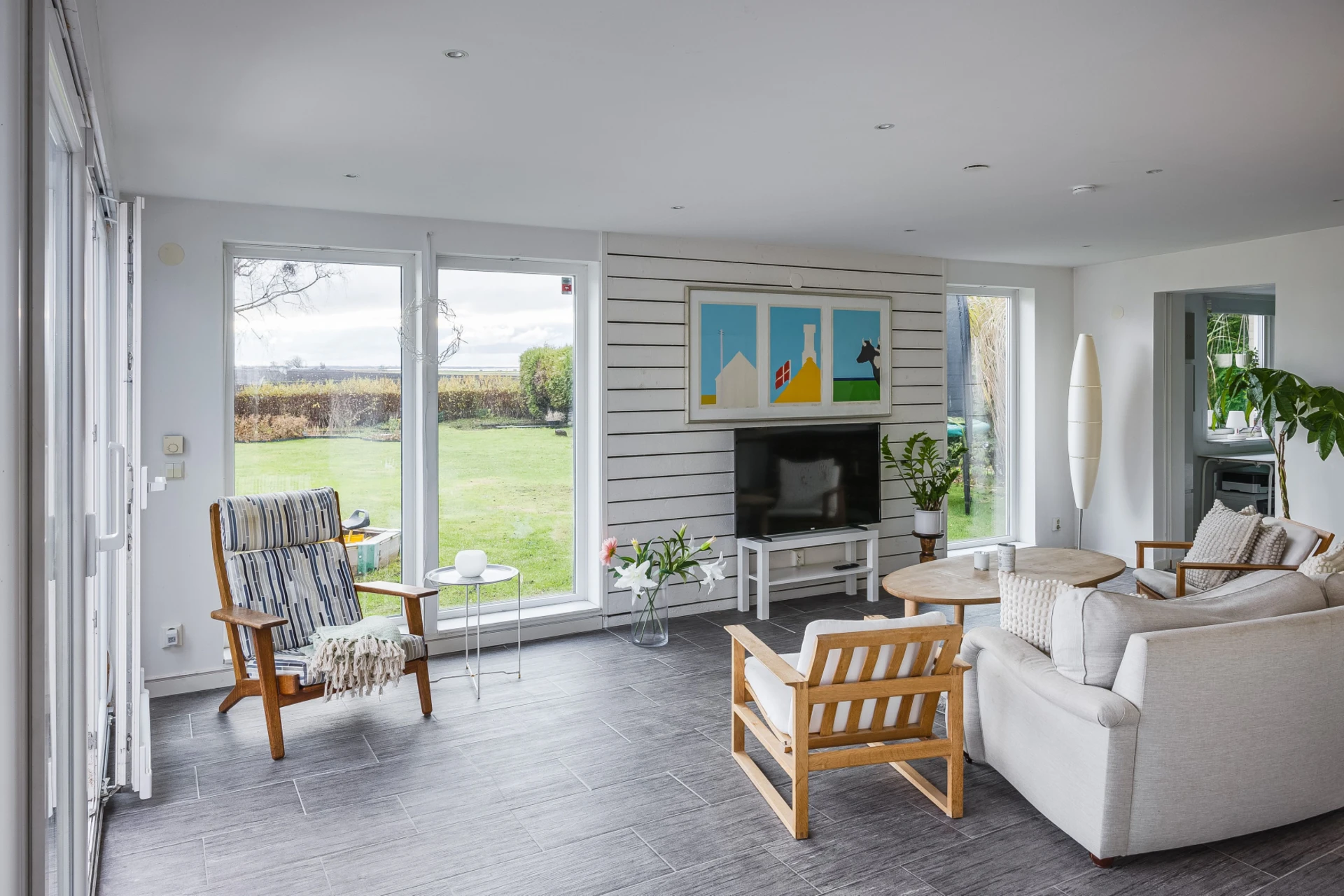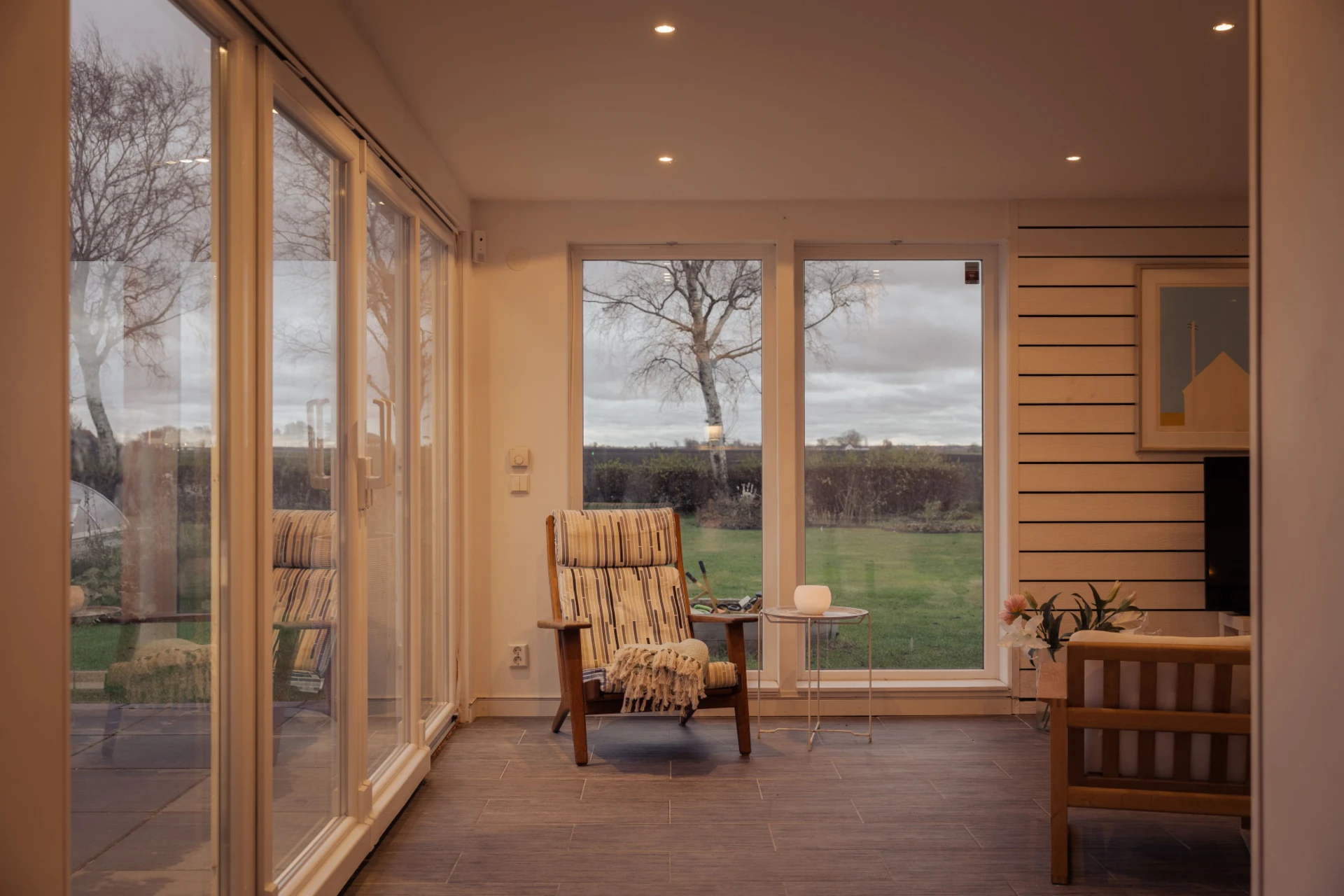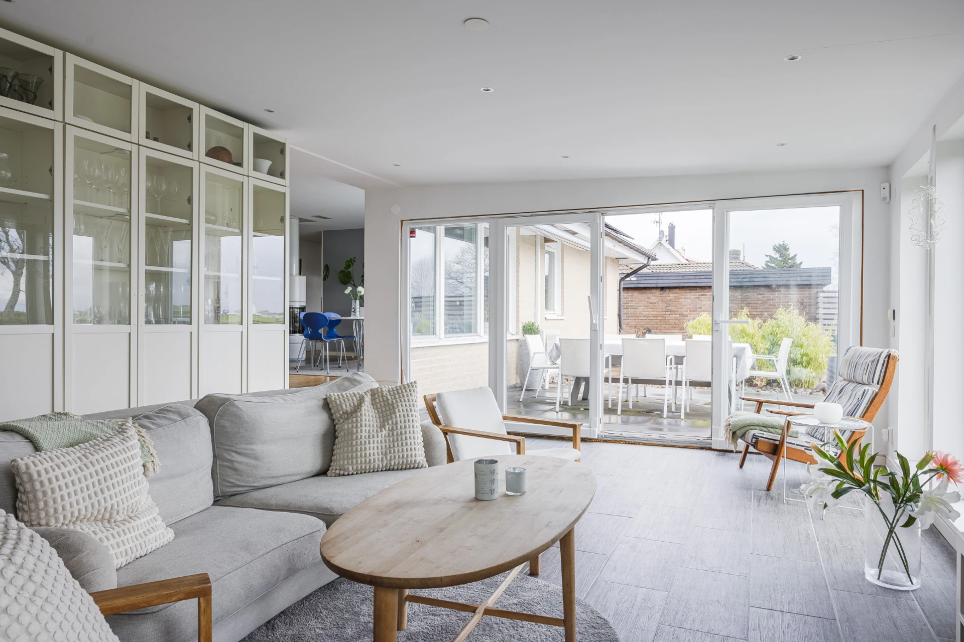 Klinker på golv och vita väggar, stort skjutpart ut mot trädgården.
