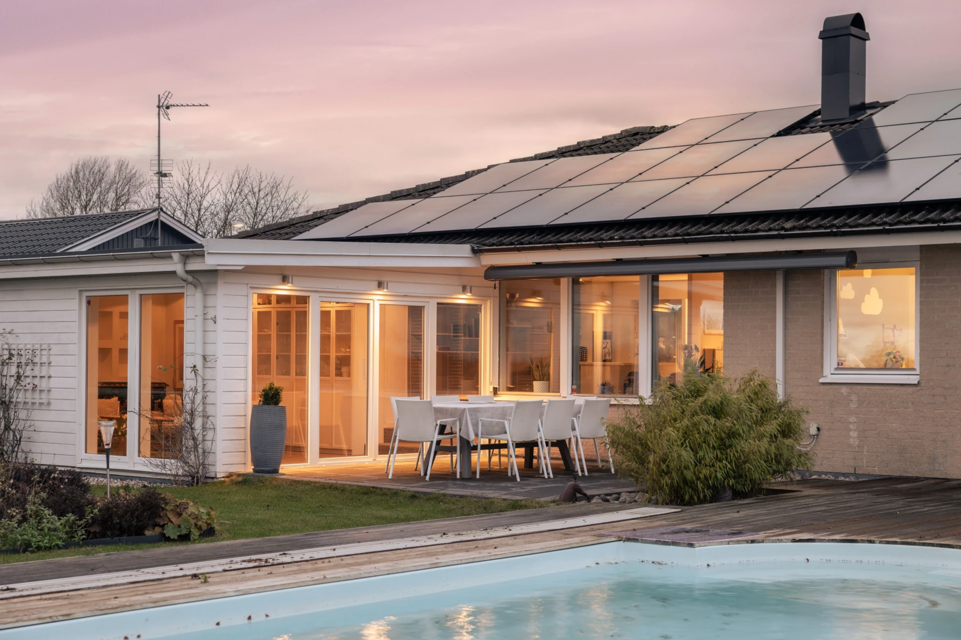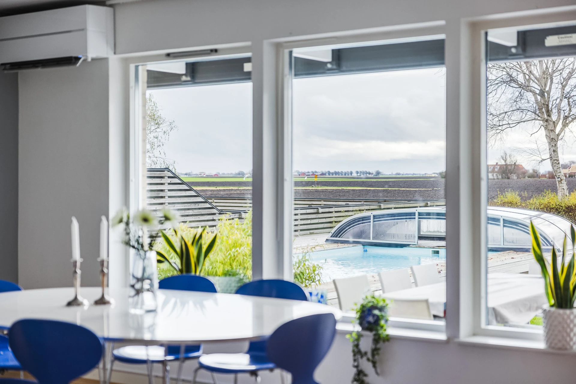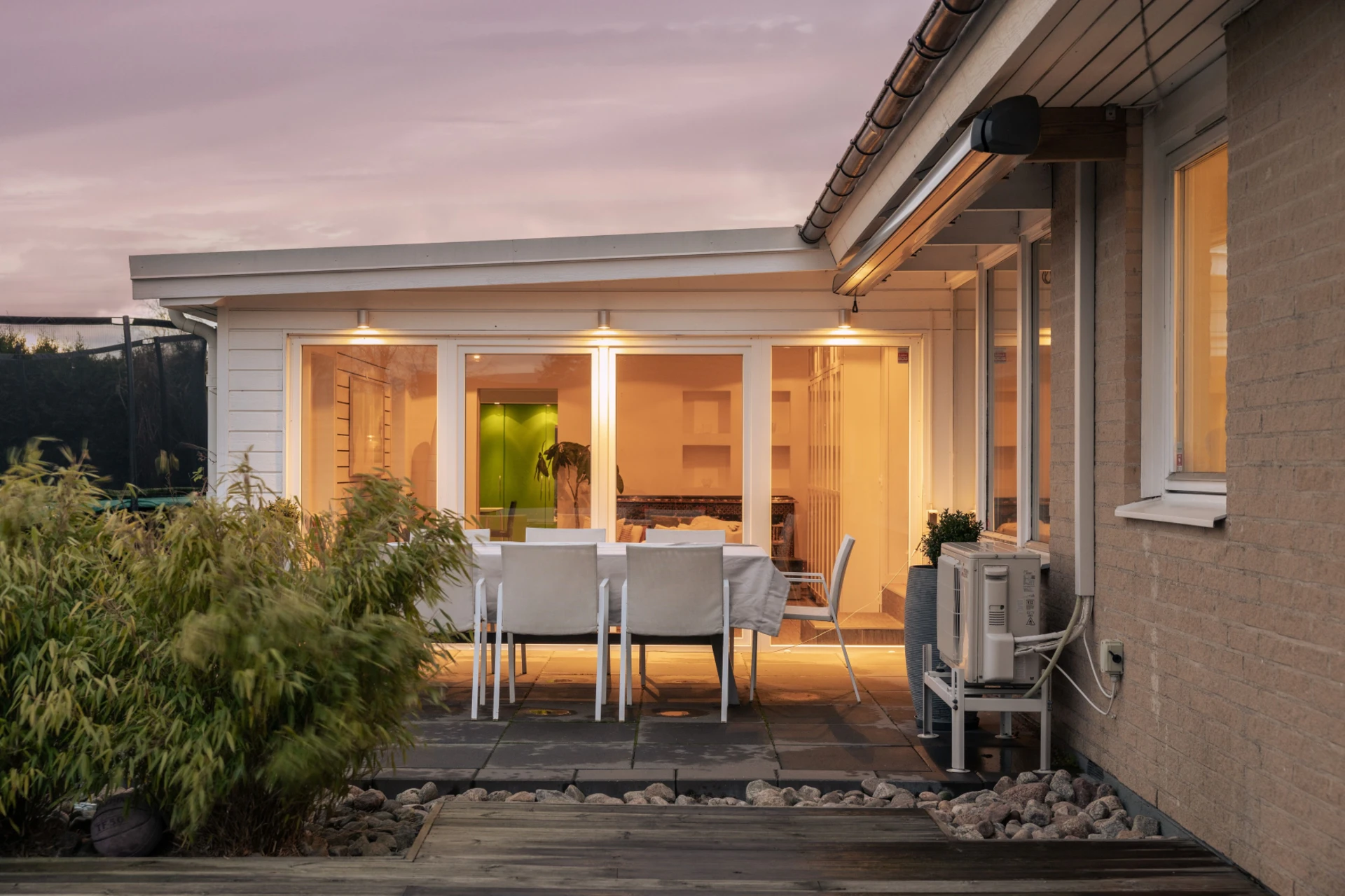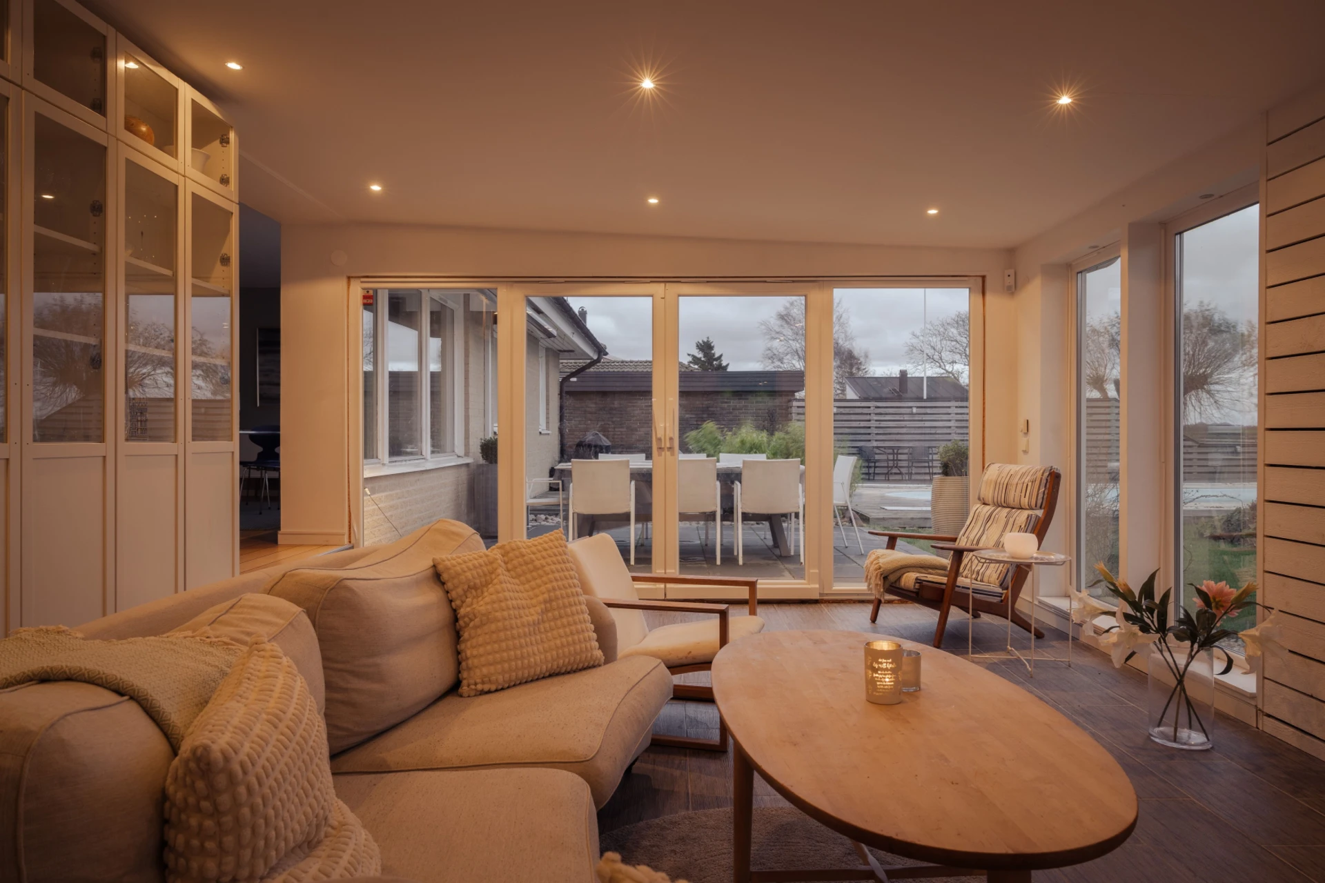 Klinker på golv och vita väggar, stort skjutpart ut mot trädgården.