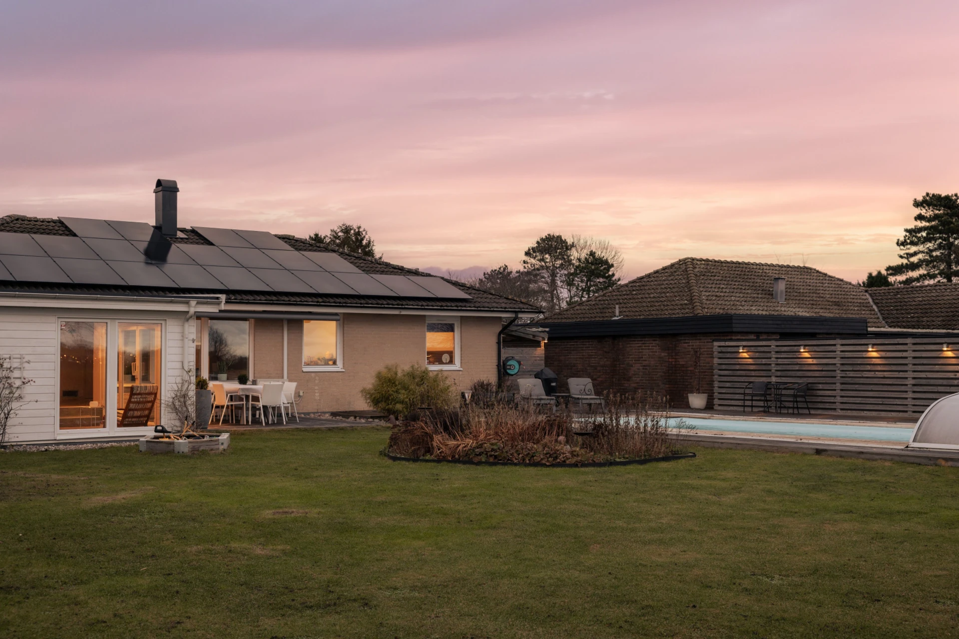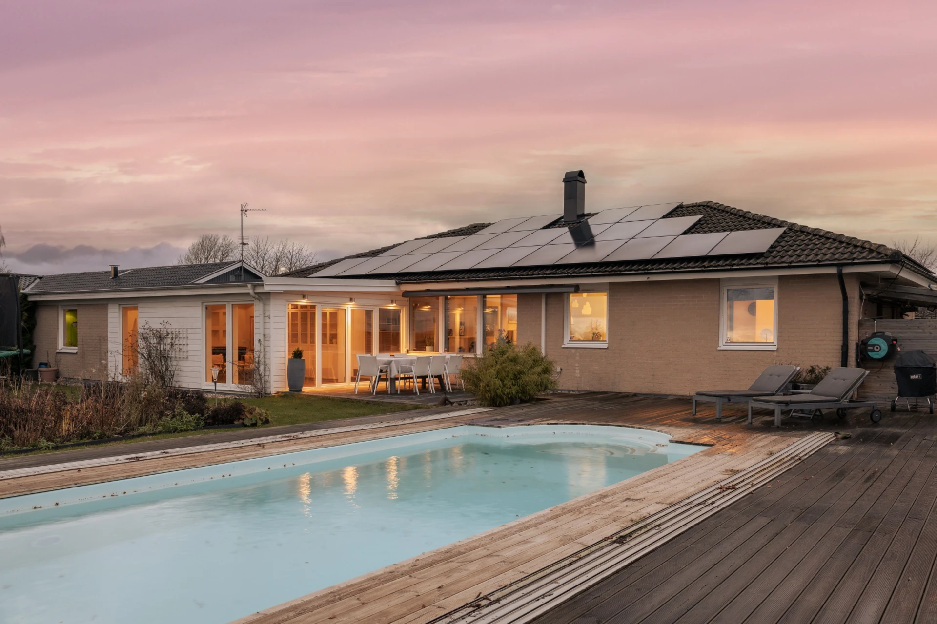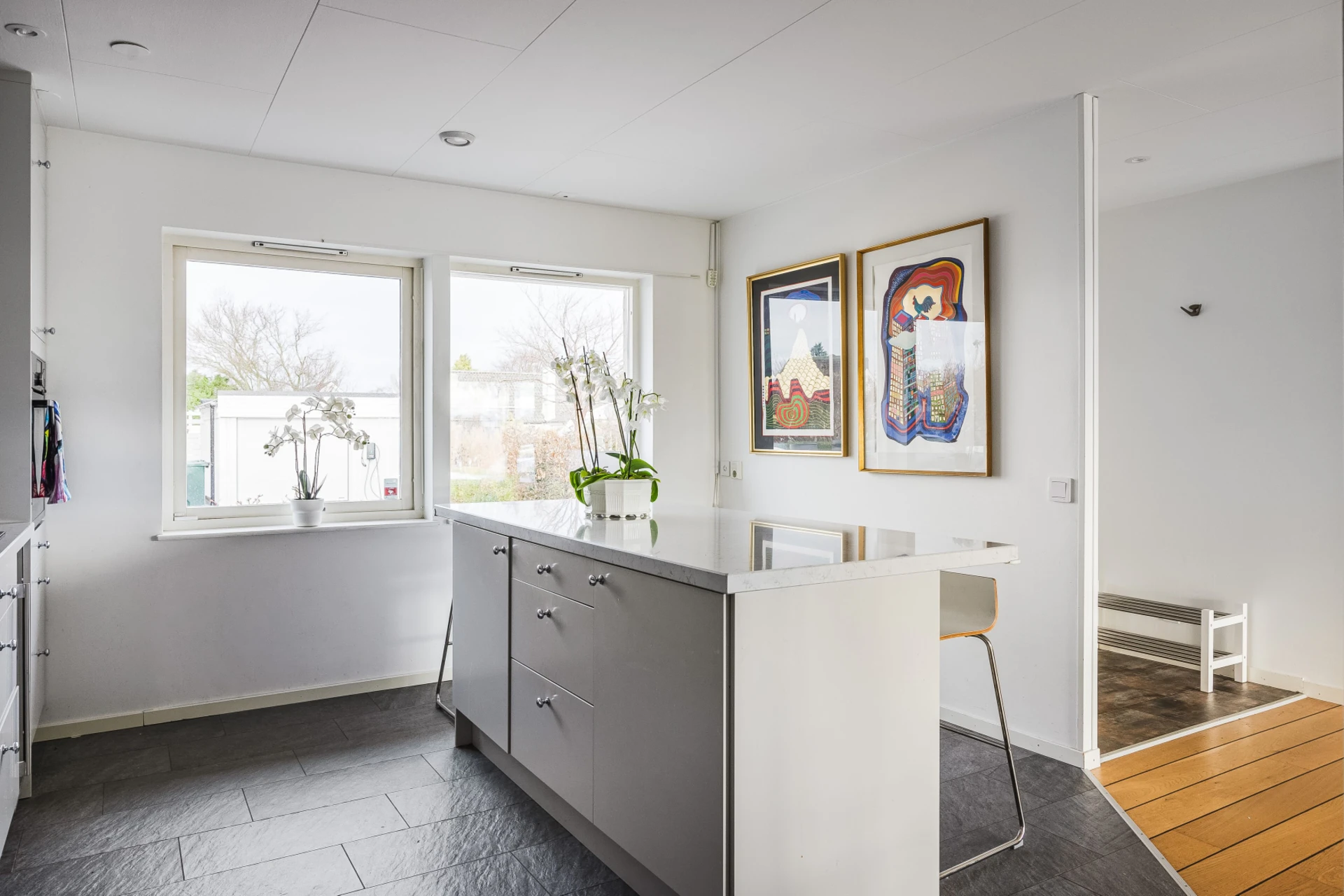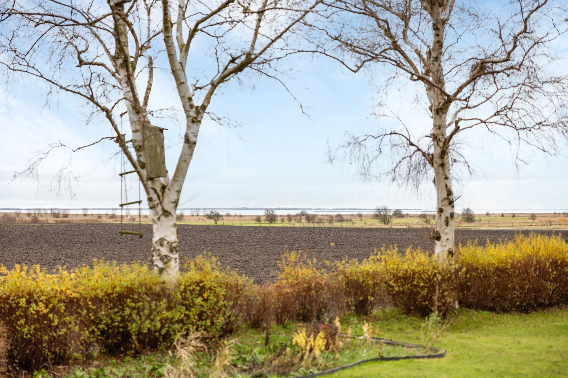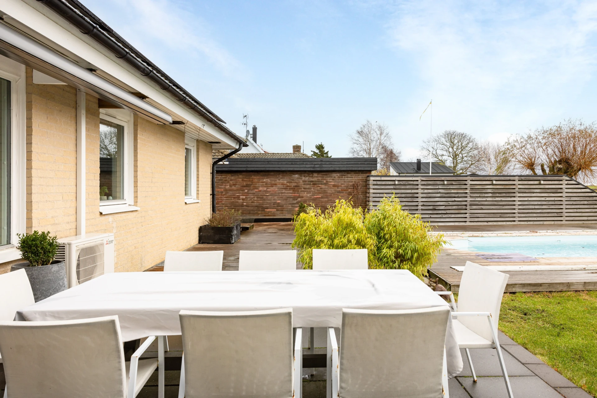 Klinker på golv och vita väggar, stort skjutpart ut mot trädgården.