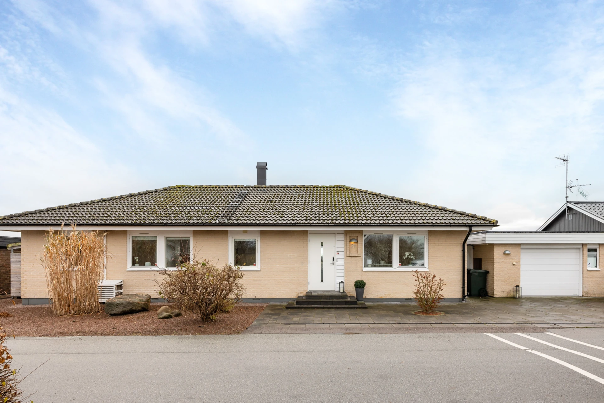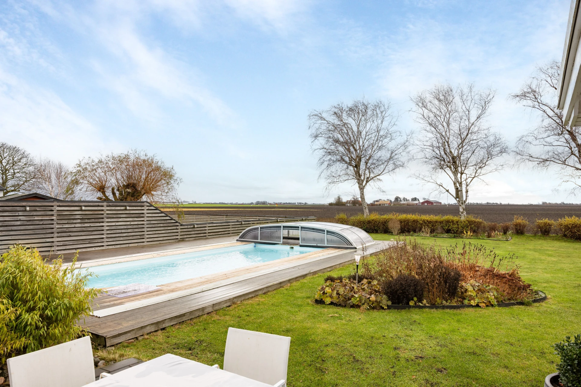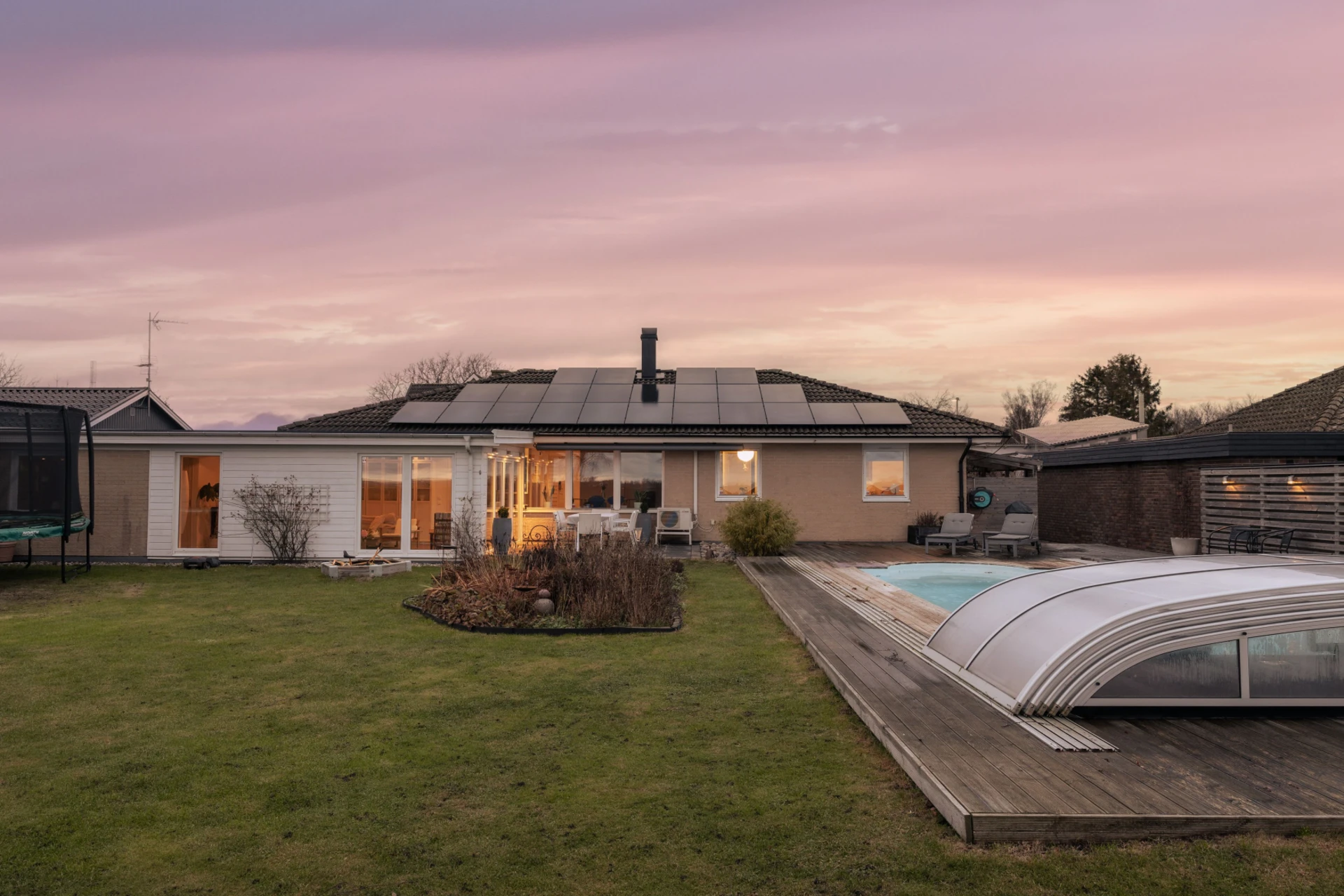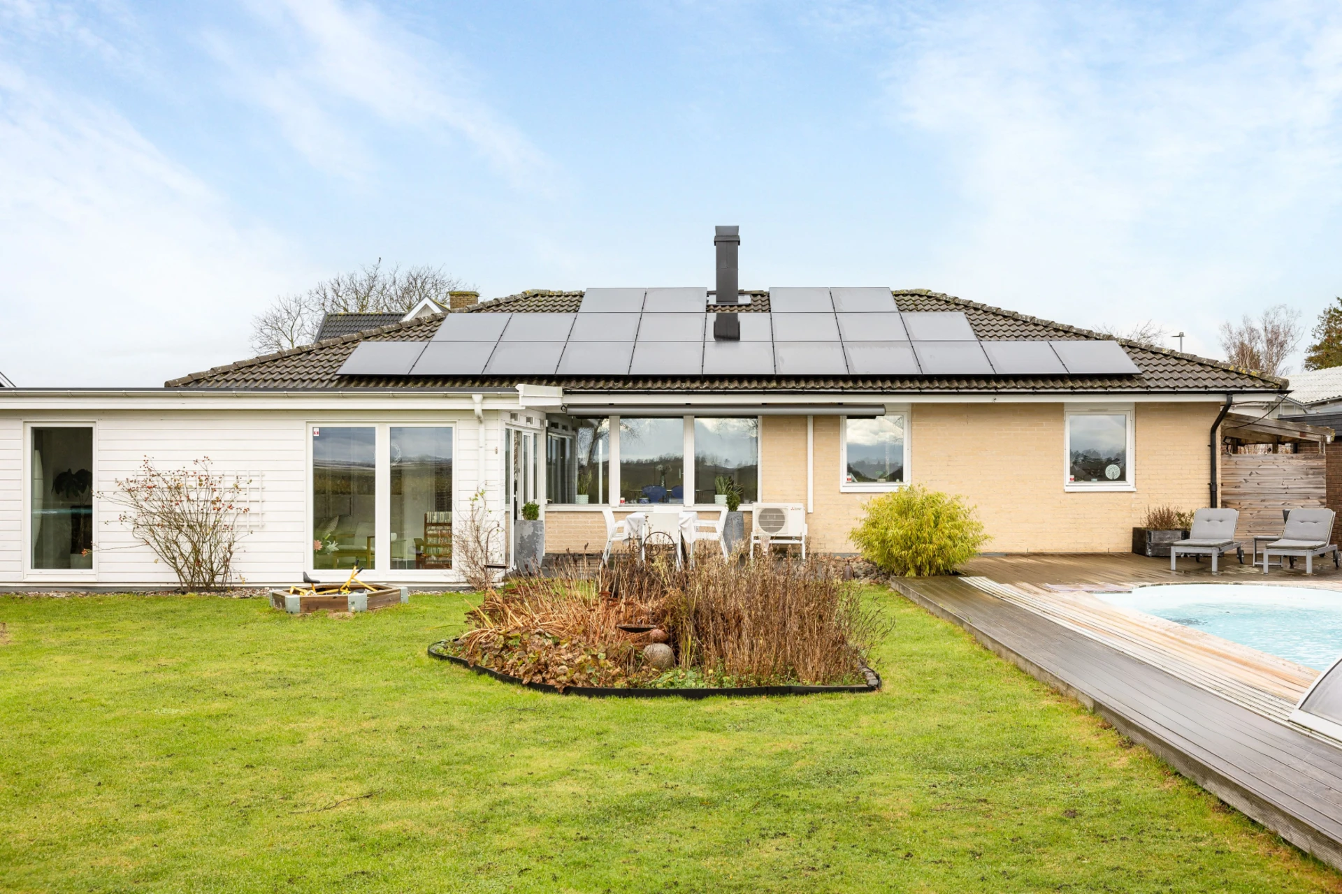 Klinker på golv och vita väggar, stort skjutpart ut mot trädgården.