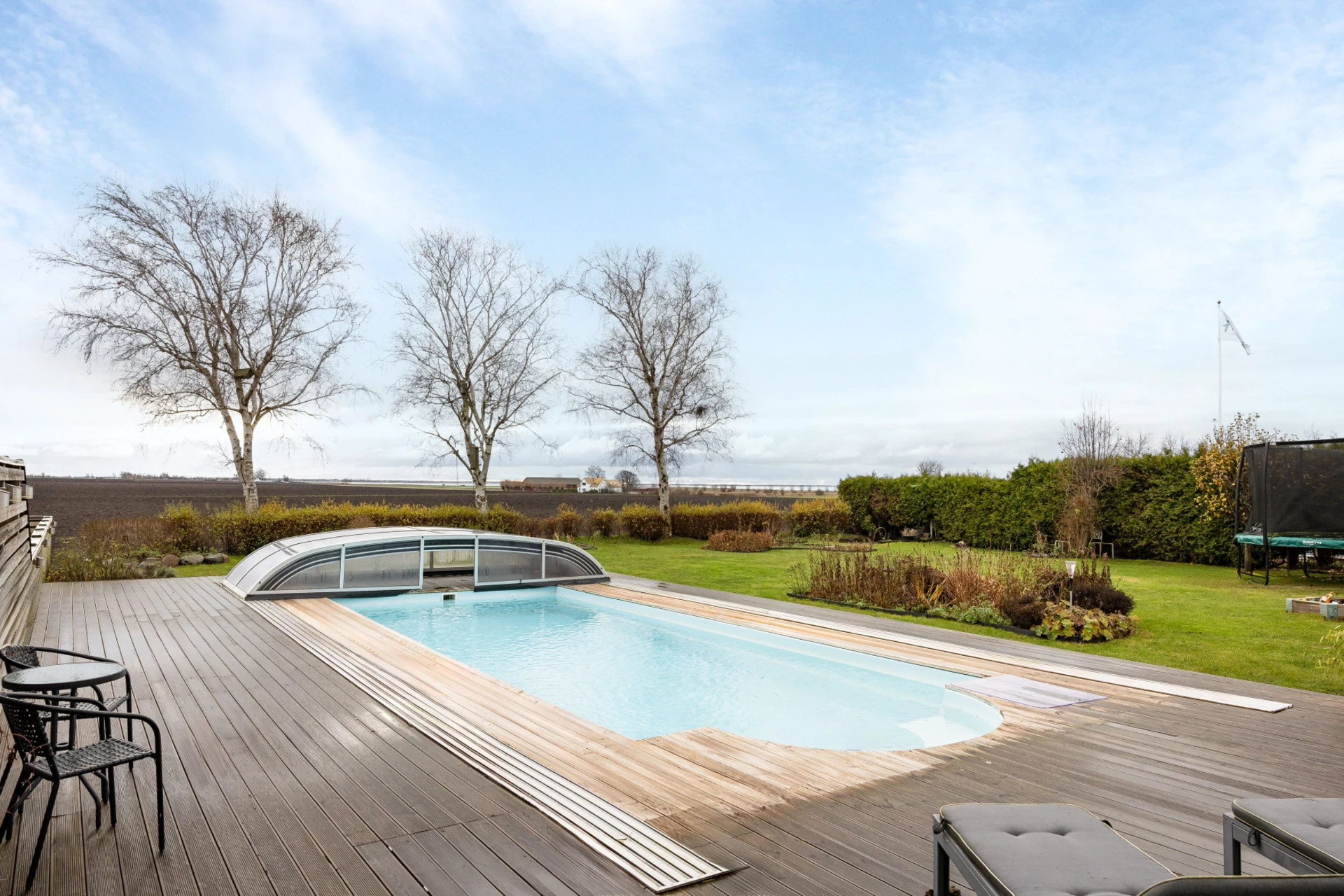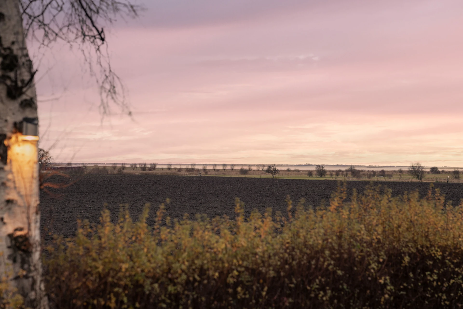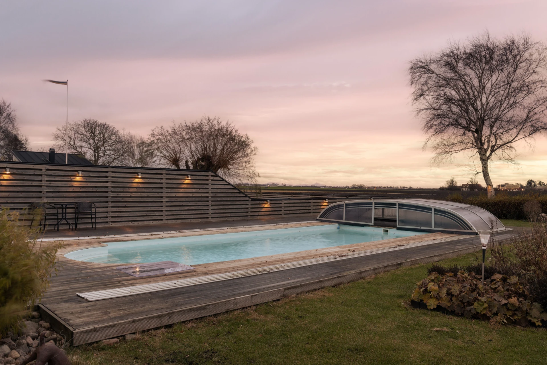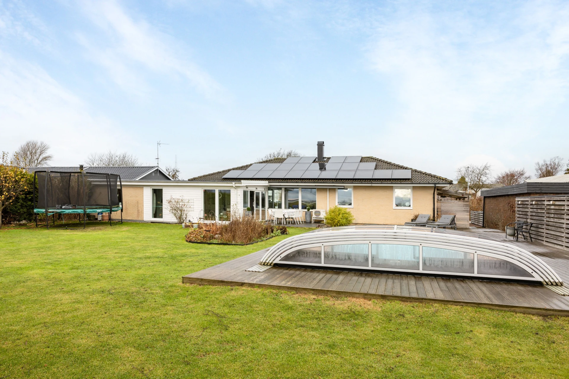 Klinker på golv och vita väggar, stort skjutpart ut mot trädgården.