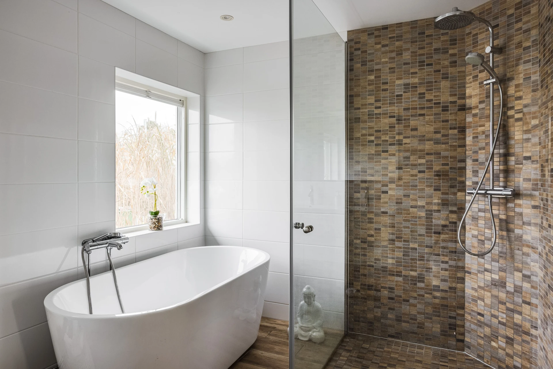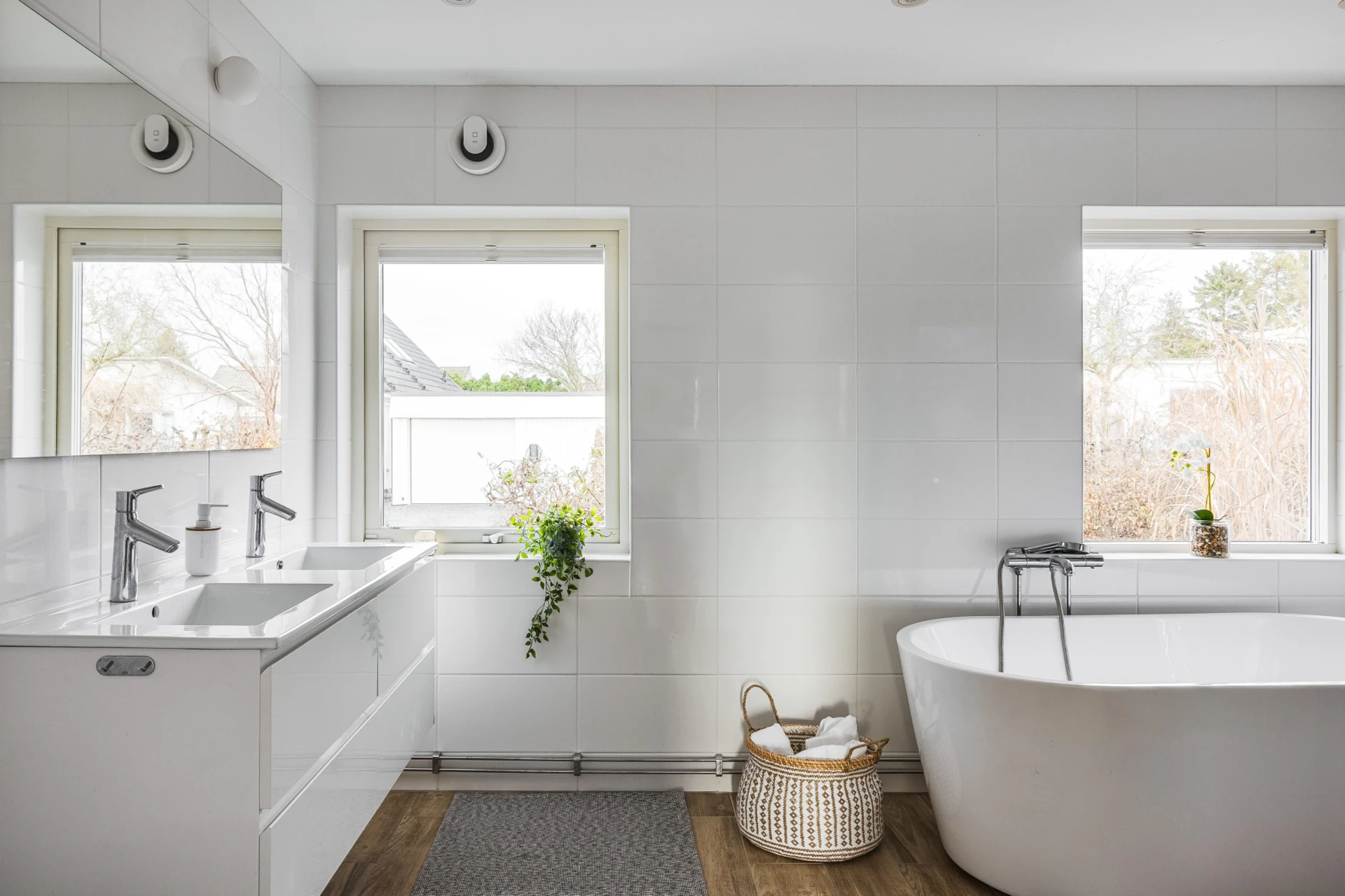Mörkare klinker och vitt kakel. Badrummet är utrustat med wc, badkar, dusch, handfat med kommod, spegel samt spotar i taket.