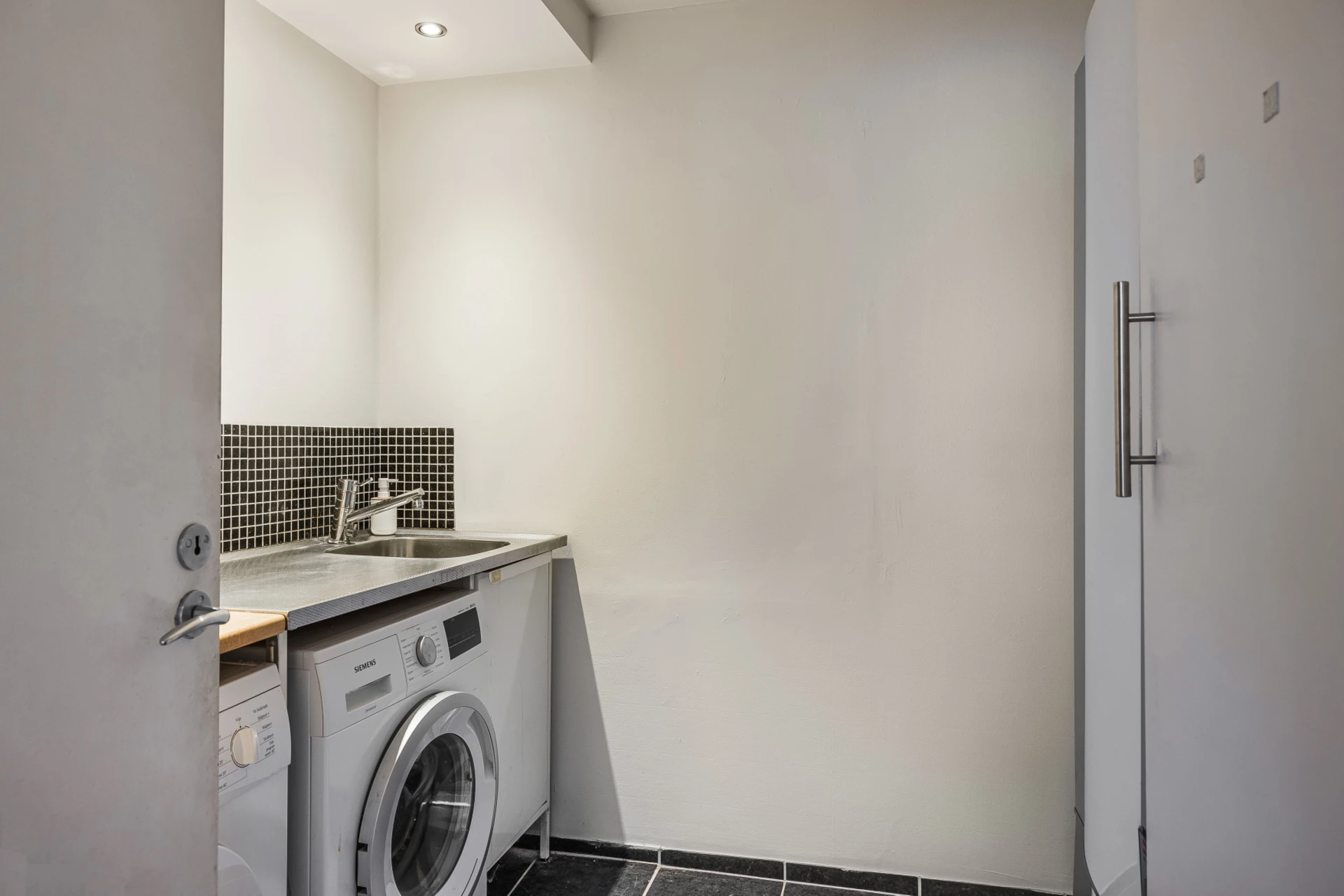 Klinker på golvet och vita väggar. Utrustat med tvättmaskin och torktumlare. Tvättstugan har rostfri bänk och diskho samt spottar i taket.