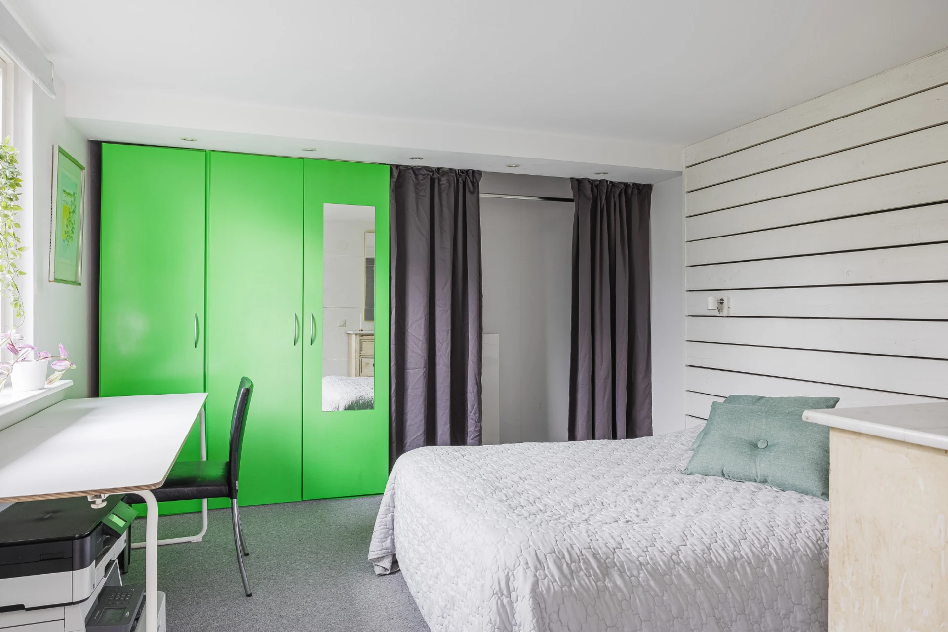 Matta på golvet och vit färg på väggen samt en fondvägg med träpanel.