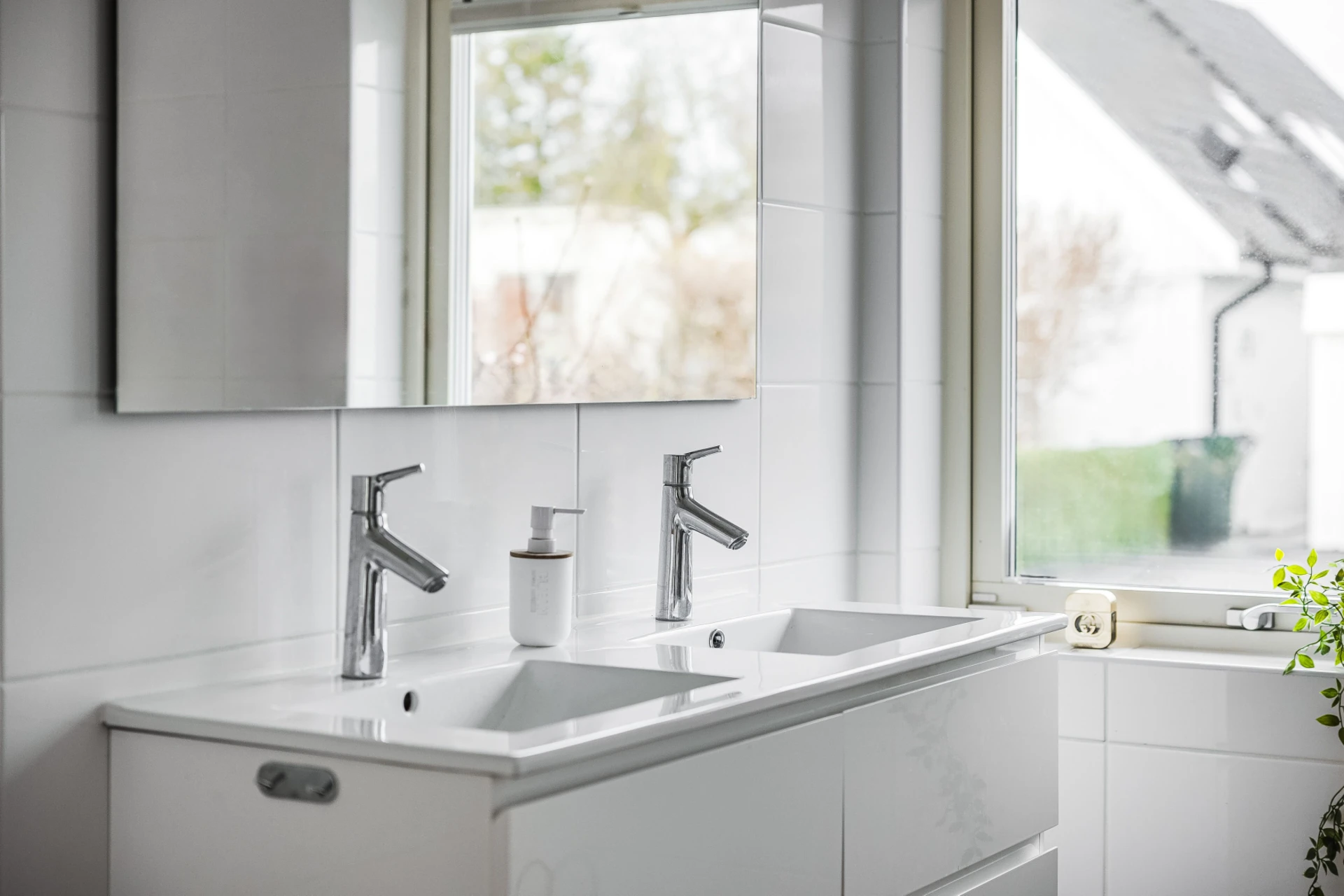 Helkaklad gäst-toa. Gäst-toan är utrustad med wc, handfat med kommod, spegel.