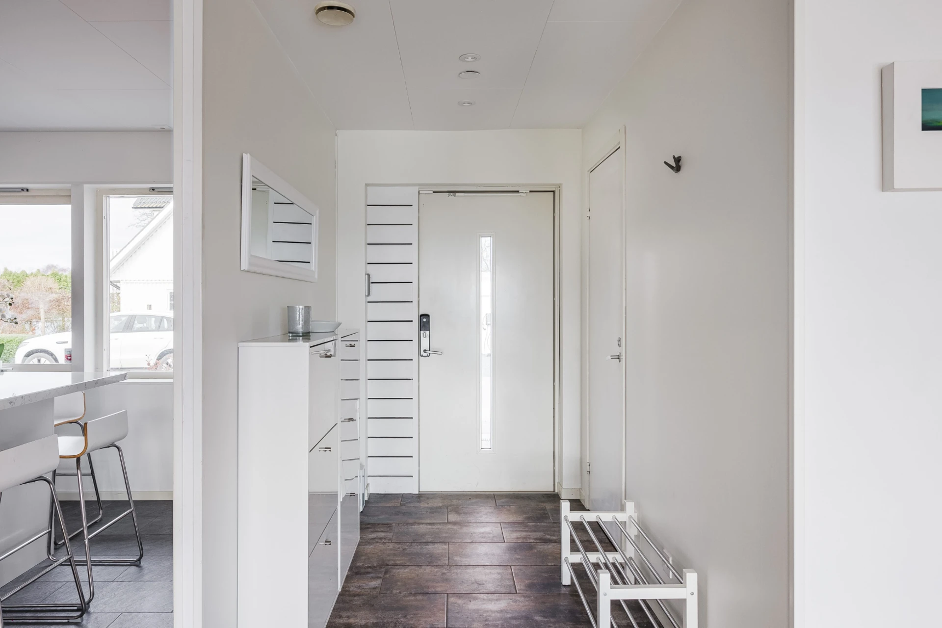 Klinker och vita väggar, plats för avhängning. Ingång till gäst-toa.