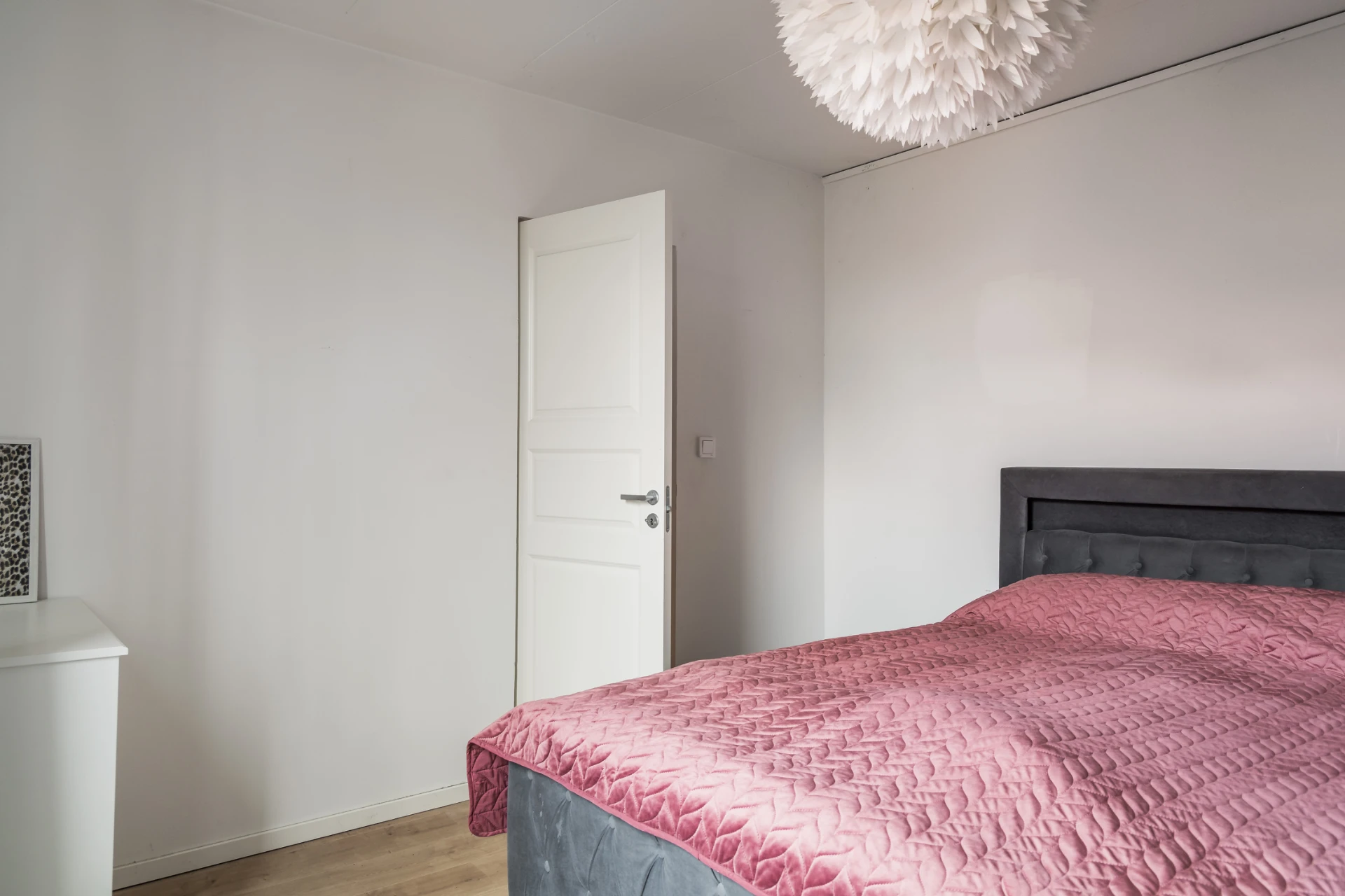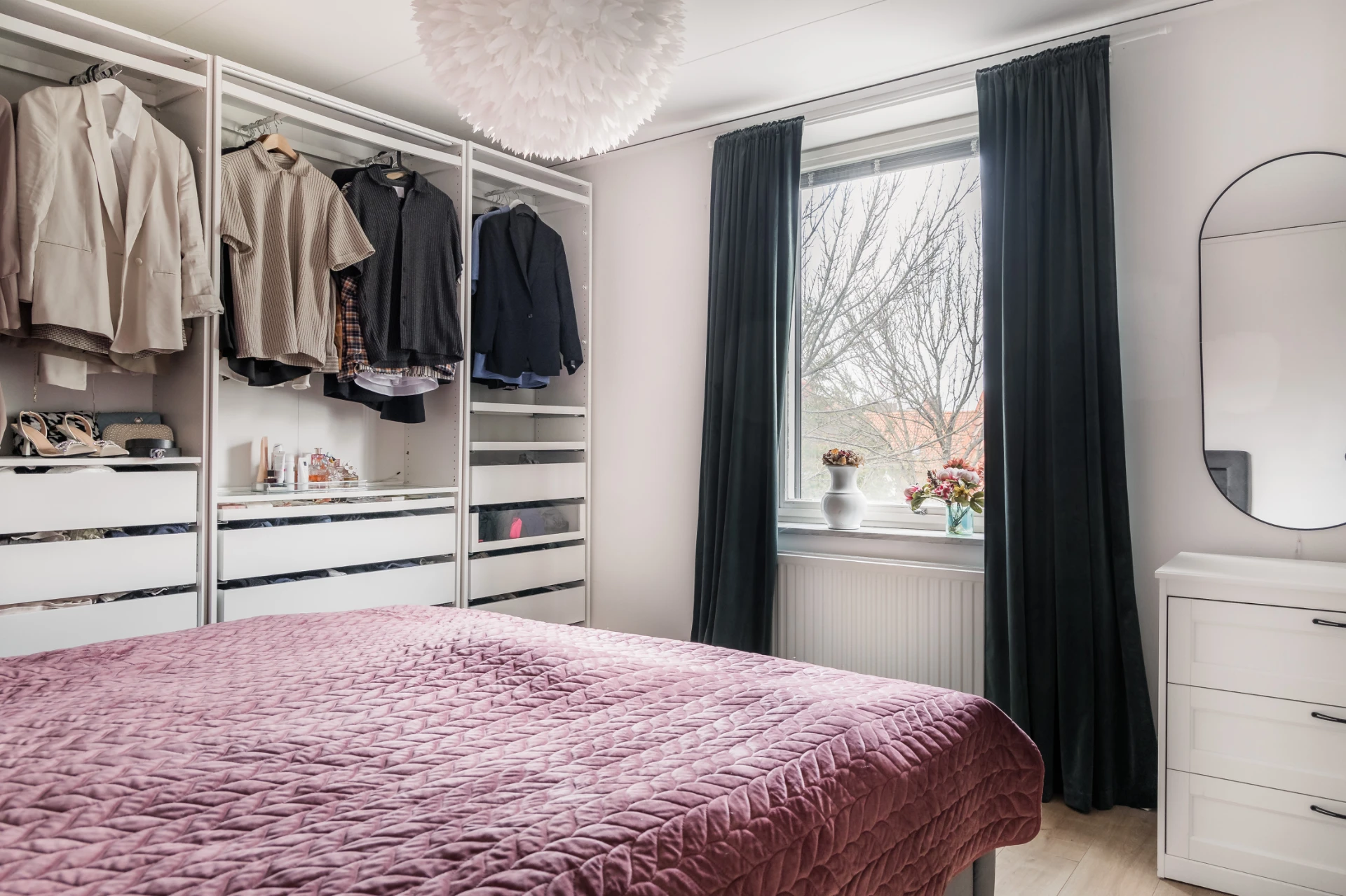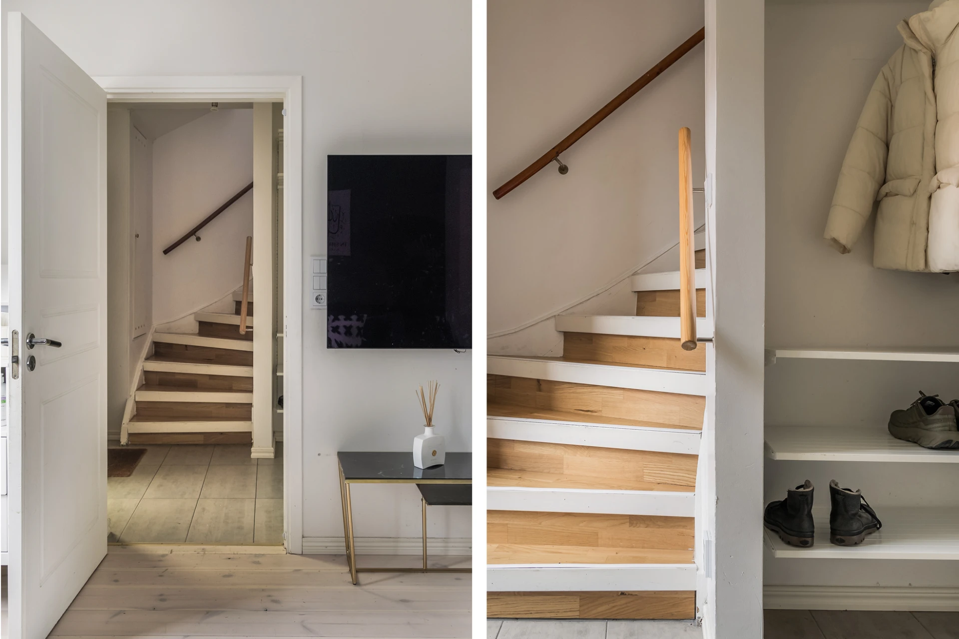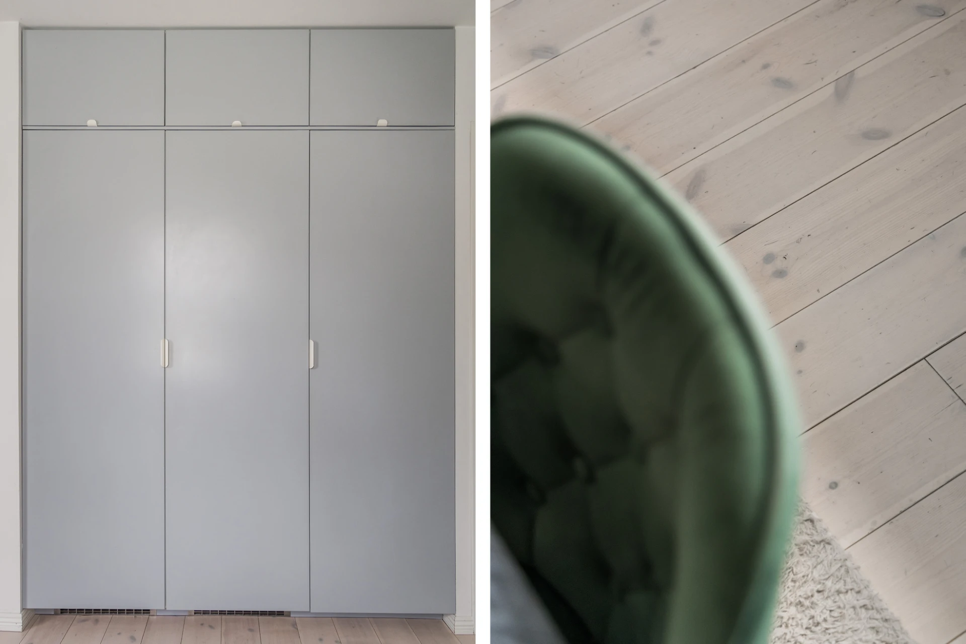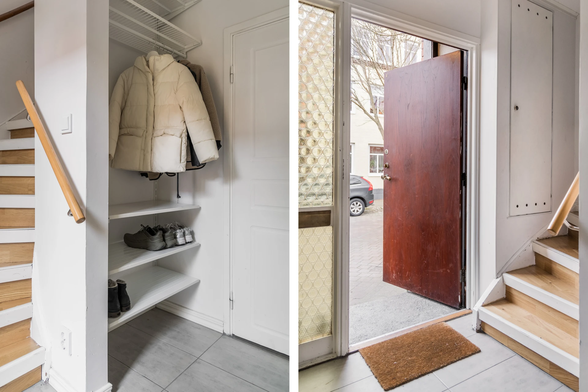 Laminatgolv och vita väggar. Förvaring i ett inbyggt skåp.