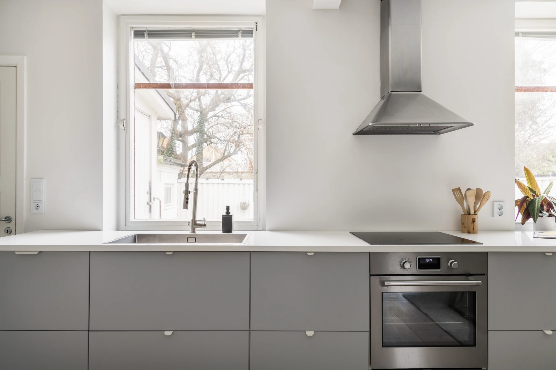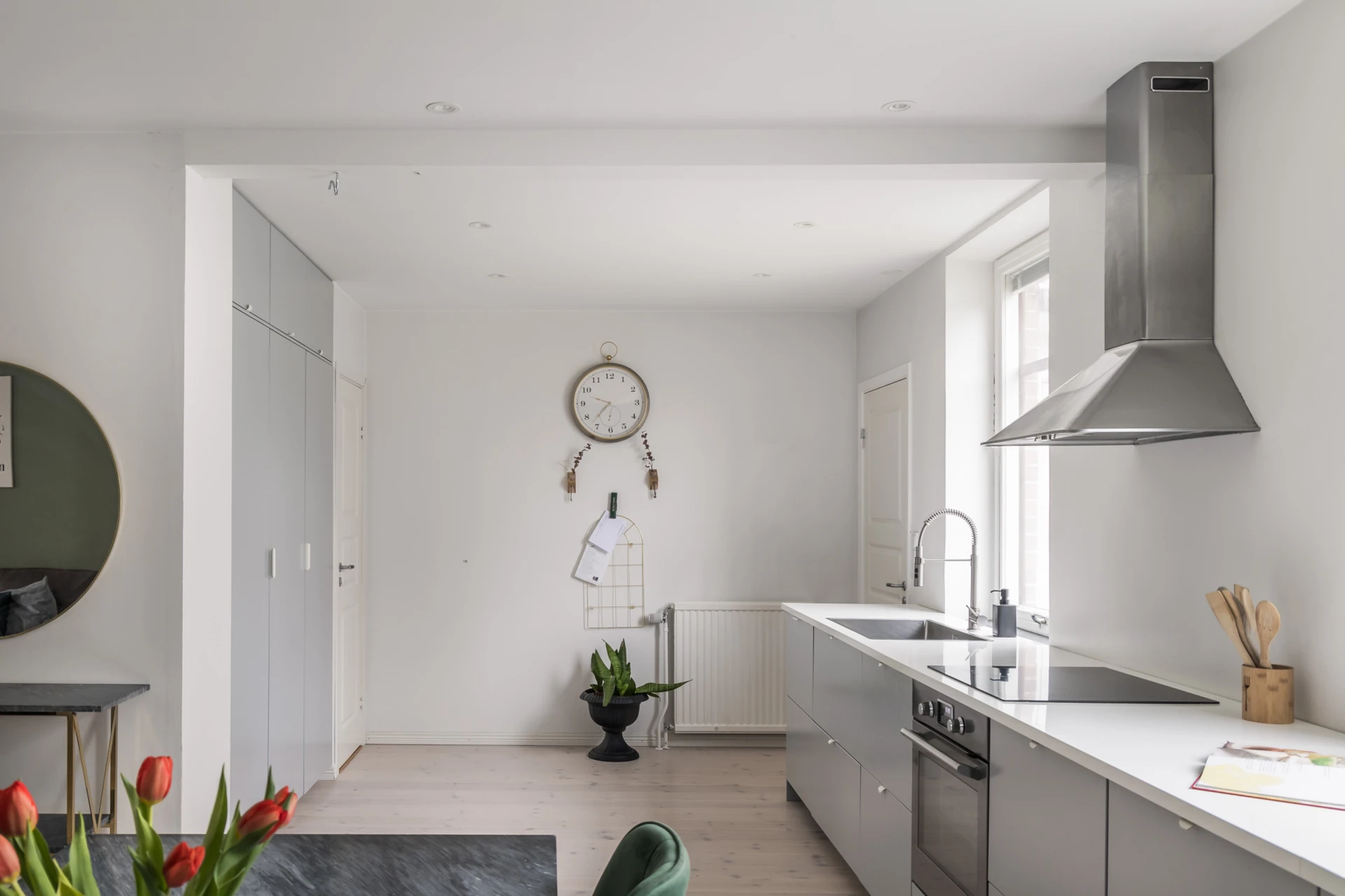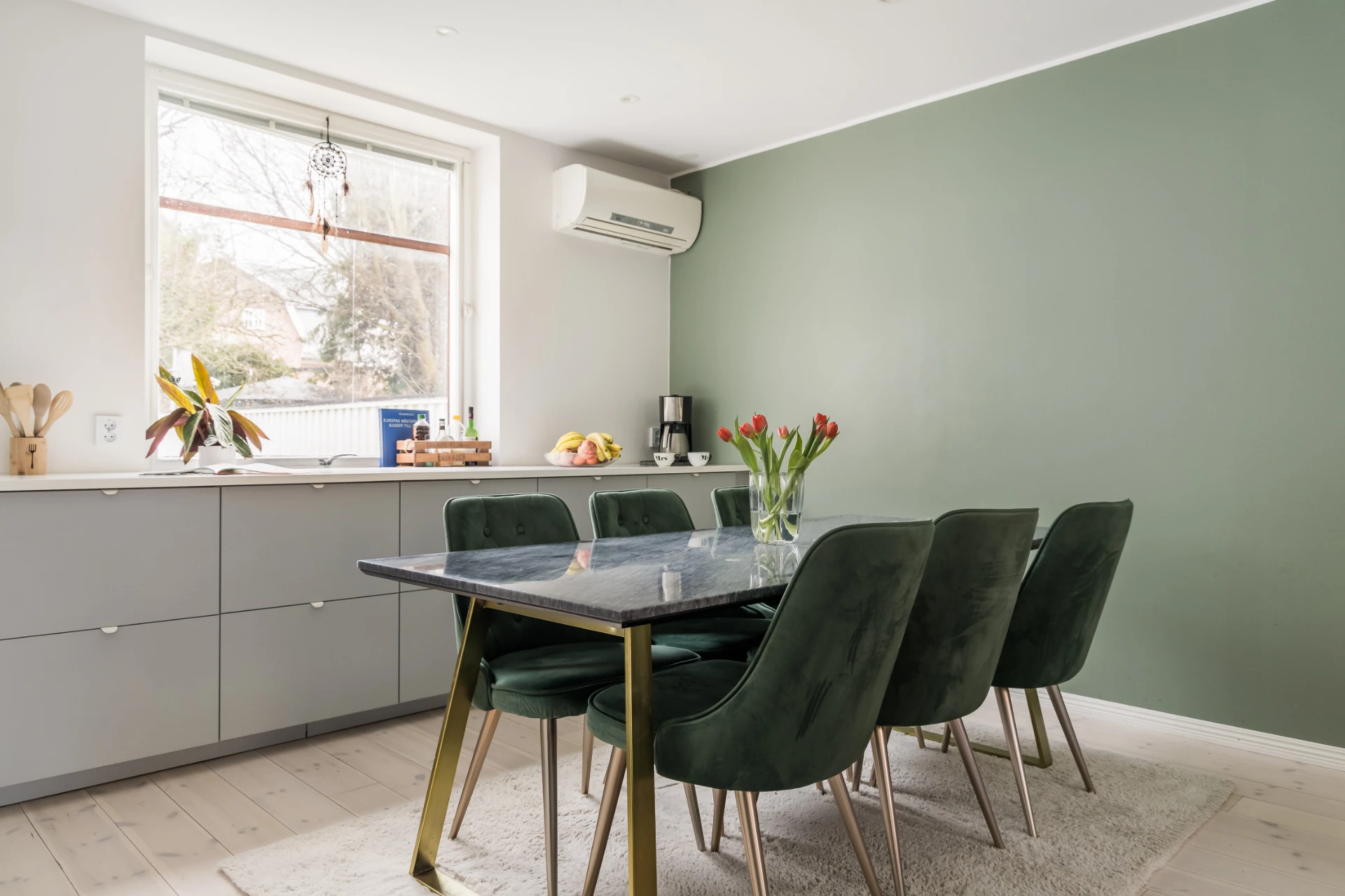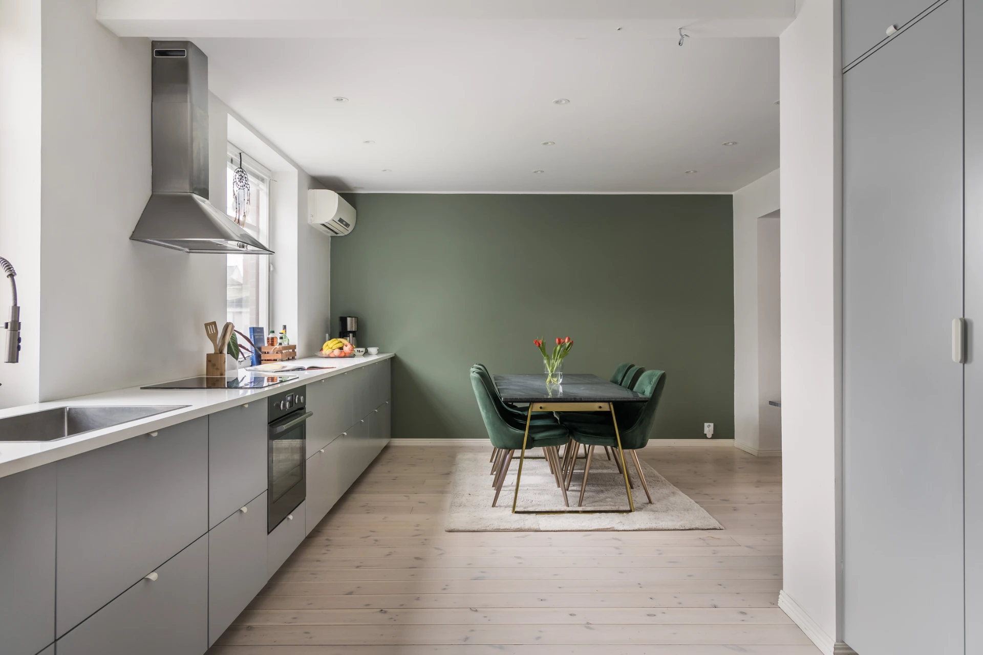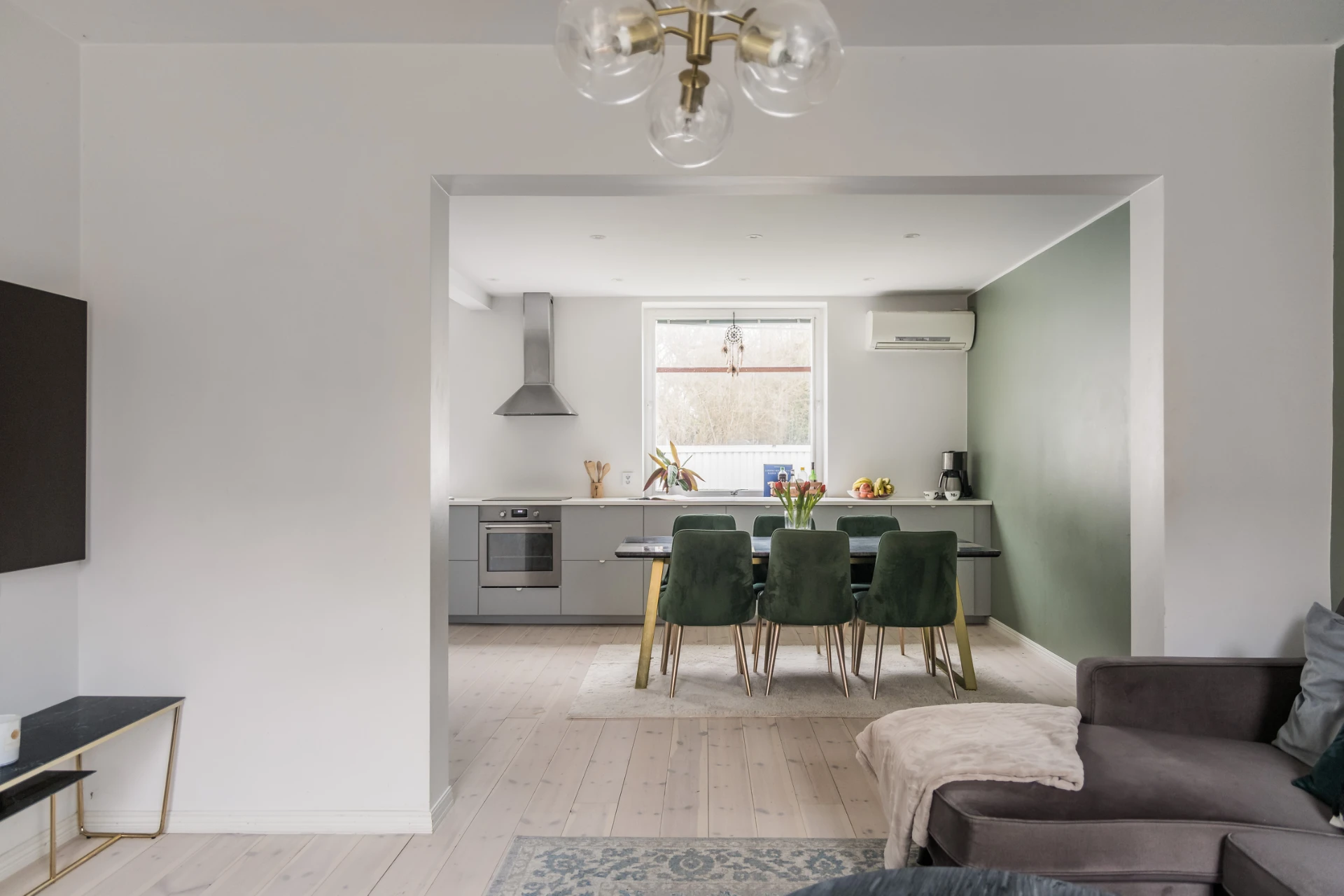 Parkettgolv och vita väggar med en grön fondvägg. Ljusgrå köksinredning med vit bänkskiva. Utrustat med integrerad kyl och frys, spishäll, ugn, fläkt och integrerad diskmaskin. Plats för matbord. Ingång till skafferi och utgång till trädgård.
