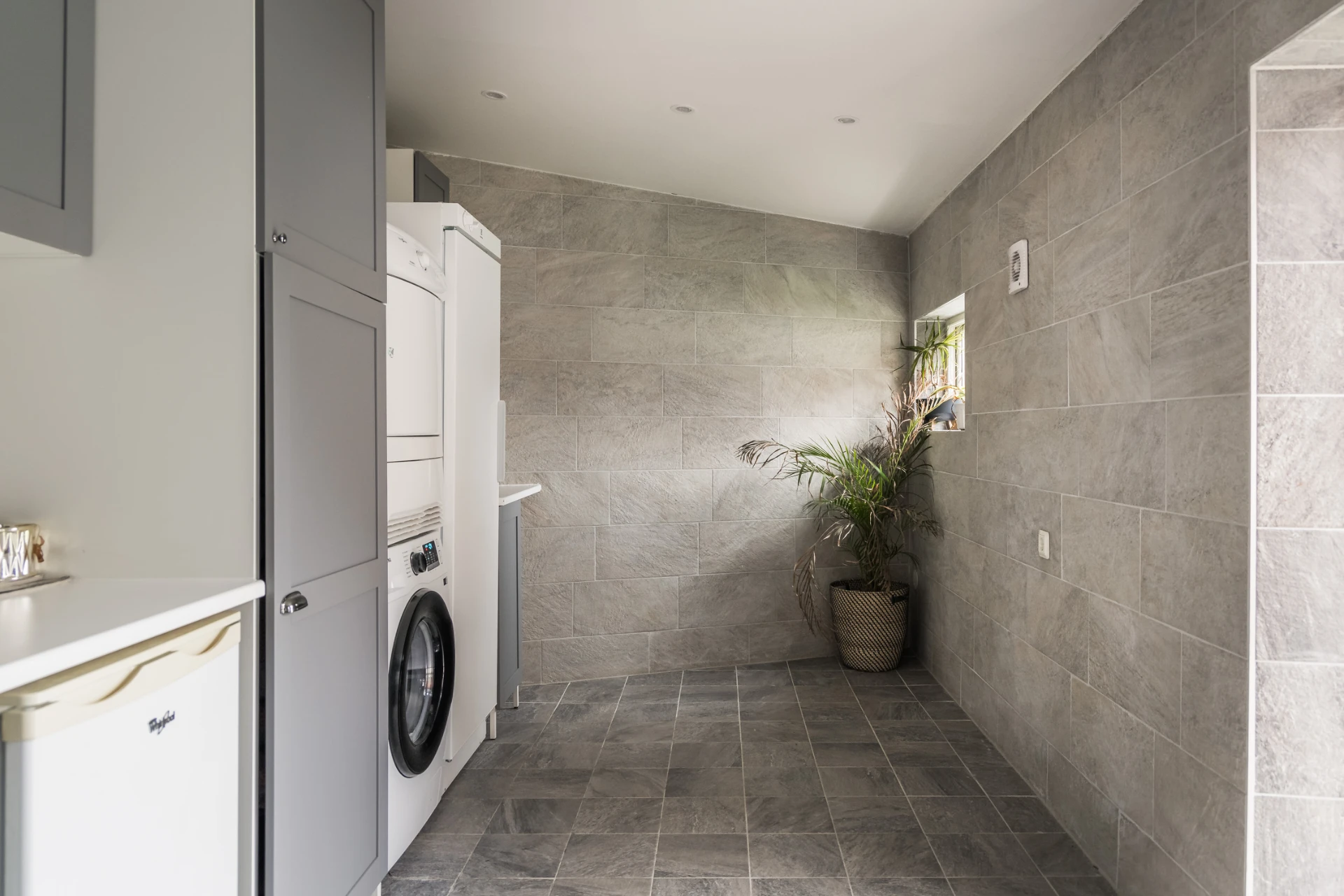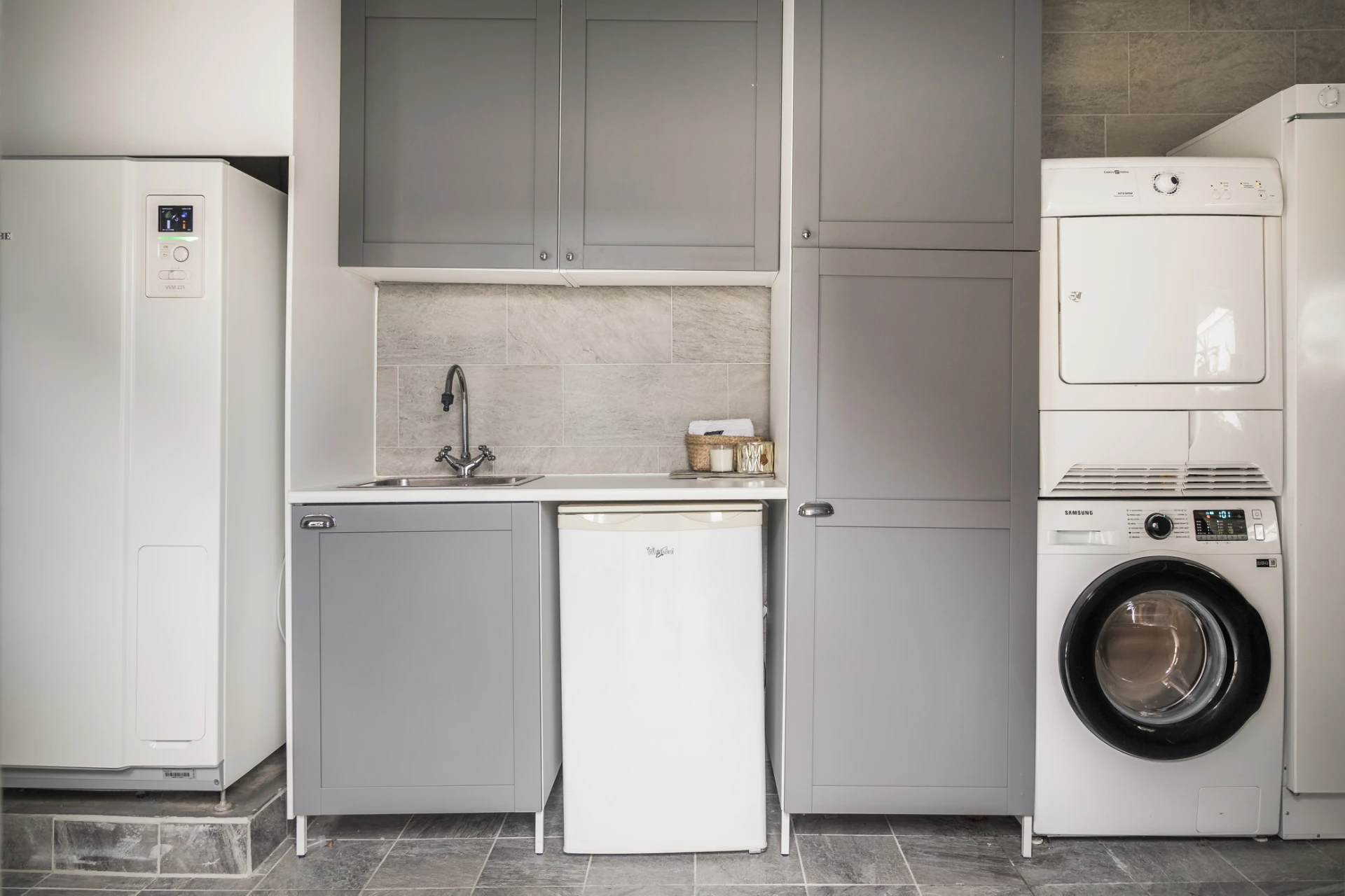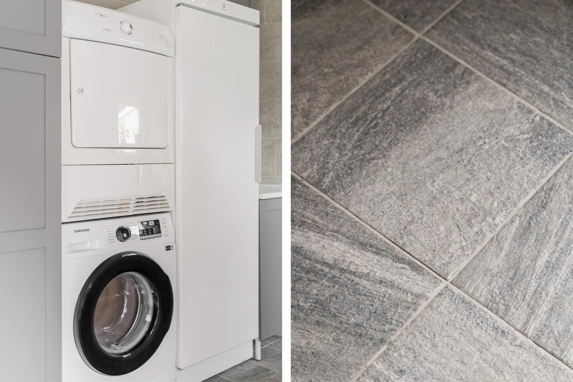 Grå klinker på golv och väggar. Infällda spotlights i tak. Utrustad med grå skåpsinredning, vask, arbetsbänk, tvättmaskin och torktumlare i pelare, torkskåp och värmepump (Nibe 2021).