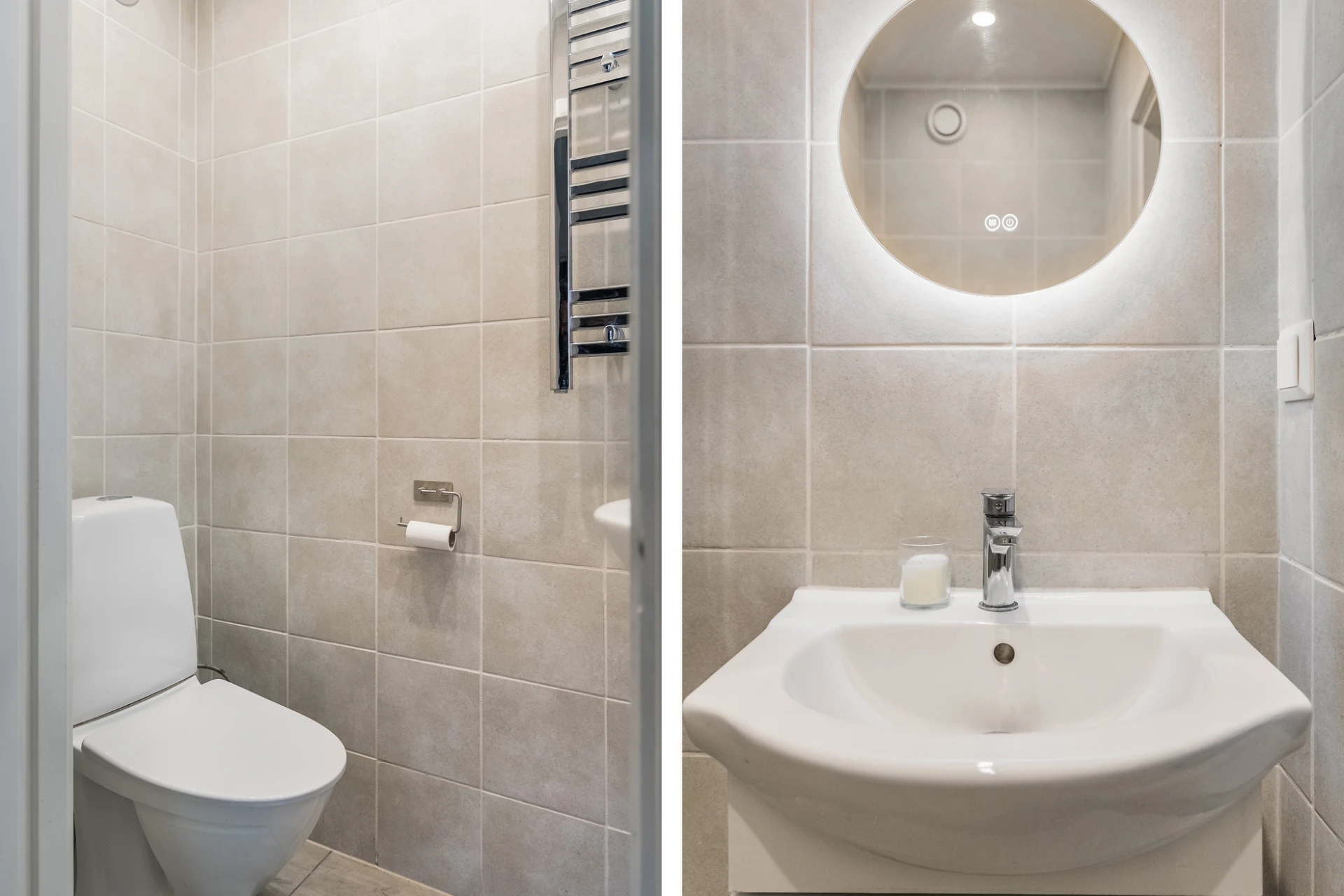 Ljus klinker och kakel. Utrustad med wc, handfat med underskåp, rund spegel med belysning och handdukstork. Elburen golvvärme.